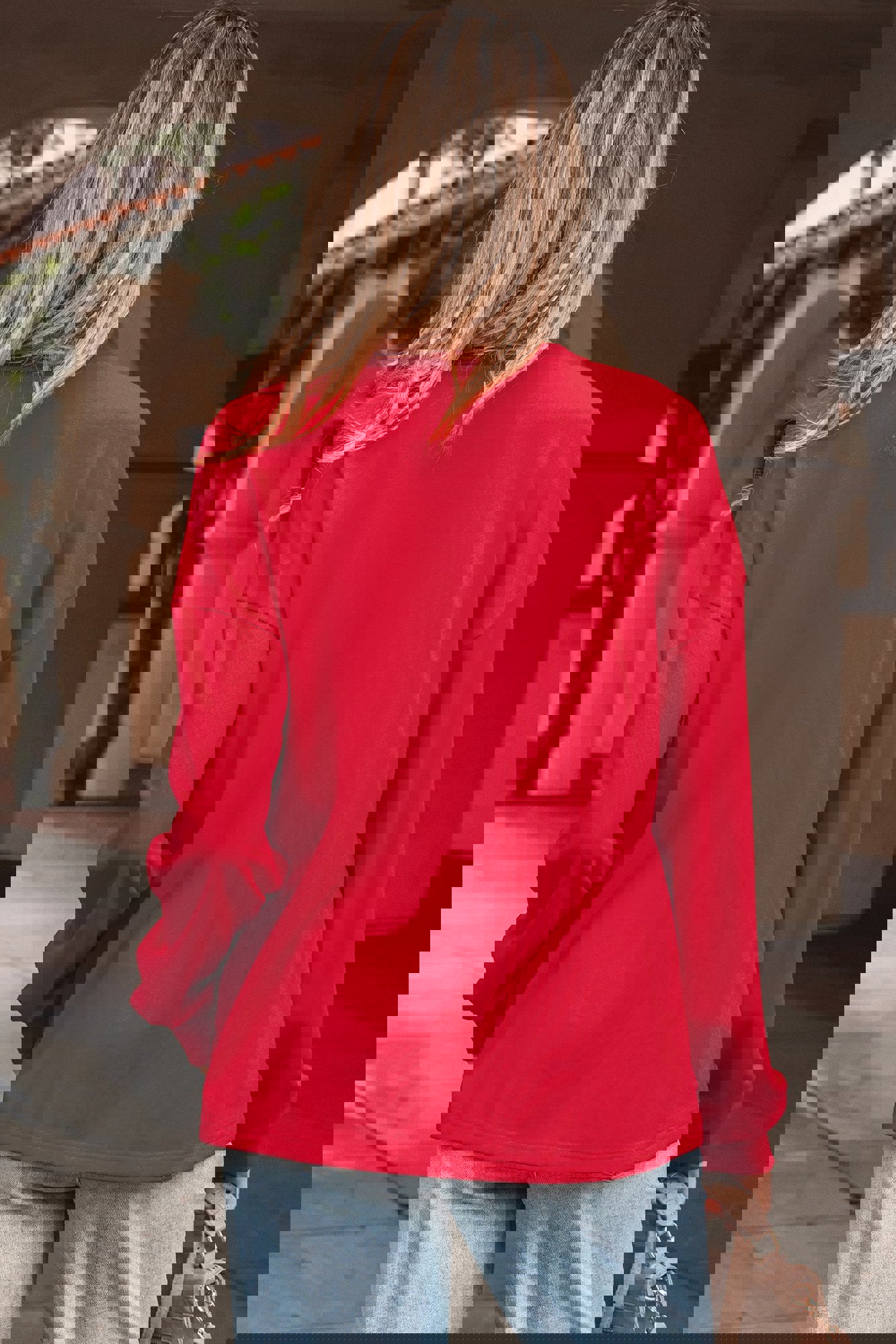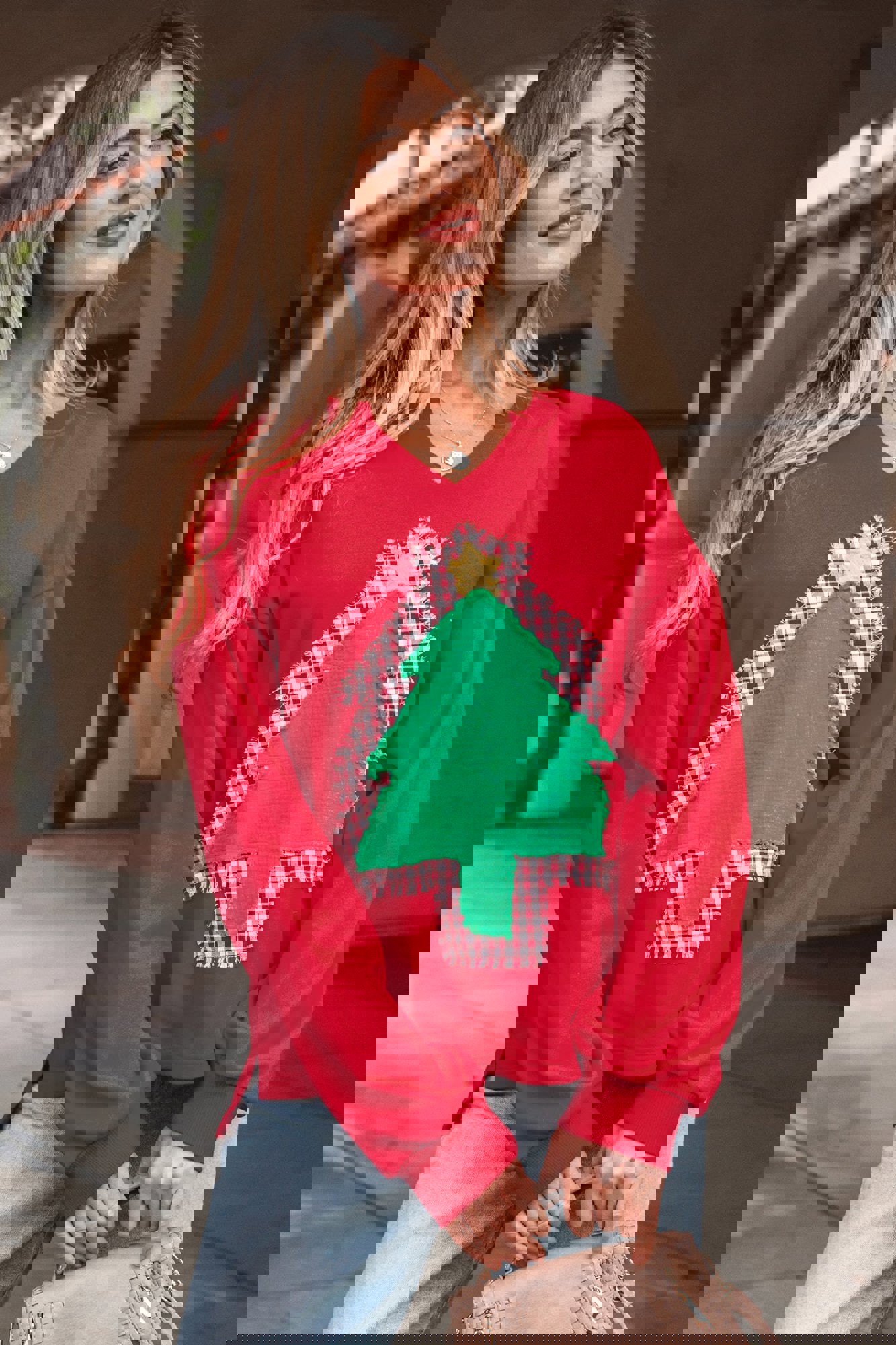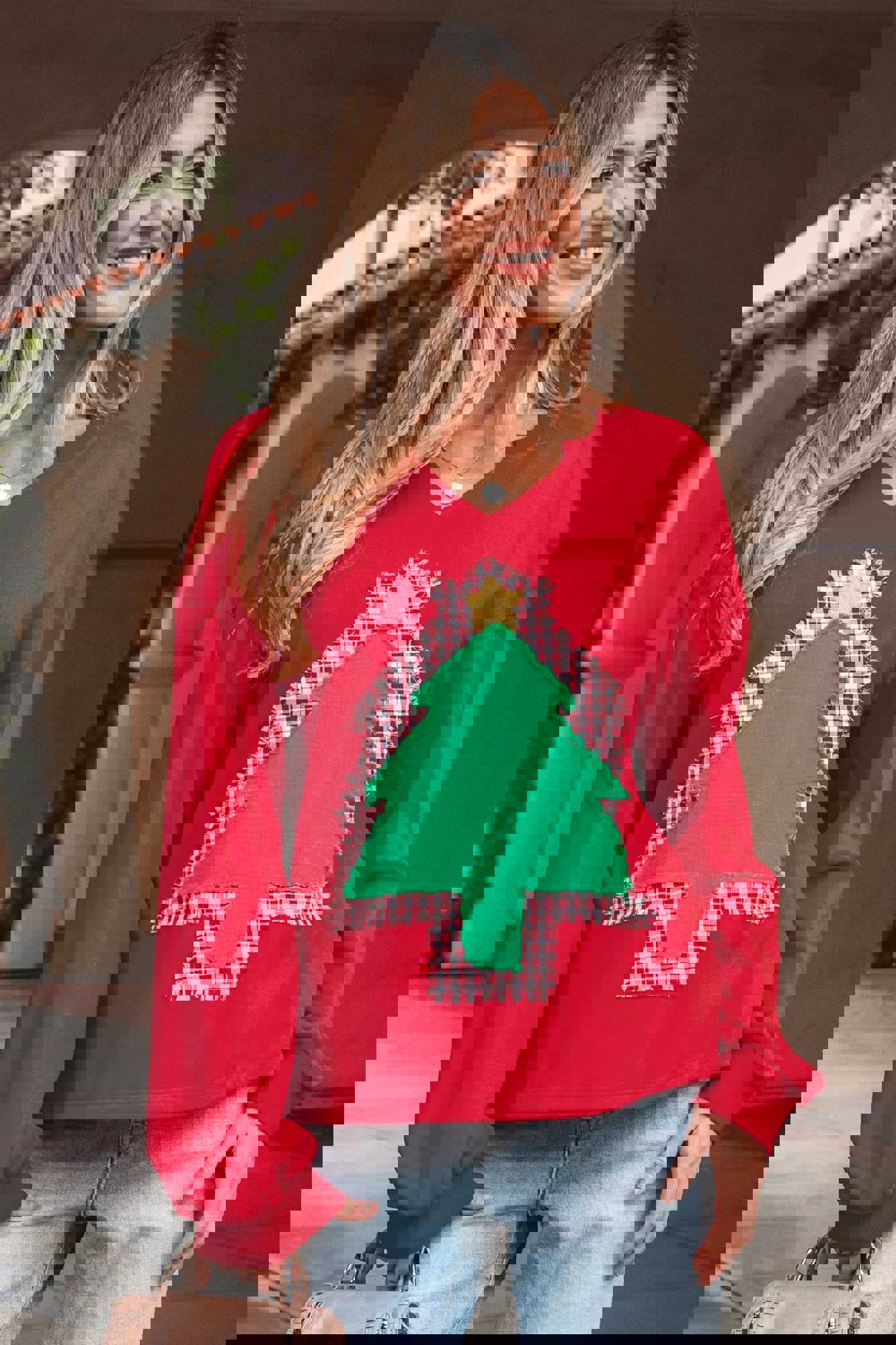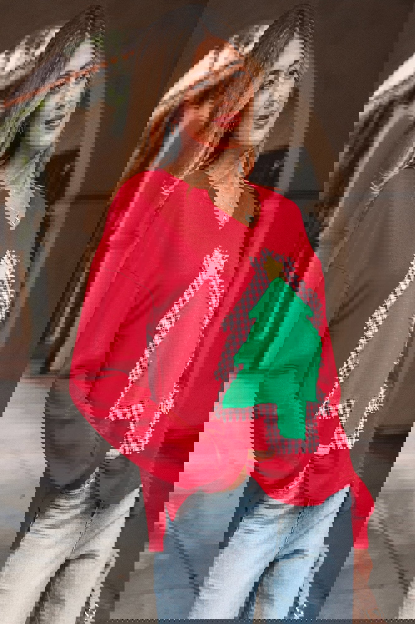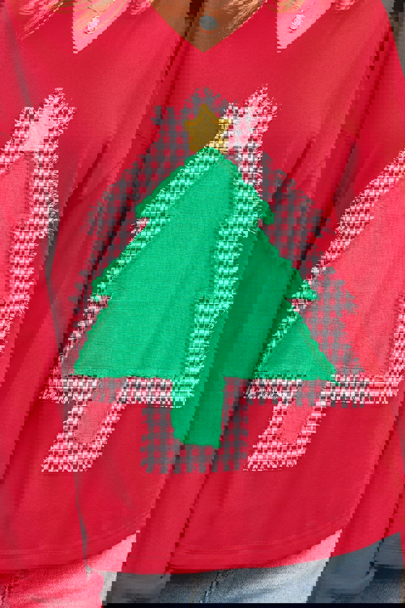 Celebrate the season in style with this cheerful graphic sweatshirt, spotlighting gingham plaid and crinkled gauze Christmas tree patches with a frayed edge on the front. Stay comfy this season with a notched neckline, drop shoulders and long sleeves. Crafted from soft, cozy cotton-blend fabric, it’s a comfy festive fave and a perfect gift for women of all ages! Polyester/Cotton