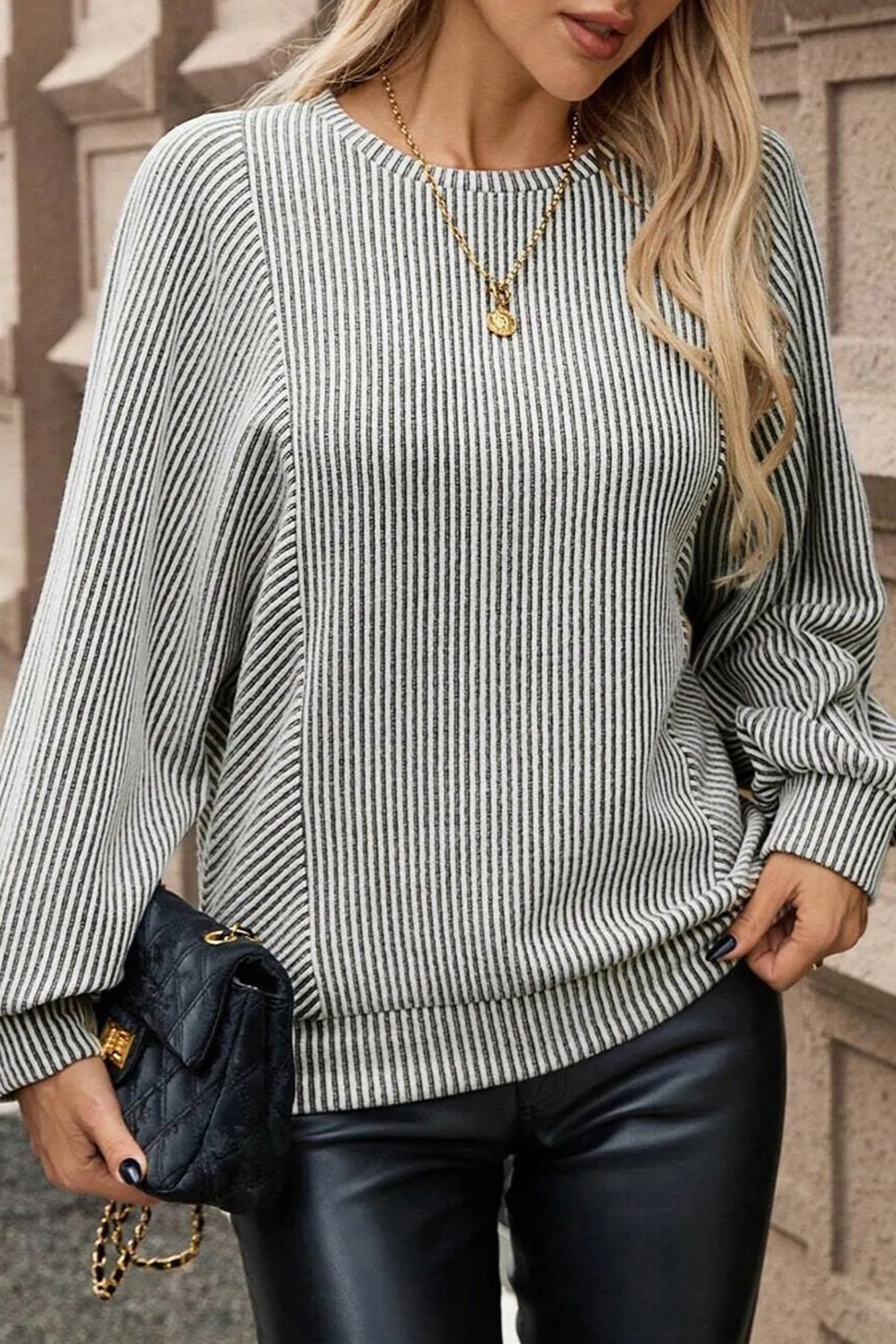 HIDDEN GEMS | Ribbed Knit Round Neck Lantern Sleeve Top
