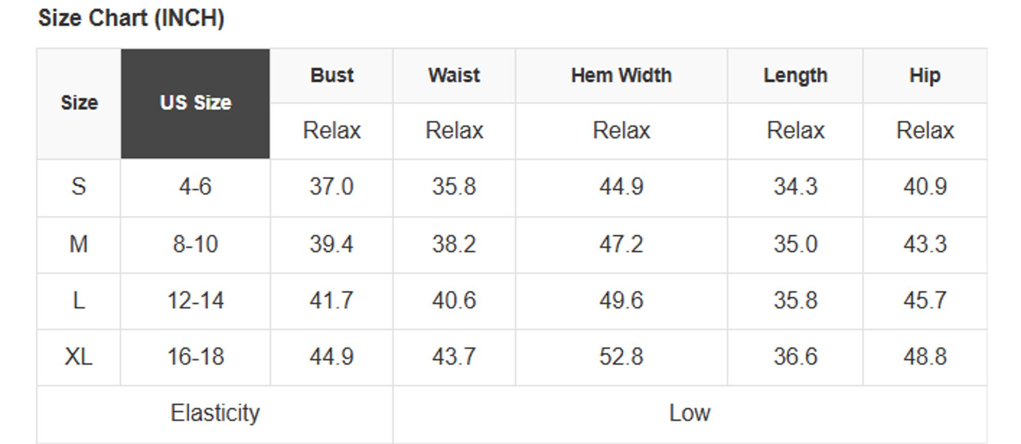 Small fits US 0-4, Medium 6-8, Large 10-12, XL 14-16, and 2X 18-20