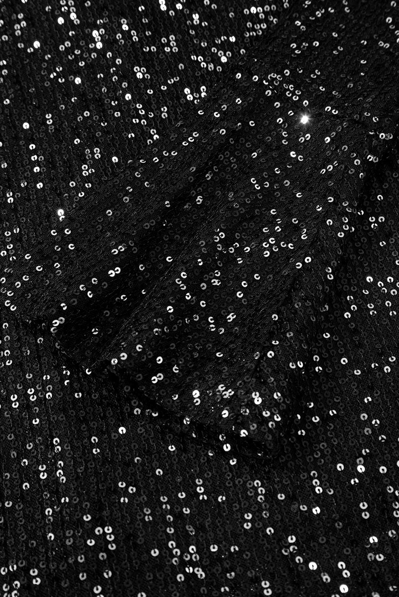 Make a statement in this top, designed to captivate with shimmering sequins and an alluring drape open back. The mock halter neckline secures with a button for a polished finish, while long sleeves with bell cuffs add a sophisticated, dramatic flair. Its flattering fit ensures an elegant silhouette, perfect for standing out at any event. Polyester/Spandex