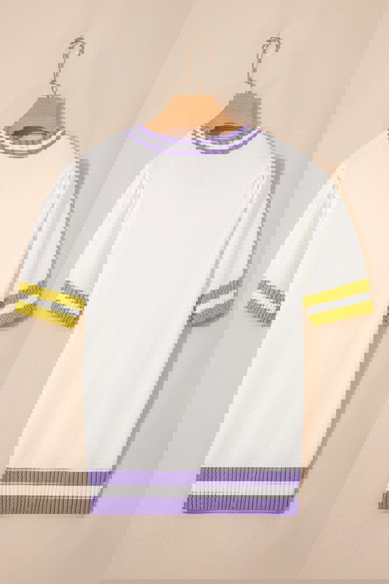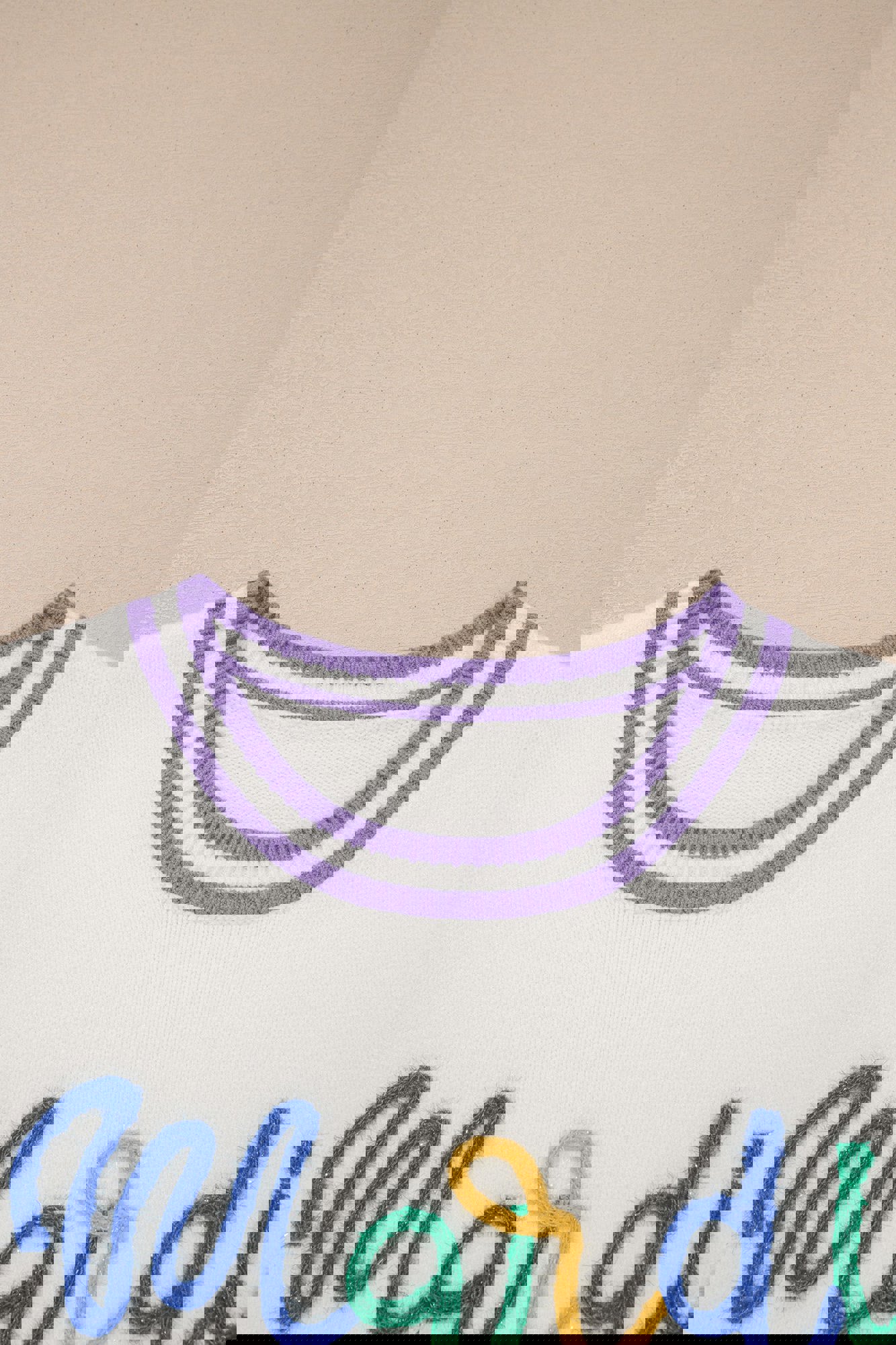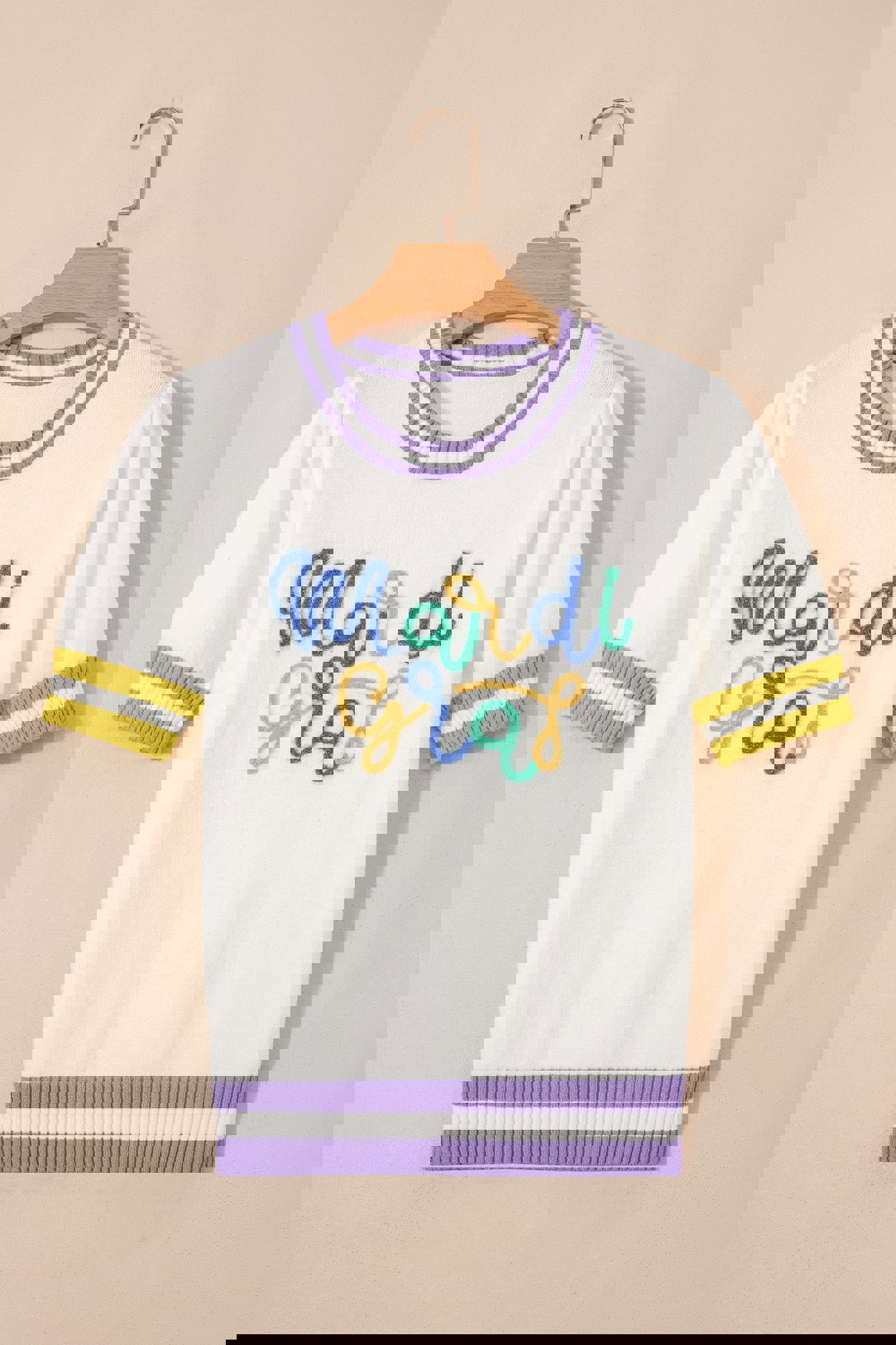 Celebrate in style with this sweater! Sparkling tinsel lettering brings festive flair to your party wardrobe, while the fun Mardi Gras theme makes a bold statement at any celebration. The comfortable short sleeves are perfect for layering during the season or wearing solo to casual gatherings. Whether you're heading to a masquerade bash or just embracing the holiday spirit, this knitted top delivers playful personality with eye-catching shine. Viscose/Polyester/Poly