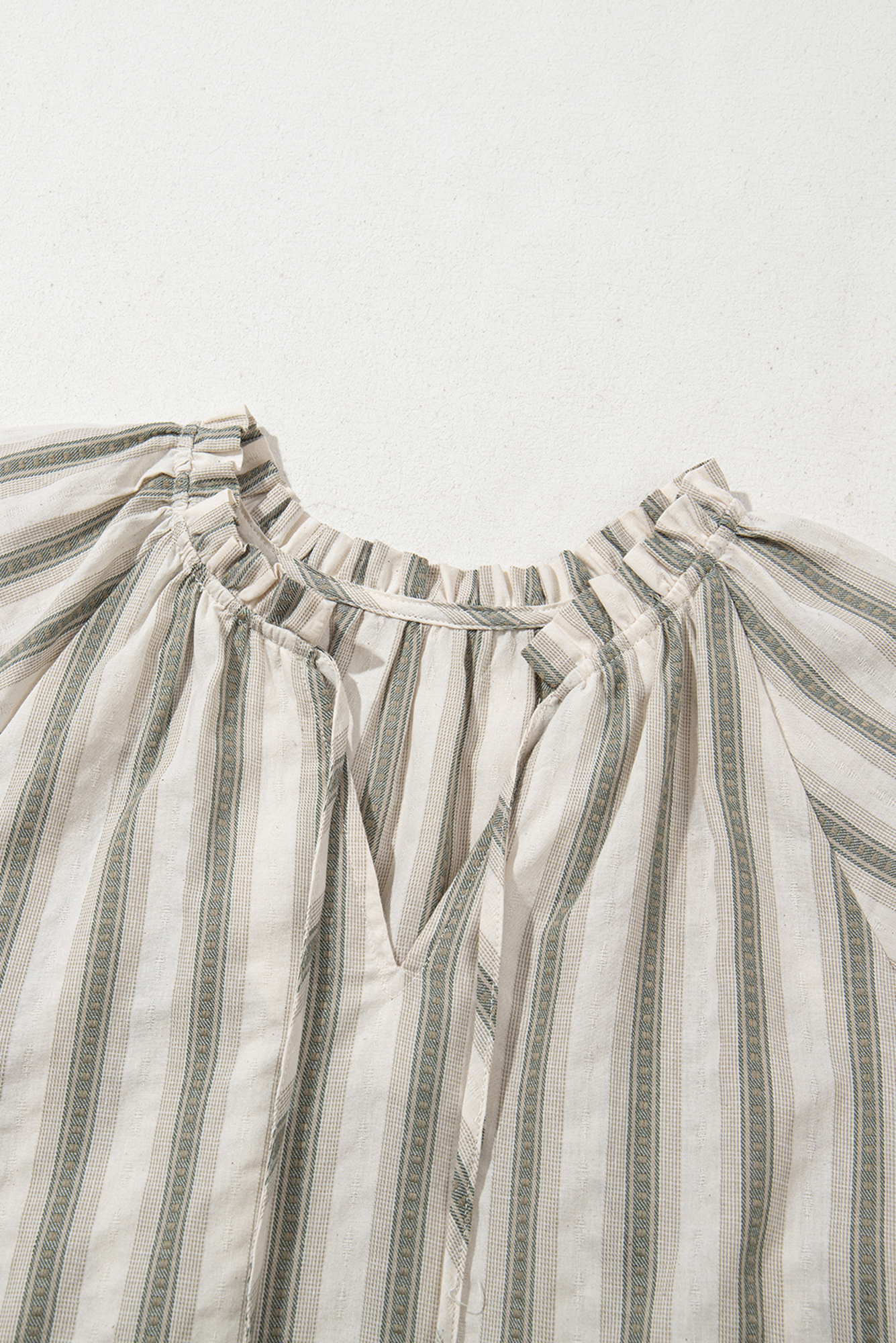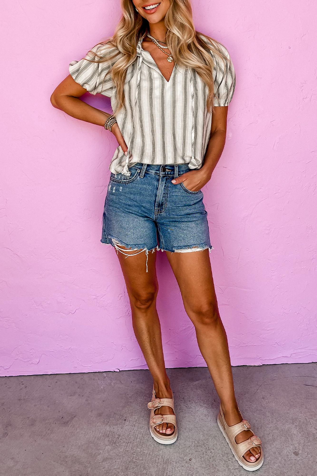 Stripes never go out of style—and this charming short sleeve top proves it! The ruffled V-neckline with a playful front tie adds instant personality, while the puff sleeves with elastic cuffs keep things fun and flirty. Slip it on with your favorite jeans or cotton pants for an effortless casual look that works from morning coffee to weekend adventures. Simple, stylish, and ready to become a wardrobe favorite. 100% Cotton