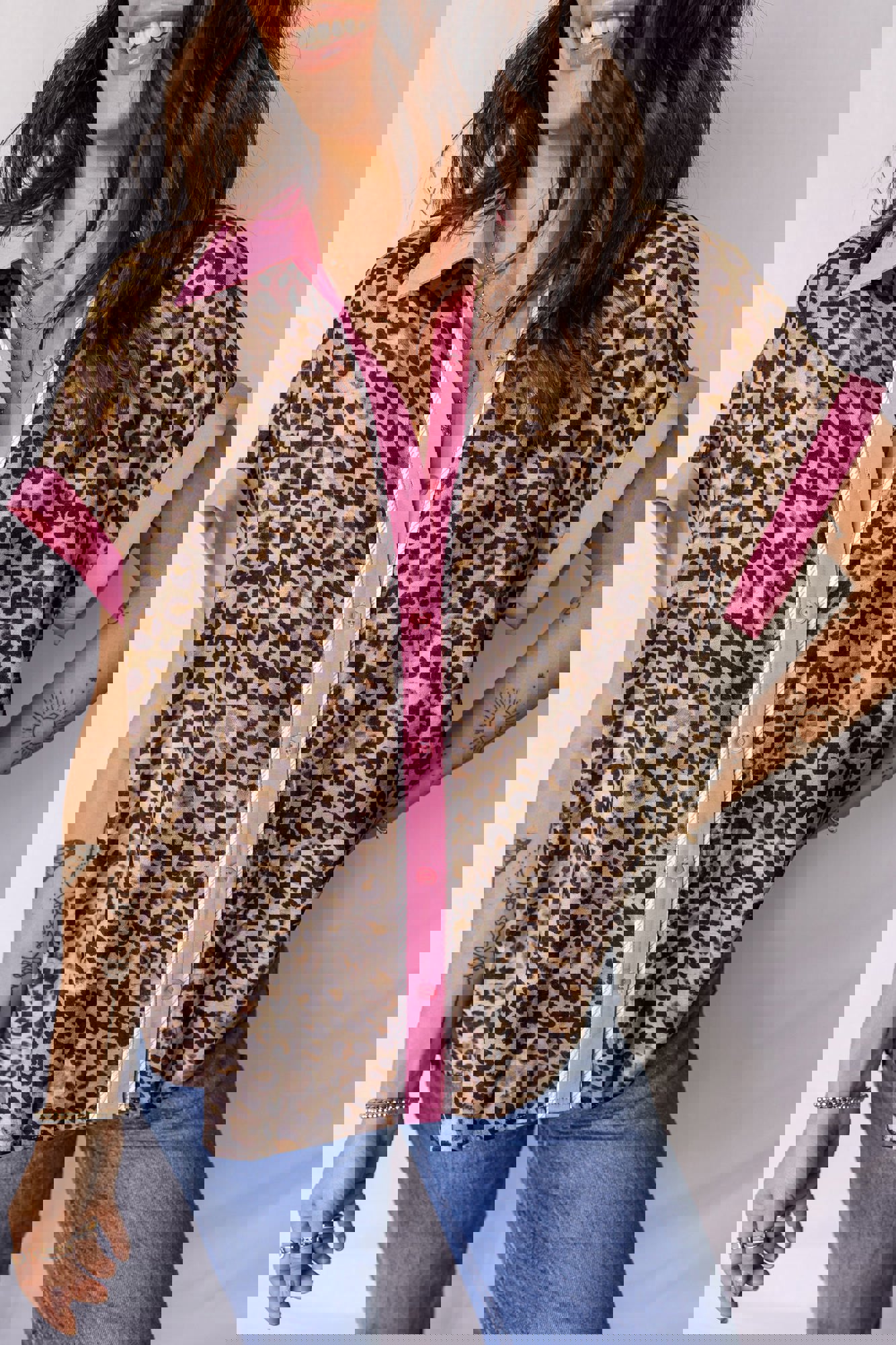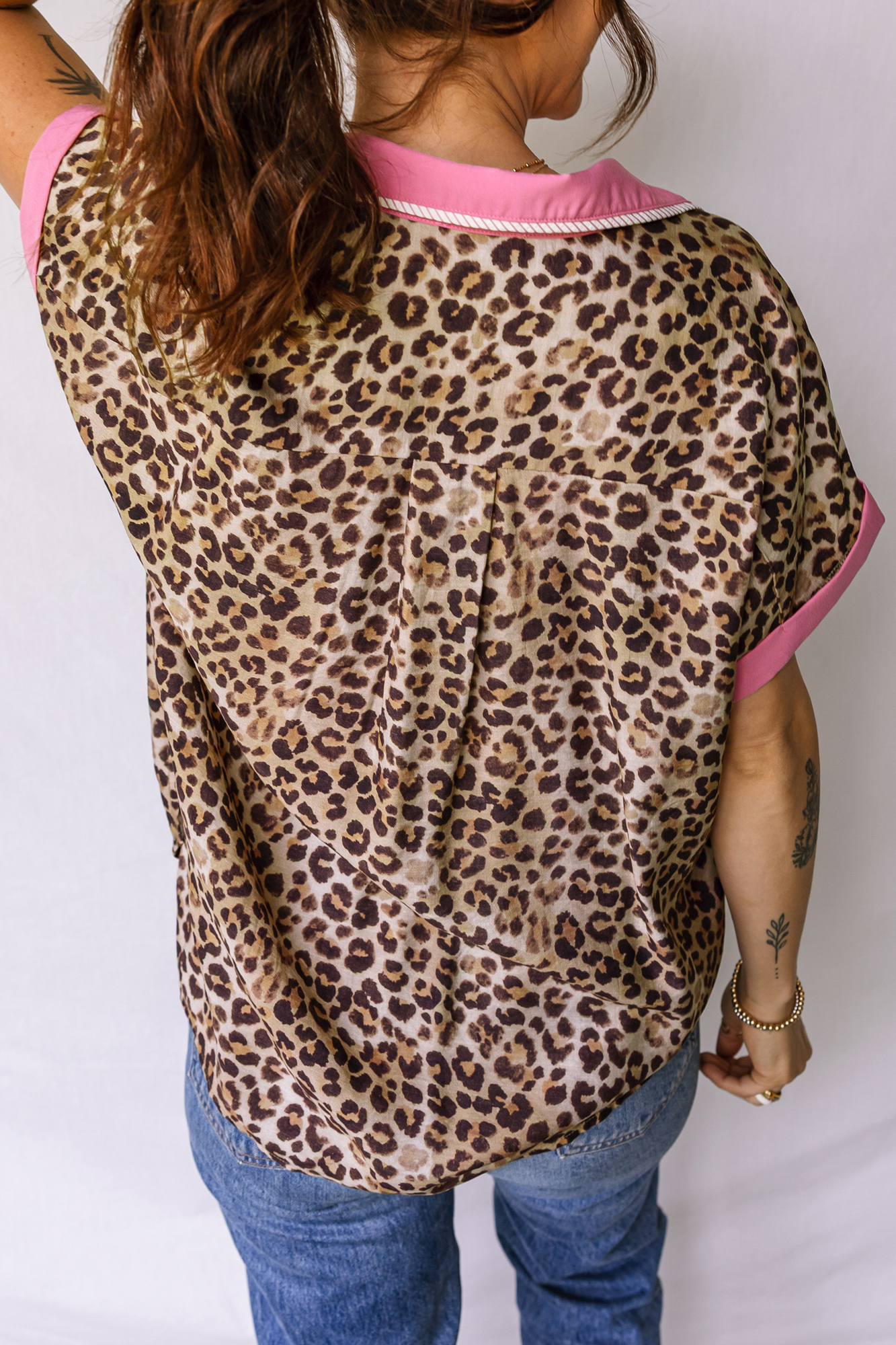 Unleash your wild side with this leopard print short sleeve shirt that's all about carefree summer vibes. The contrasting trim pops with color, while the loose, flattering fit works beautifully on any body shape. Complete with a classic collar and easy button-front closure, it's the perfect piece for anyone ready to embrace their inner fashionista with a touch of untamed flair. Viscose/Poly