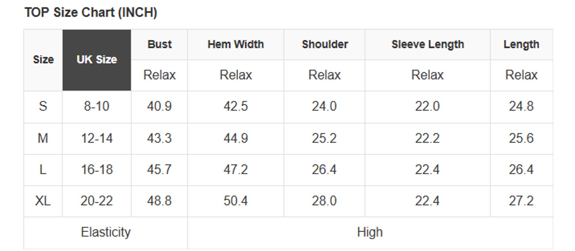 See size chart for approximate measurements