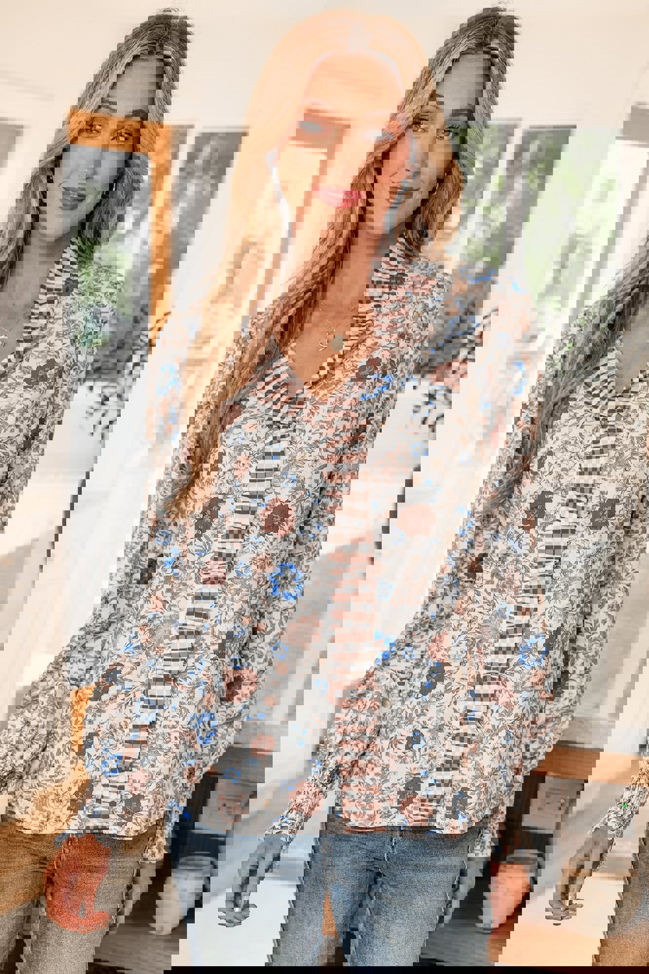 Elevate your fall wardrobe with this charming floral blouse that perfectly blends botanical beauty with modern edge. The plaid frilled trim adds a playful pop of contrast, while the flattering V-neckline showcases your collarbones and frames your face beautifully. Wrapped in a timeless floral pattern that brings visual interest to any outfit, the long sleeves deliver elegant coverage without sacrificing breathability. Whether you're dressing up for brunch or keeping it casual, this blouse is your go-to piece for effortless style. Cotton/Viscose