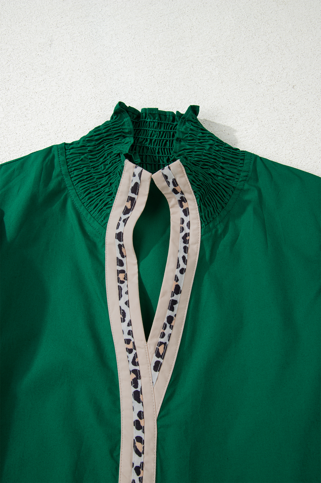 This sophisticated blouse seamlessly transitions from casual to formal settings with its expertly designed silhouette. The loose fit creates a flattering, streamlined appearance while the dramatic sleeves add an undeniable touch of feminine elegance. A striking neckline framed with leopard trim serves as a refined focal point, elevating the piece with subtle animal-print sophistication. The thoughtful construction balances comfort with style, making it an essential addition to any versatile wardrobe. 100% Cotton