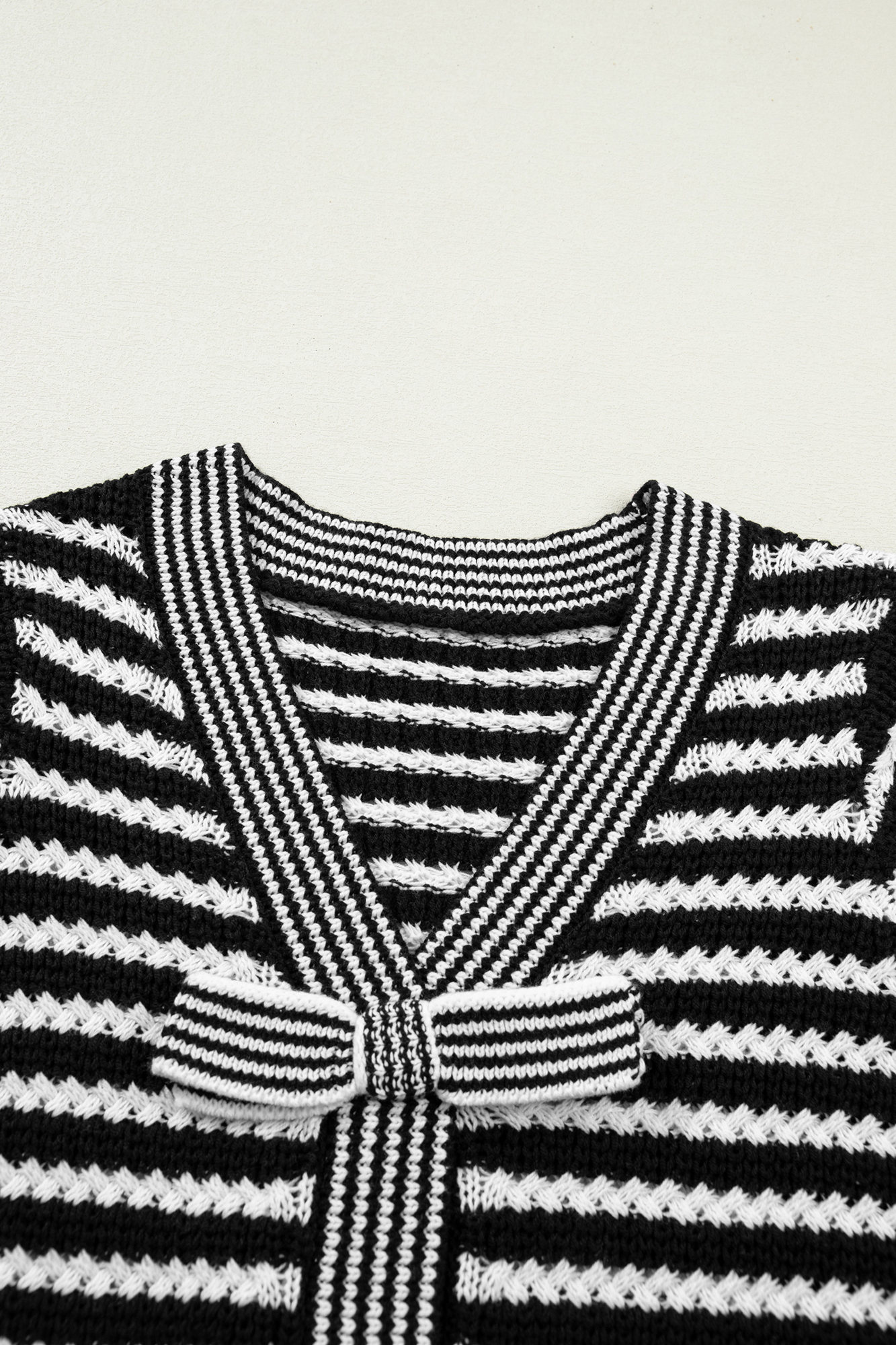 Wrap yourself in effortless style with this charming knit sweater! Crafted from soft, cozy fabric, it's your go-to piece for all-day comfort. The classic striped pattern brings timeless appeal, while the flattering V-neck and adorable bow knot detail add a touch of playful femininity. Perfect for casual outings or relaxed weekends, this short sleeve beauty pairs seamlessly with your favorite jeans or skirts. Simple, sweet, and undeniably chic. Cotton/Acrylic