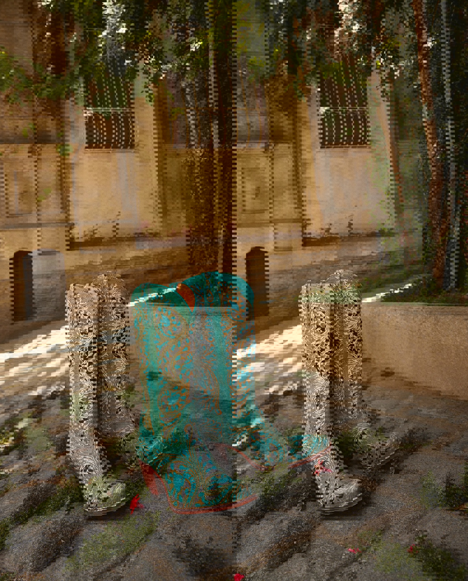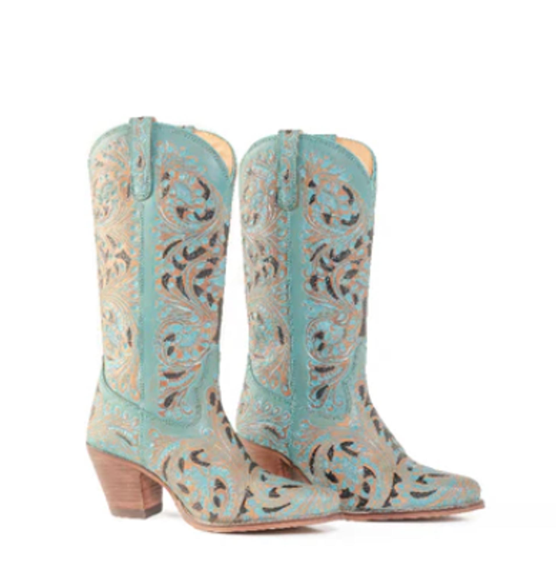 Introducing these stunning hand-tooled leather boots - they're a must-have addition to your Western-inspired wardrobe! Expertly crafted, these boots showcase an exquisite turquoise hue that's sure to turn heads. The intricate hand-tooled design features swirling floral patterns that definitely evoke the romance of the Old West. The pointed toe and stacked heel provide a classic cowboy boot silhouette. Side pulls assure easy on and off. Pair them with your favorite sundress for a chic summer look or wear them with jeans and a denim jacket for a true Western vibe. Magnificent!