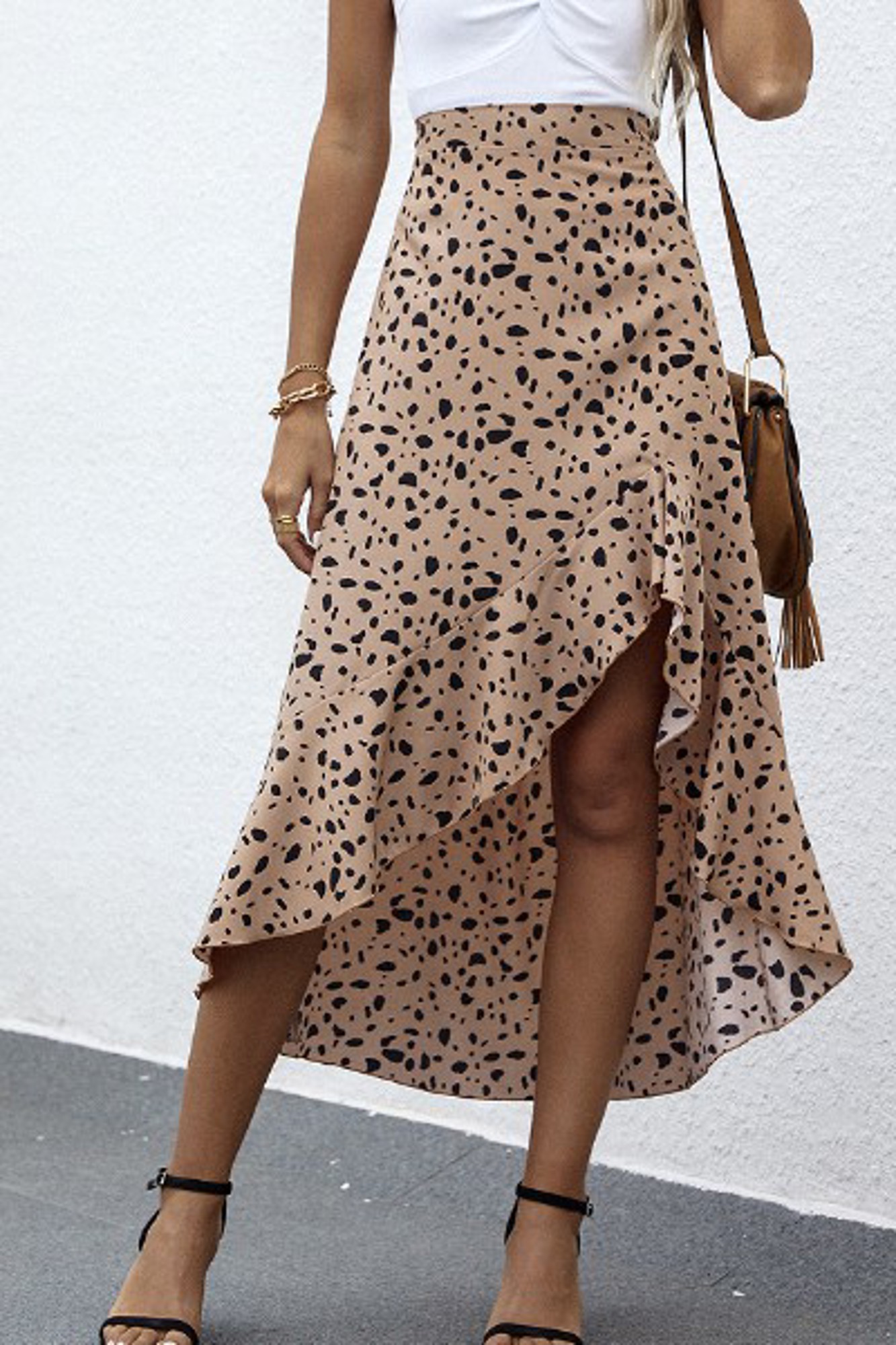 Ruffled Asymmetrical Midi Skirt Turn heads with this bold leopard-print midi skirt that breaks all the rules—literally. The asymmetrical hemline creates an unexpected silhouette that's equal parts cheeky and sophisticated, while cascading ruffles add movement and personality. Perfect for anyone who refuses to blend in, this statement piece pairs beautifully with solid basics or layered with other prints for maximum impact. Embrace your wild side and let your style roar.
