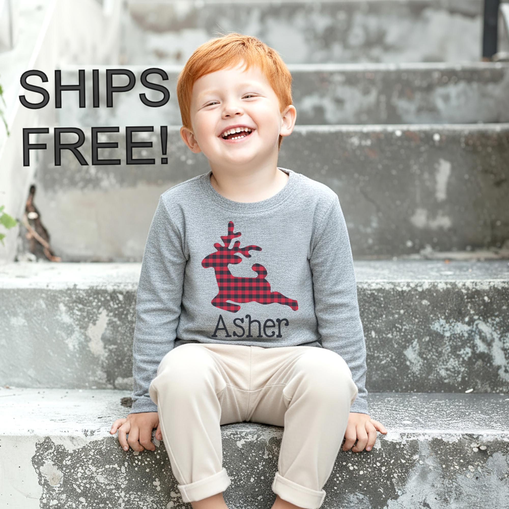 Celebrate the magic of the season with this cozy gray long sleeve Christmas tee, featuring a charming flying reindeer printed in a classic red and black plaid pattern. Perfect for boys or girls, this gender-neutral design combines timeless holiday style with a touch of rustic charm. Each shirt is personalized with your child’s name printed beneath the reindeer, creating a special keepsake they’ll love to wear year after year.
