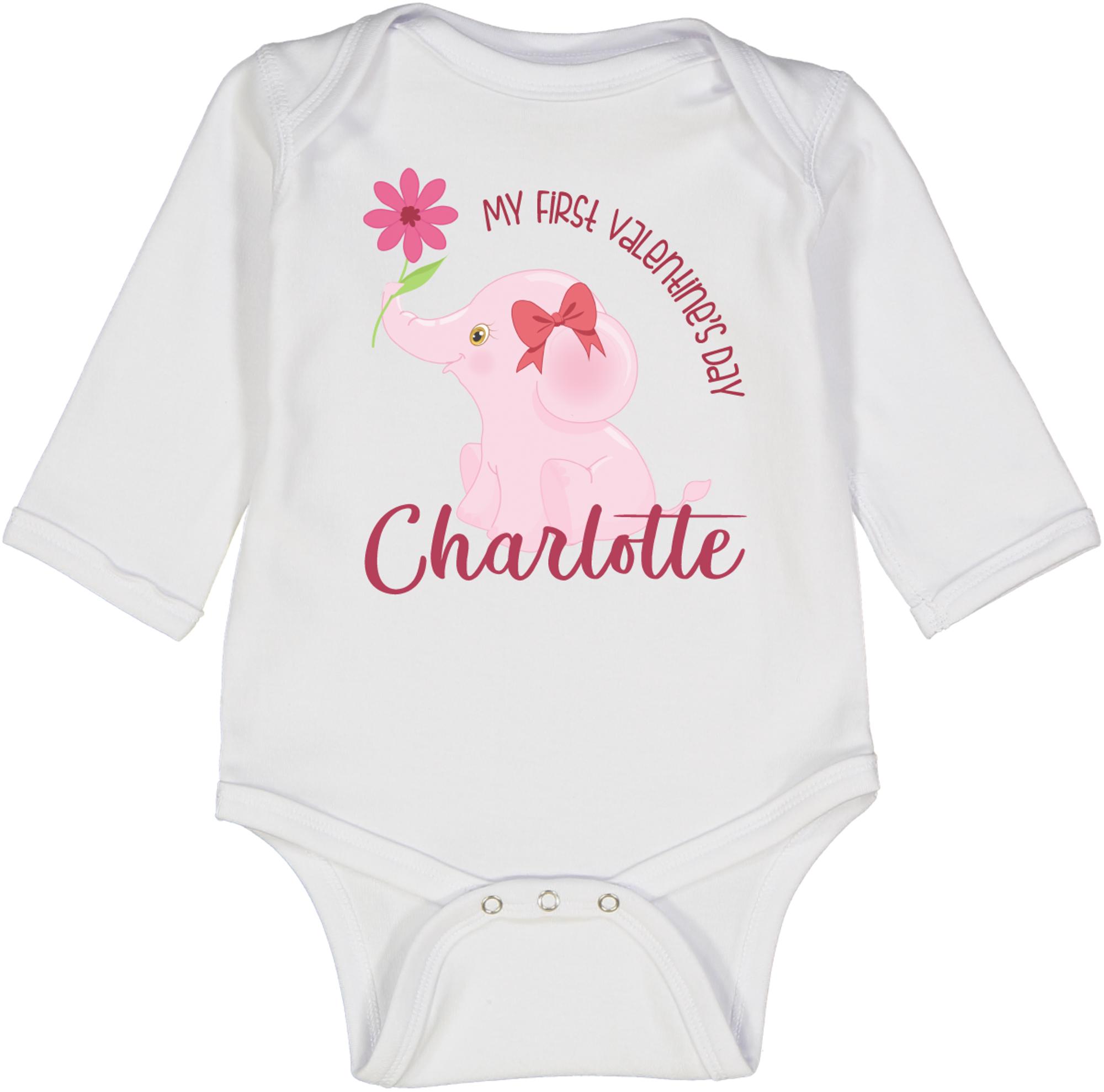 Celebrate baby’s very first Valentine’s Day with this sweet and girly personalized long sleeve bodysuit. Featuring an adorable pink elephant holding a flower and accented with a cute bow, this charming design includes the wording “My First Valentine’s Day” along with your baby’s name printed in a beautiful script for a special, one-of-a-kind keepsake.