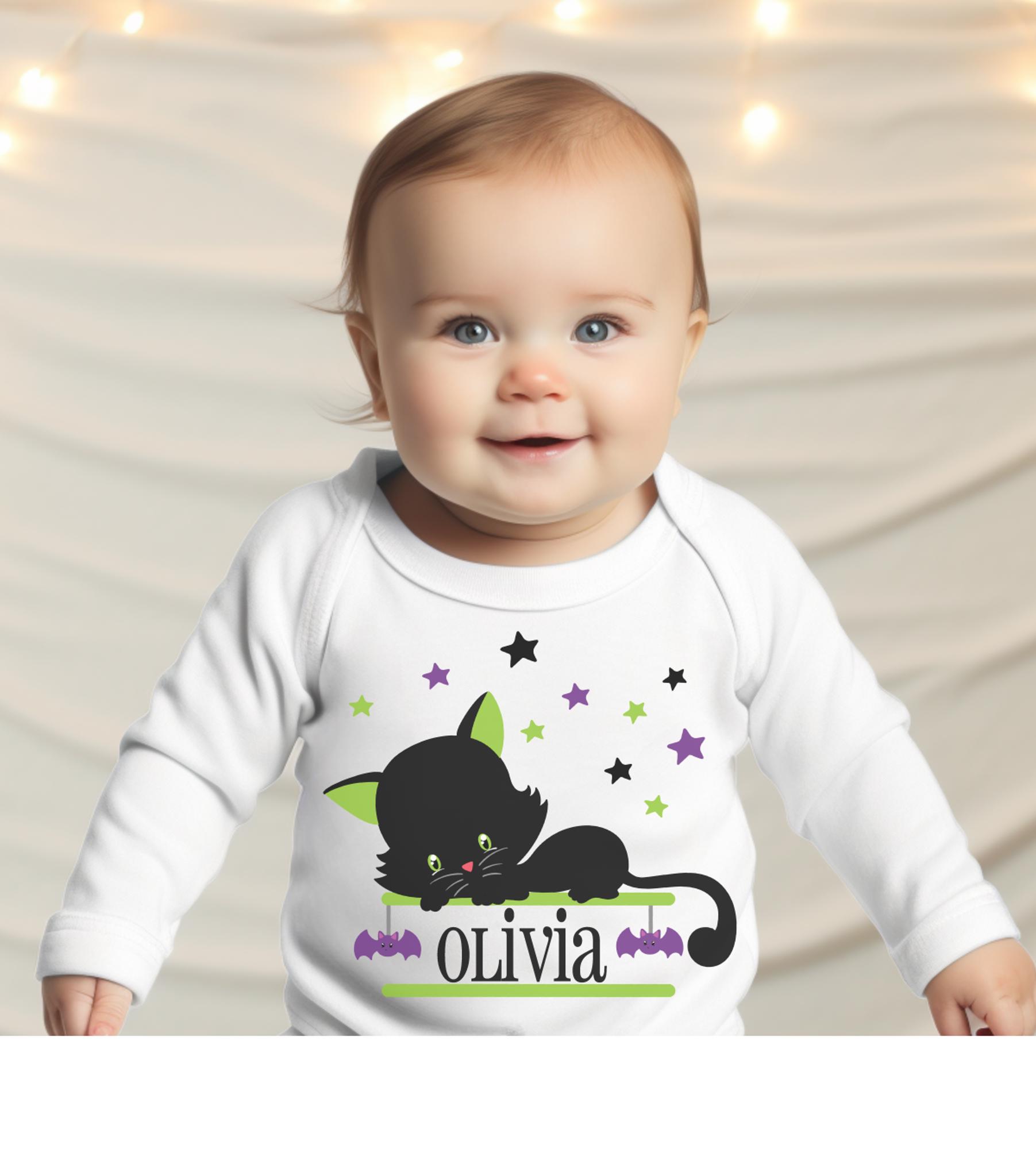 Get your little one ready for some spooky-sweet fun with this adorable personalized Halloween long sleeve bodysuit! Featuring a playful black cat surrounded by whimsical purple and green stars, this festive design is perfect for your infant or toddler’s first (or favorite!) Halloween celebration.