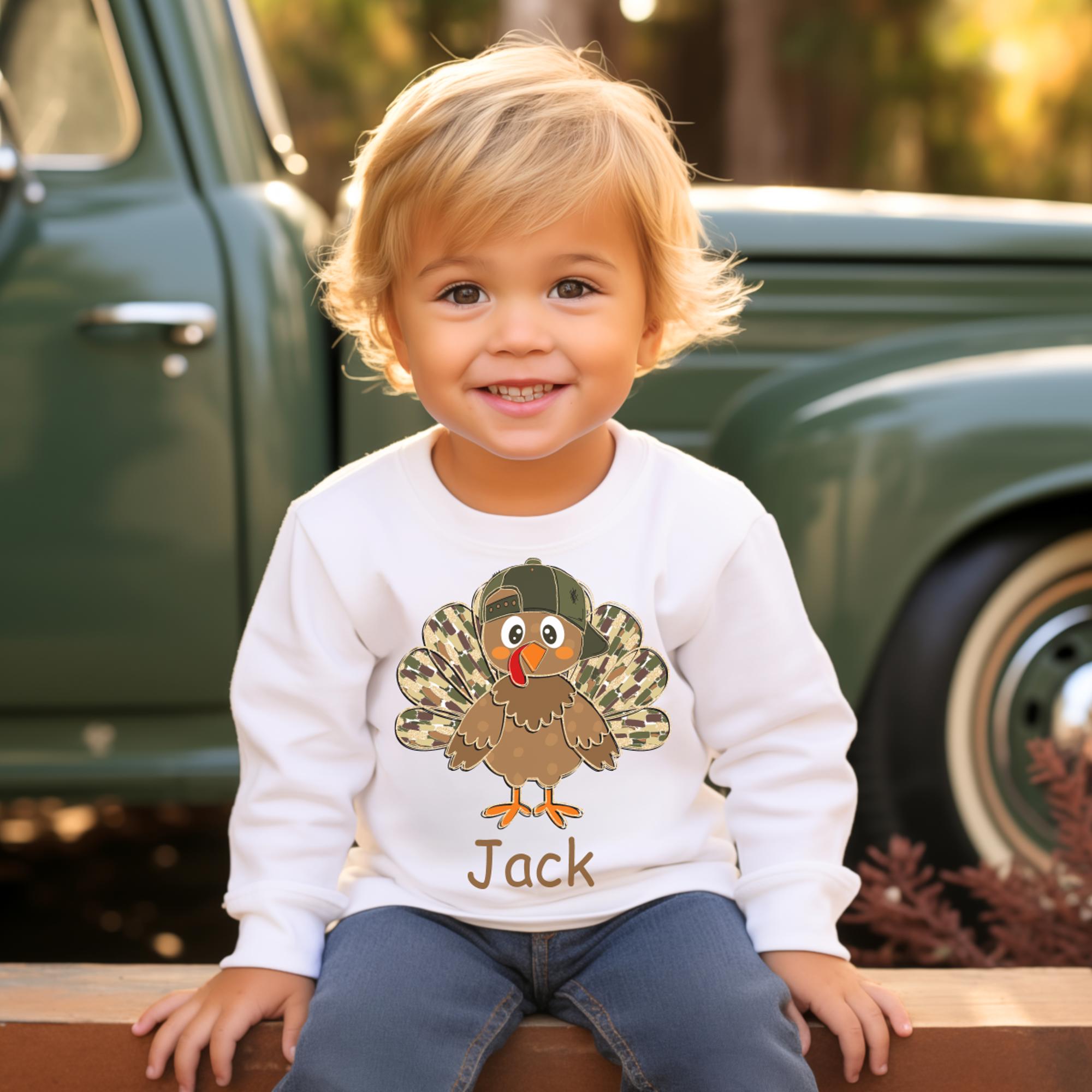 A fun, festive, and one-of-a-kind Thanksgiving tee—perfect for your little turkey who loves camo and holiday fun!