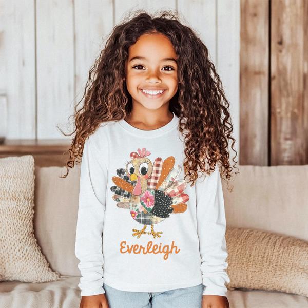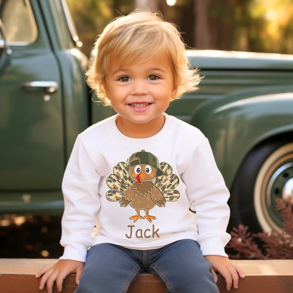 Personalized Thanksgiving Graphic Tshirt for Boys | Camo Standing Turkey | Boys Long Sleeve Thanksgiving Tee