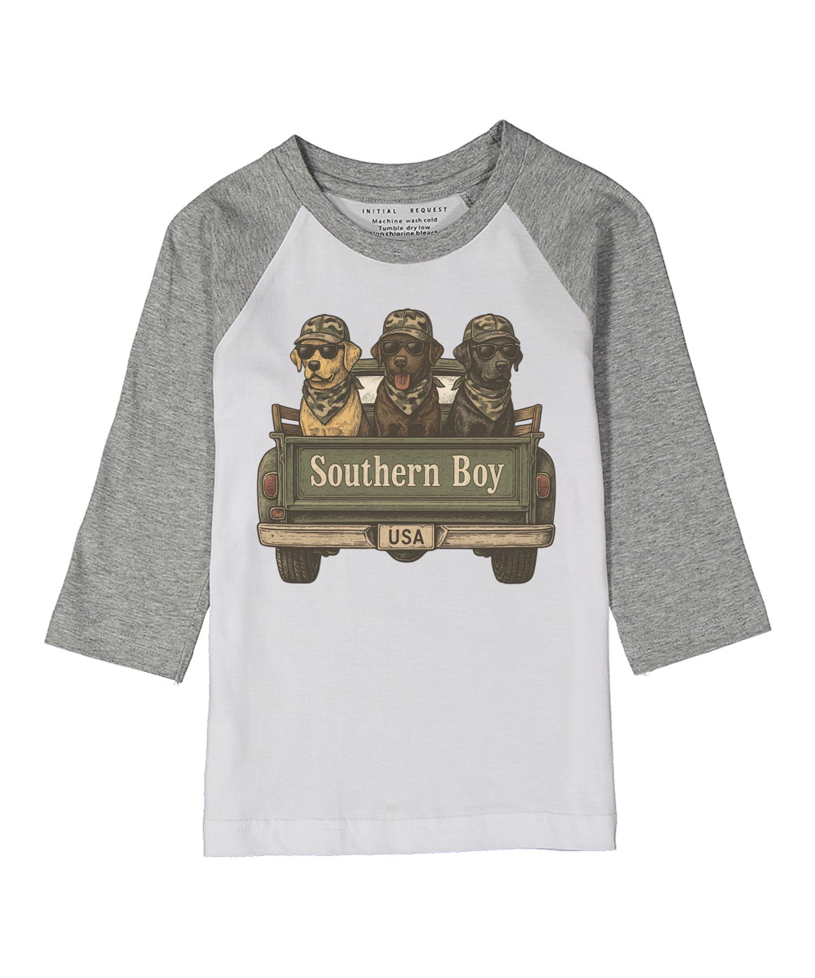 Perfect for your little outdoorsman, this boys’ gray raglan tee features a charming graphic of a classic green vintage truck carrying three playful Labradors in the back. Underneath, the bold “Southern Boy” lettering completes the look, making this the ideal tee for boys who love trucks, dogs, and country life. It’s fun, stylish, and full of southern charm — a great gift idea for birthdays, holidays, or just because!