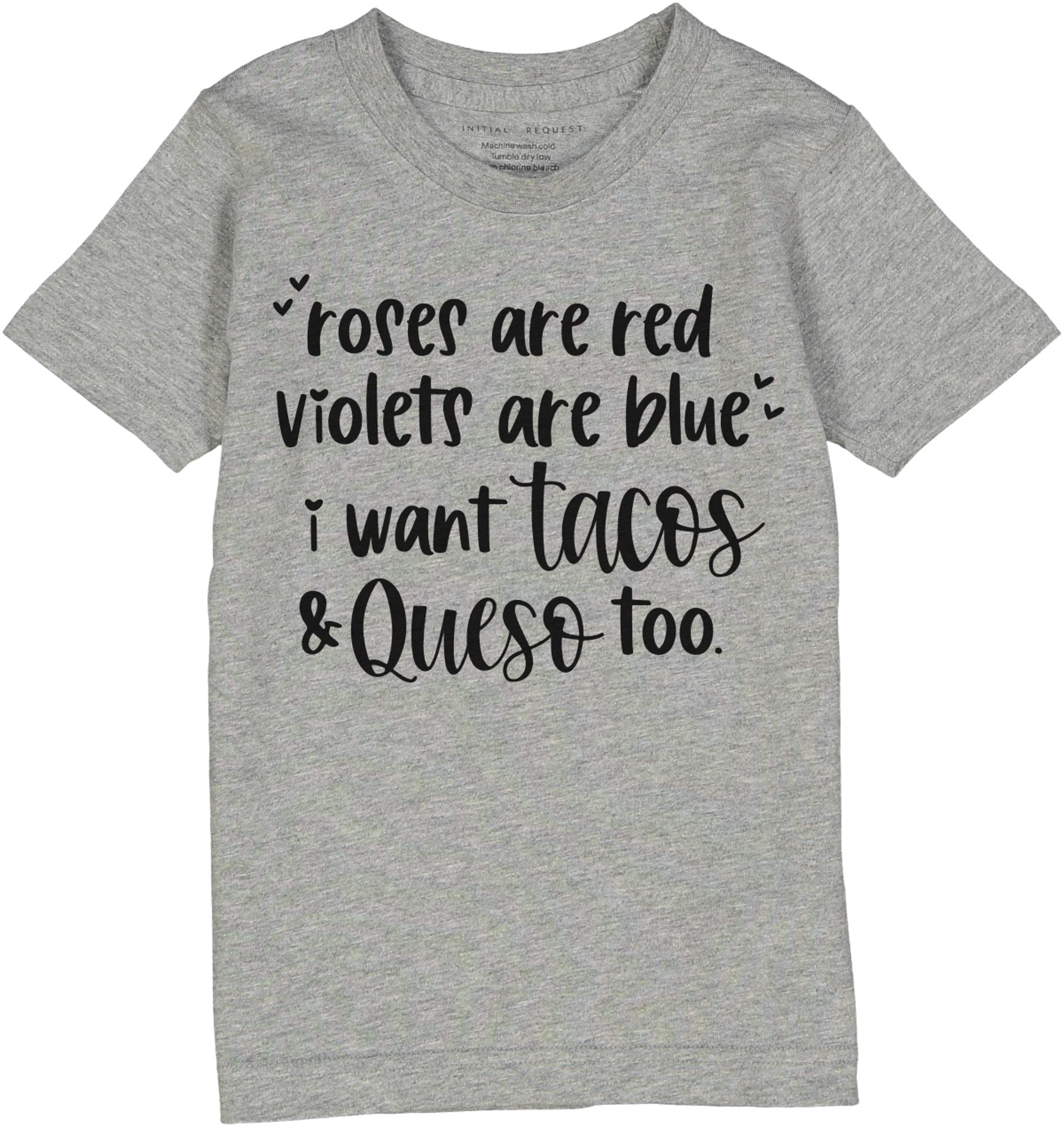 Add a little humor to Valentine’s Day with this playful gray short sleeve tee! Featuring the fun saying “Roses are red, violets are blue, I love tacos and queso too,” this shirt is perfect for kids who would rather celebrate love with their favorite foods. The gender-neutral design makes it a great choice for boys or girls.