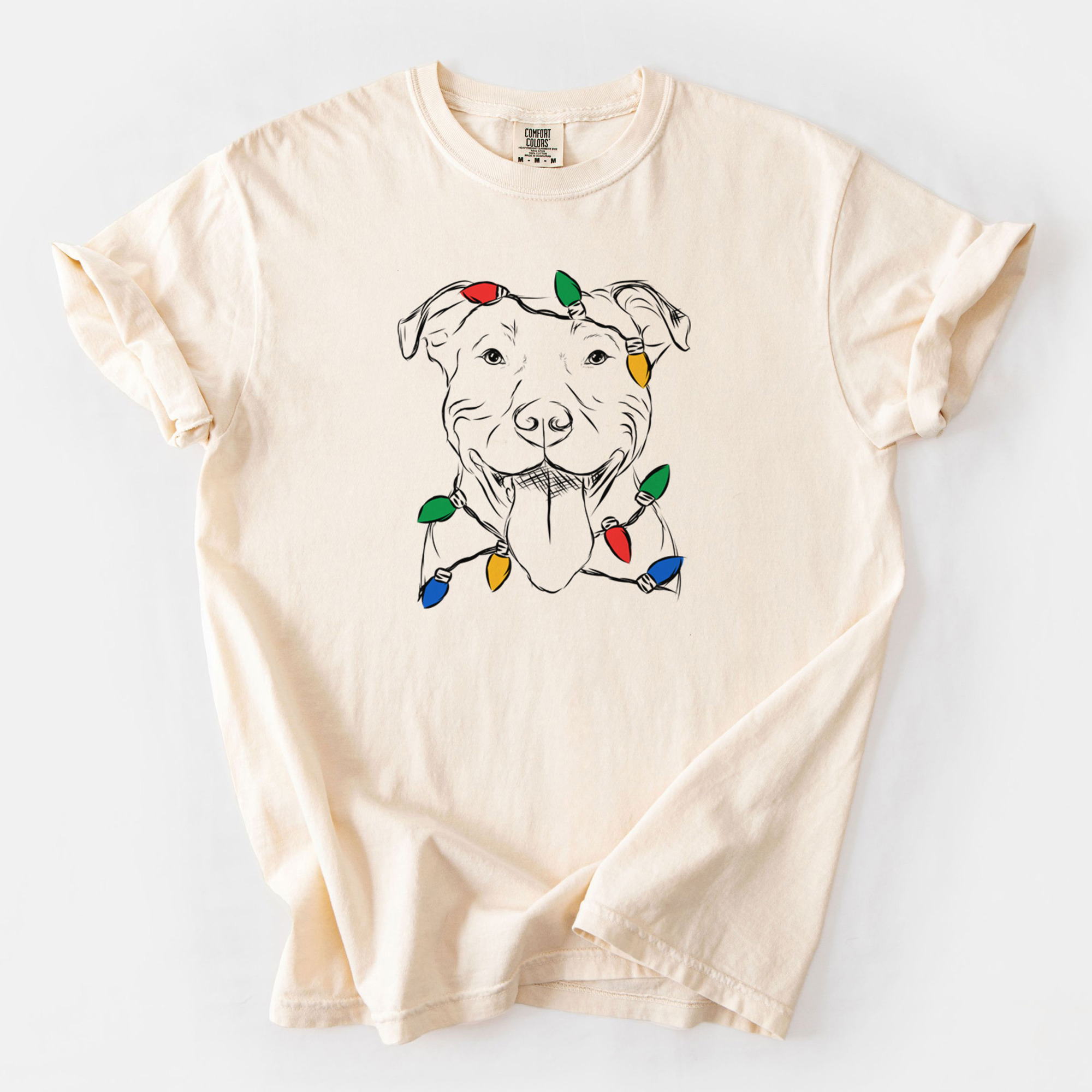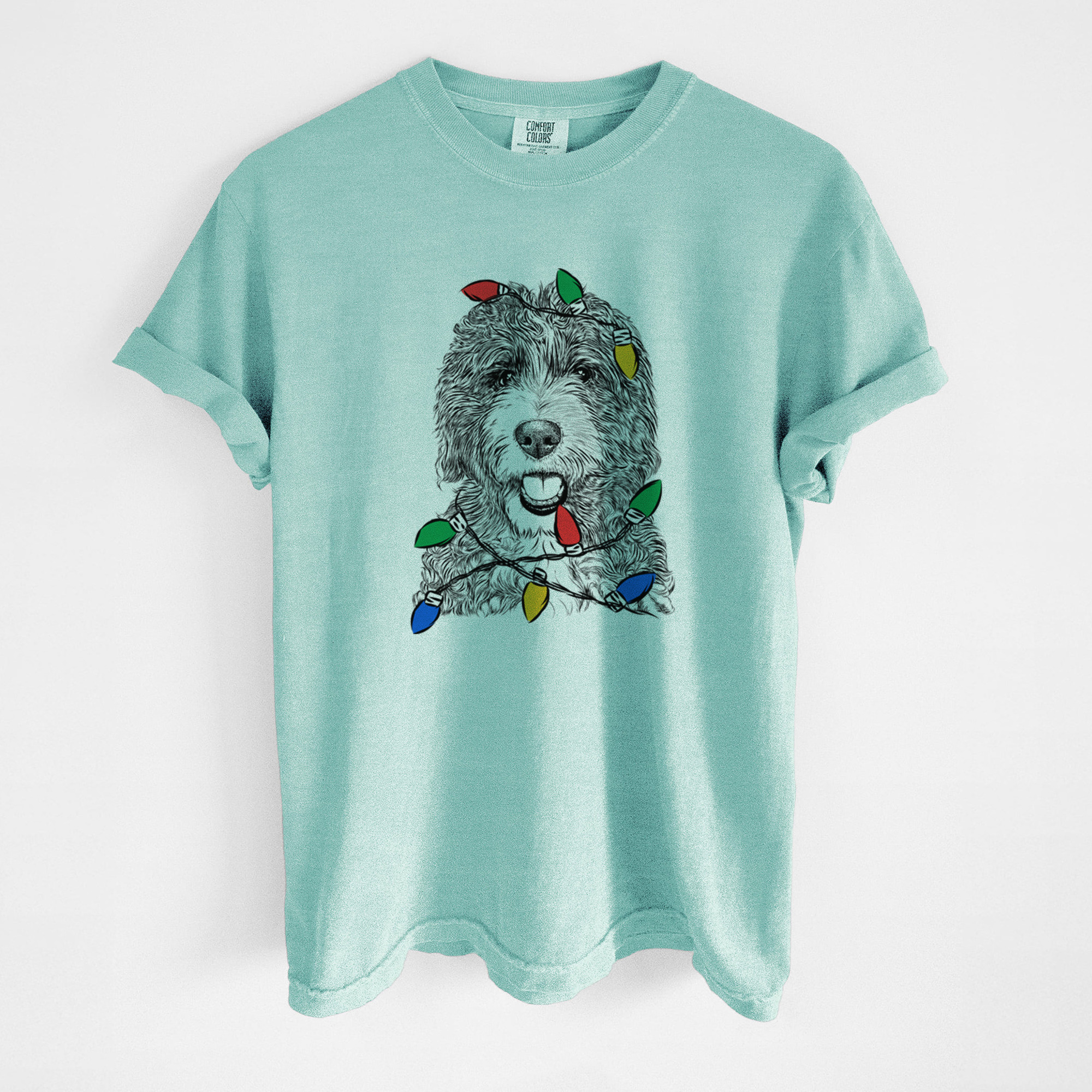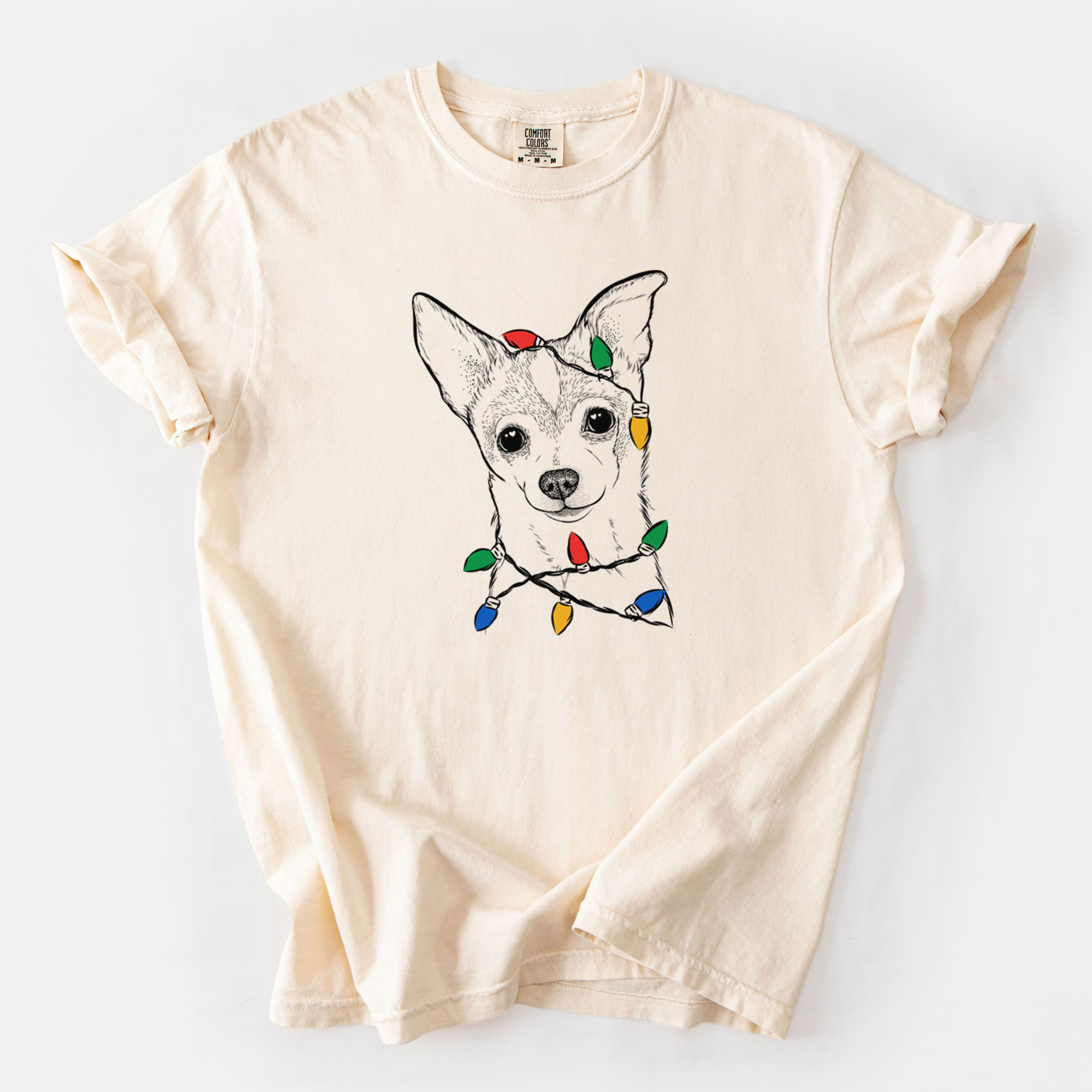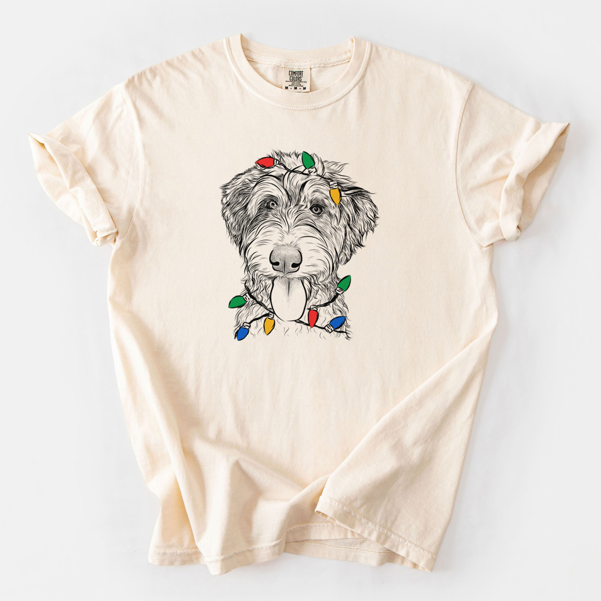 Unique Christmas themed Tee contains a hand drawn 100% original dog sketch wearing a christmas lights.