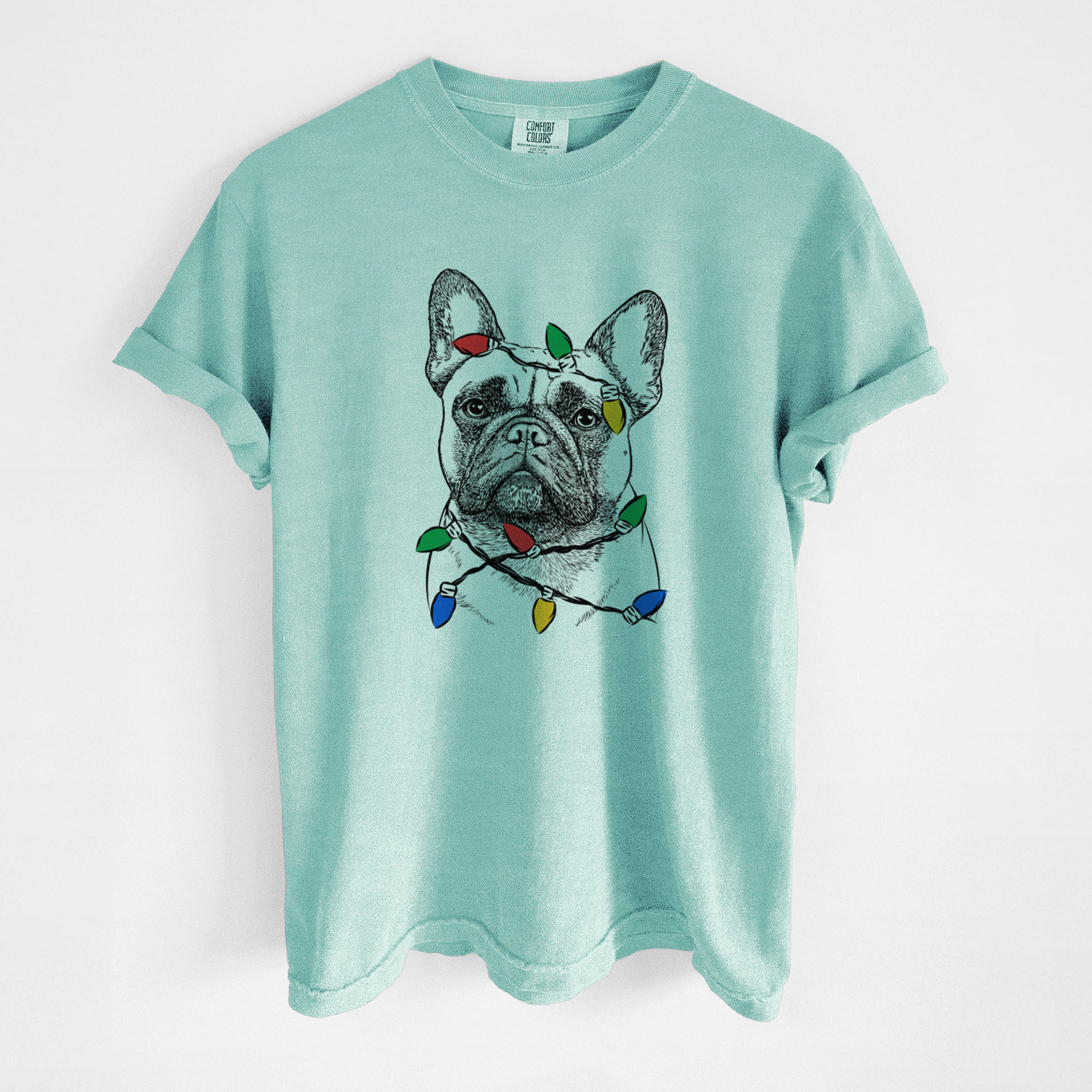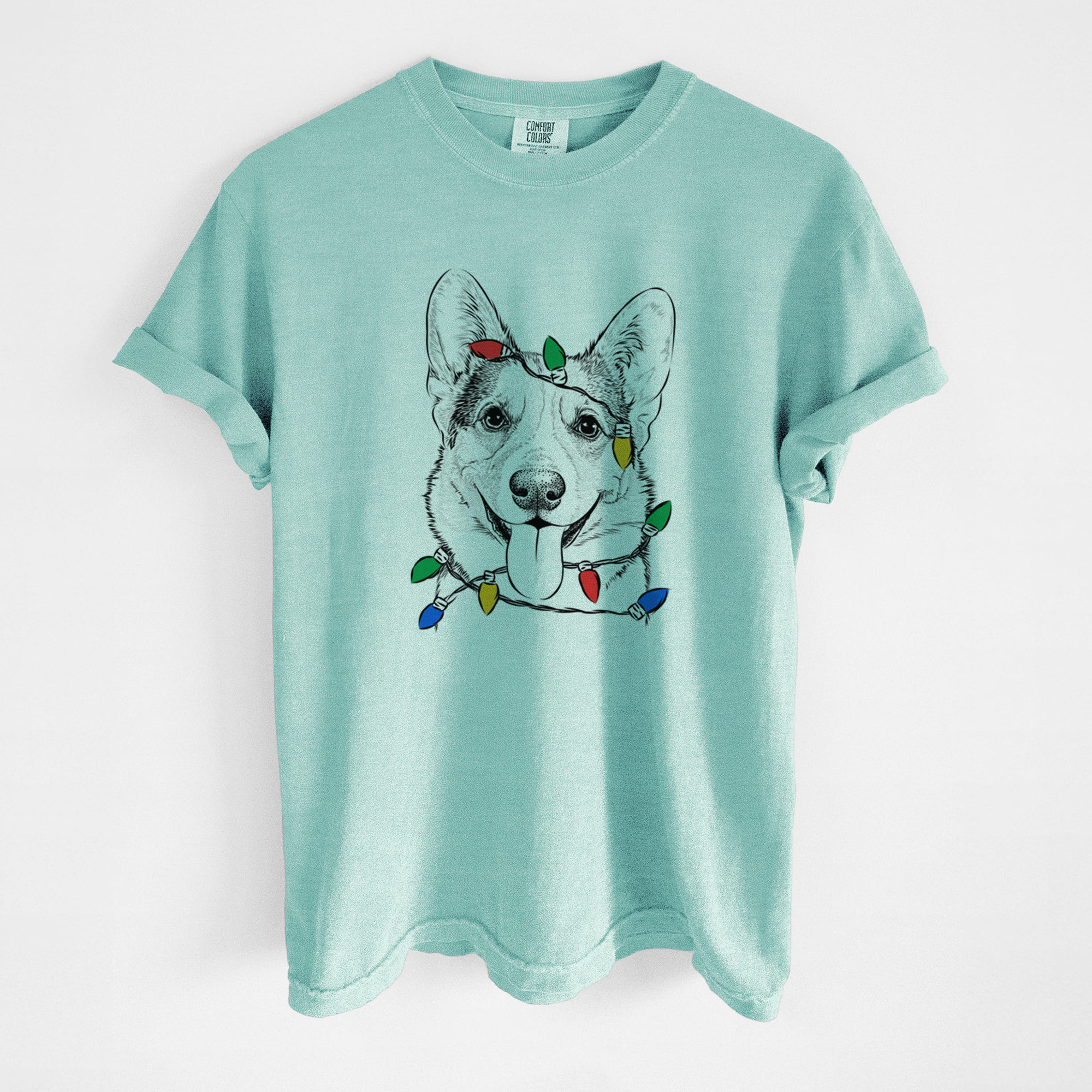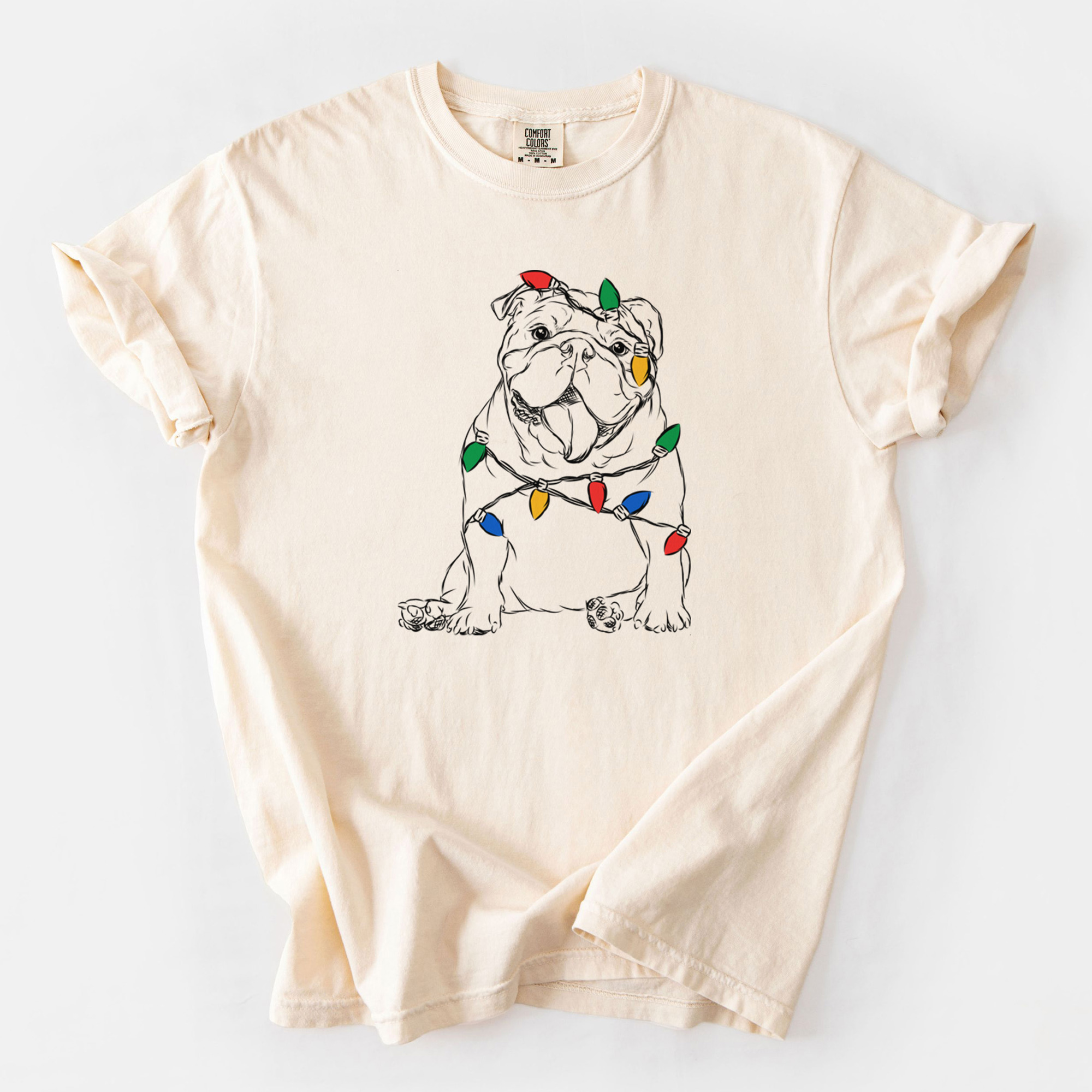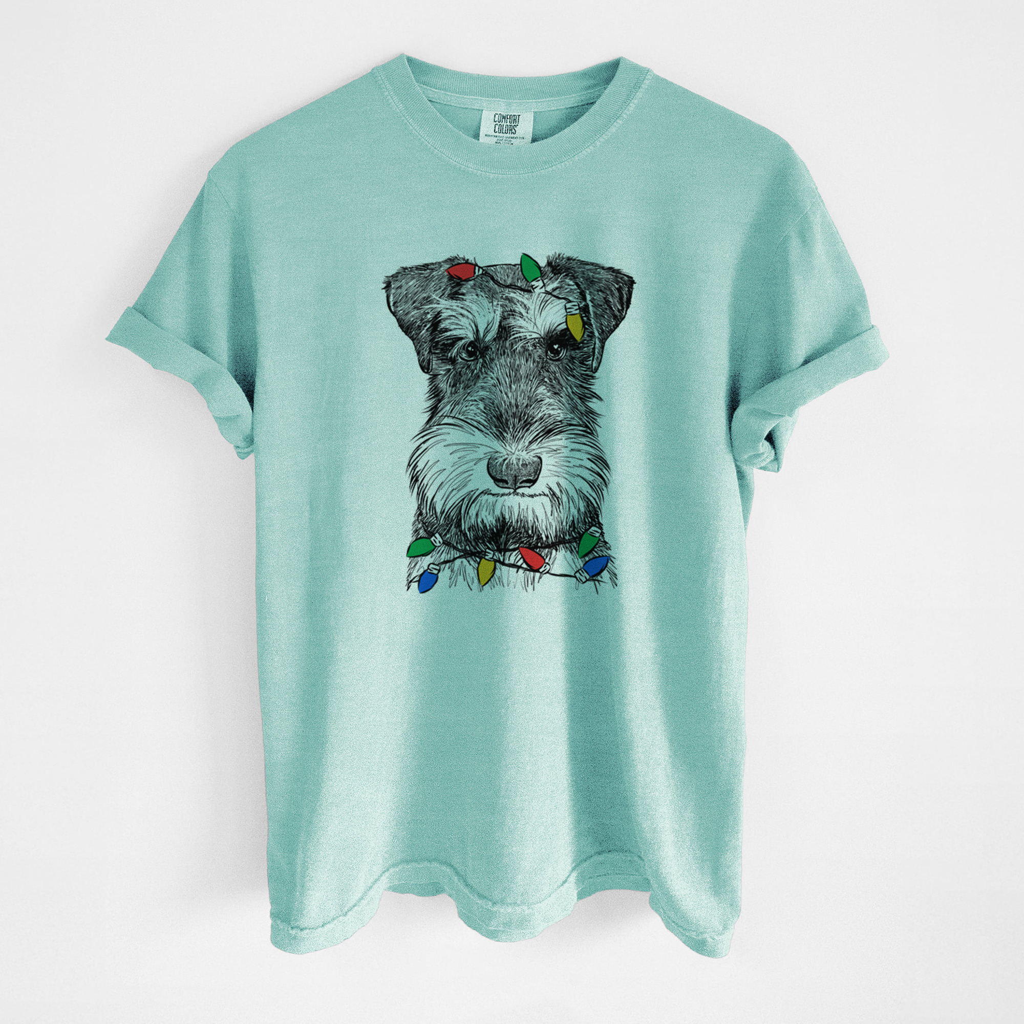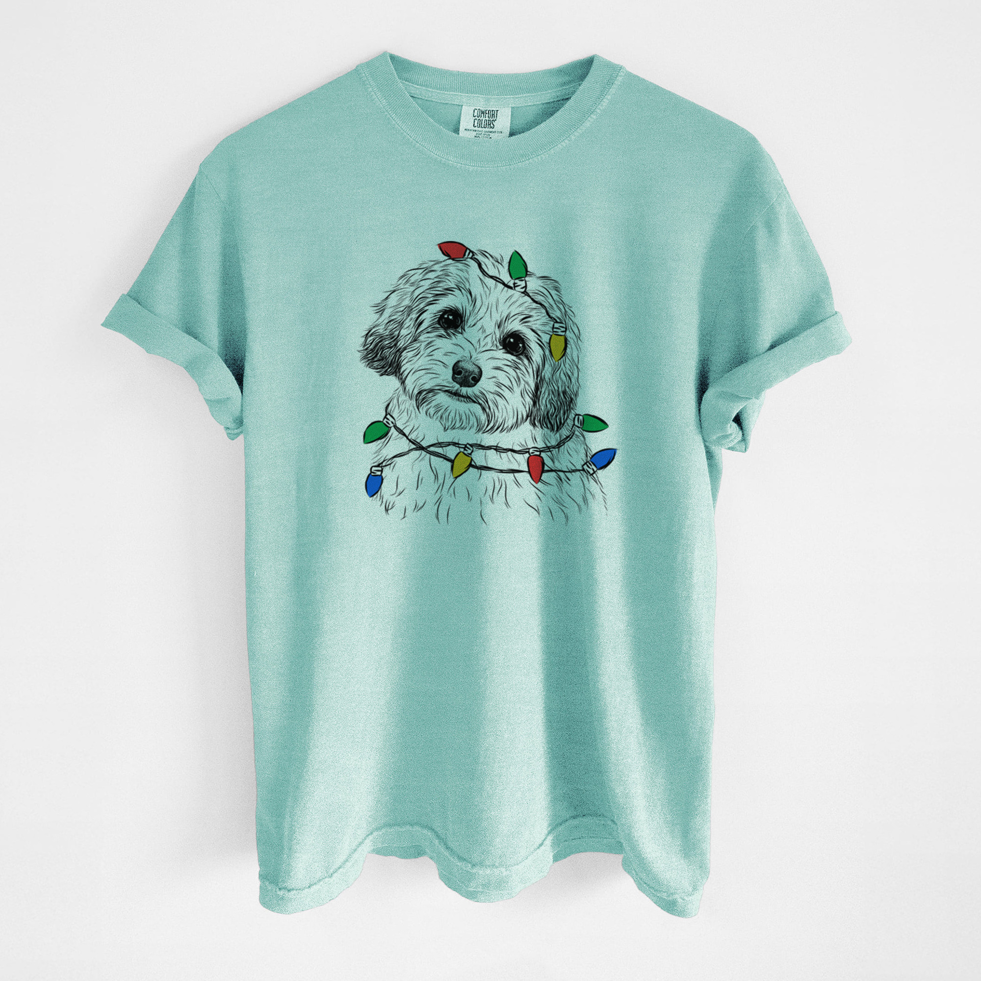 Unique Christmas themed Tee contains a hand drawn 100% original dog sketch wearing a christmas lights.