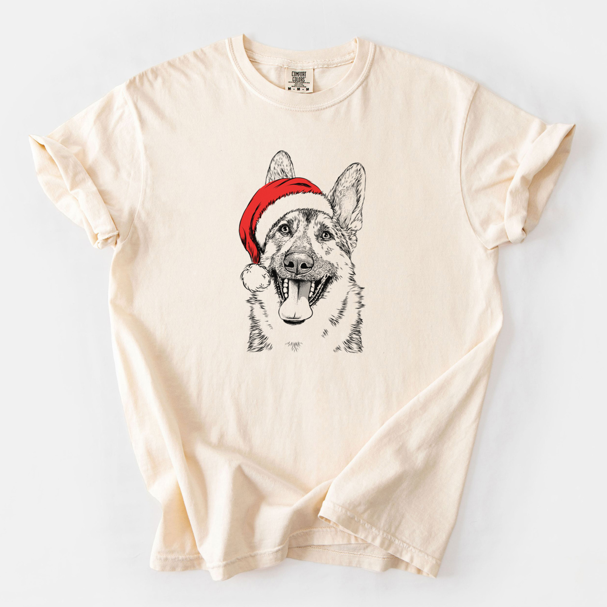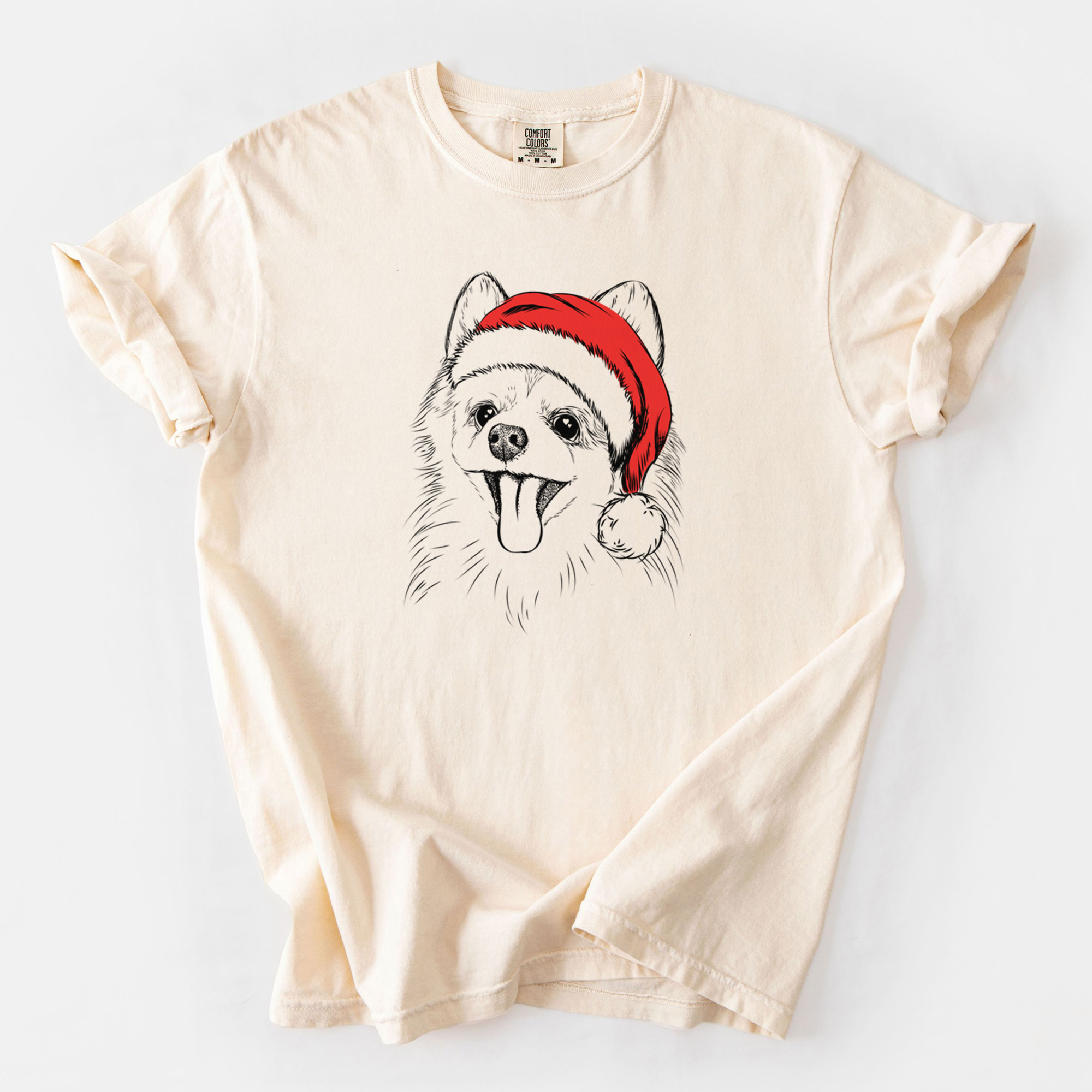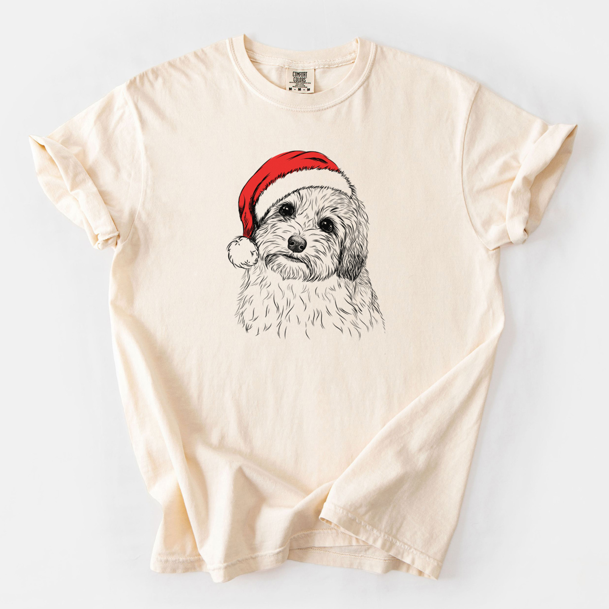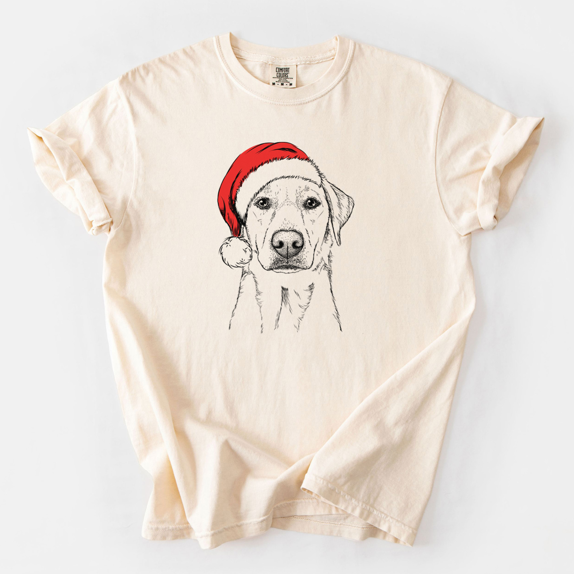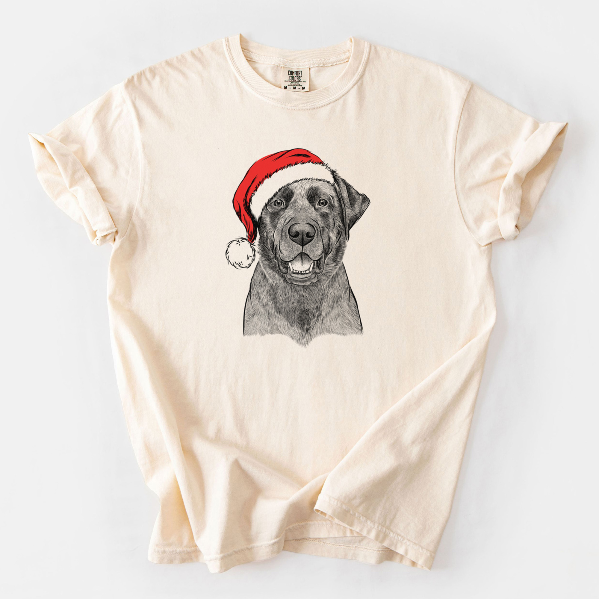 Unique Christmas themed Tee contains a hand drawn 100% original dog sketch wearing a santa hat.