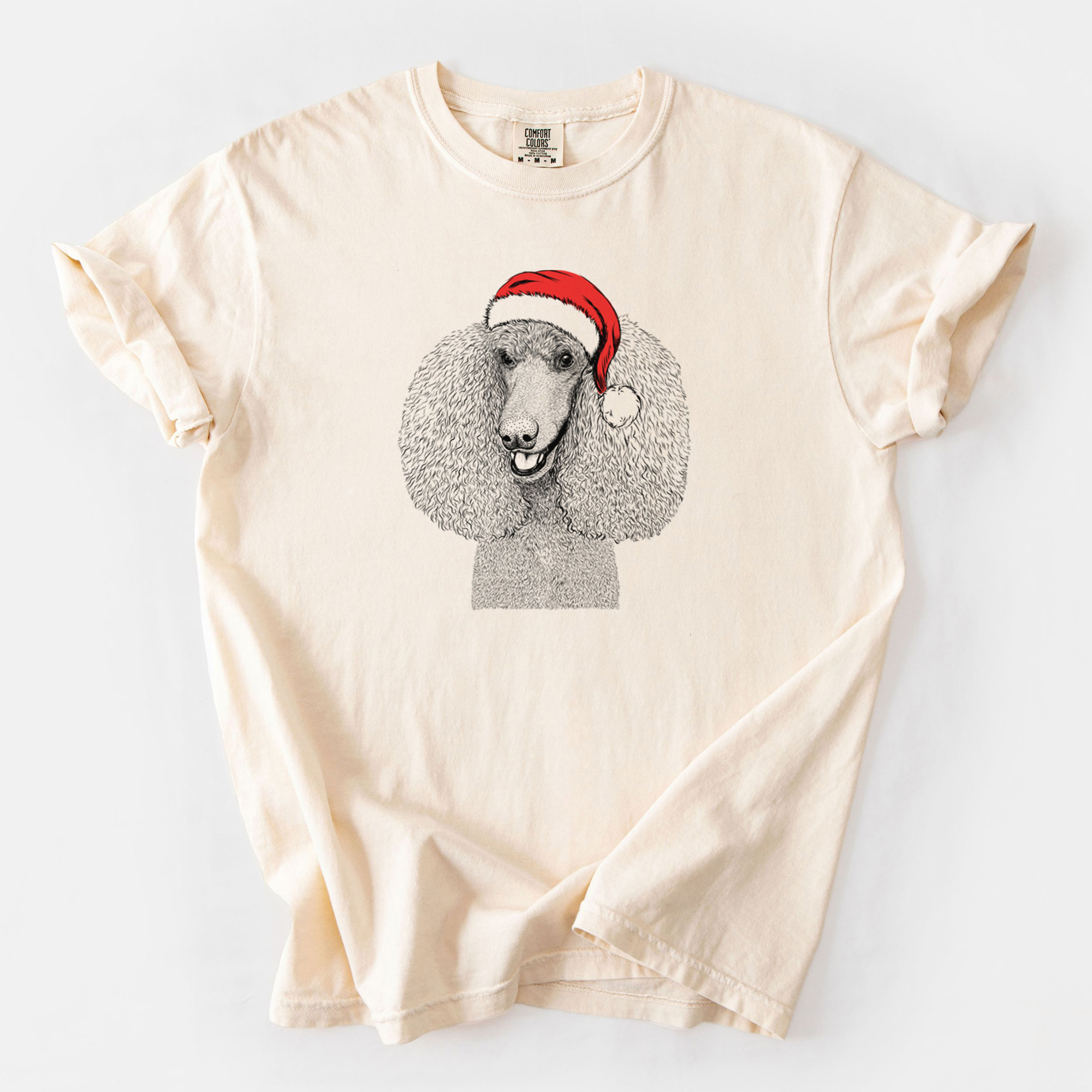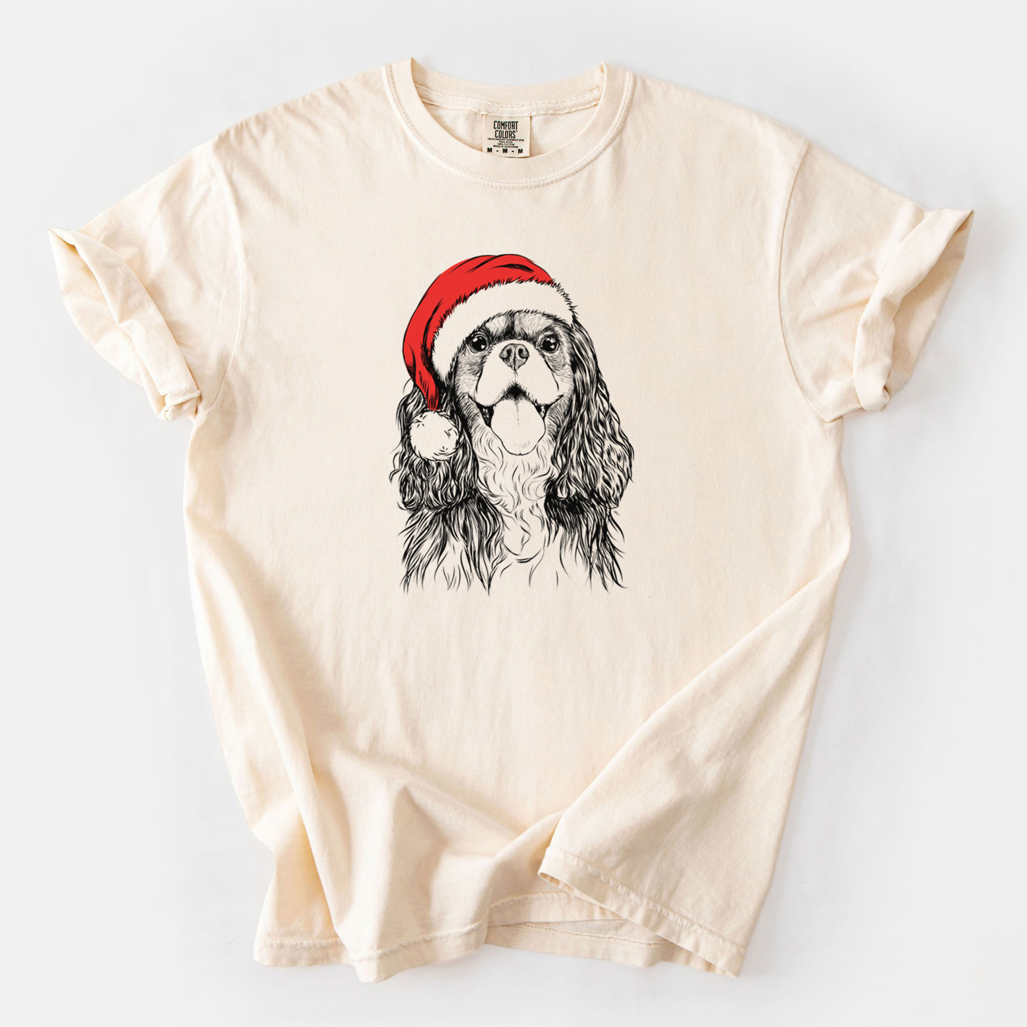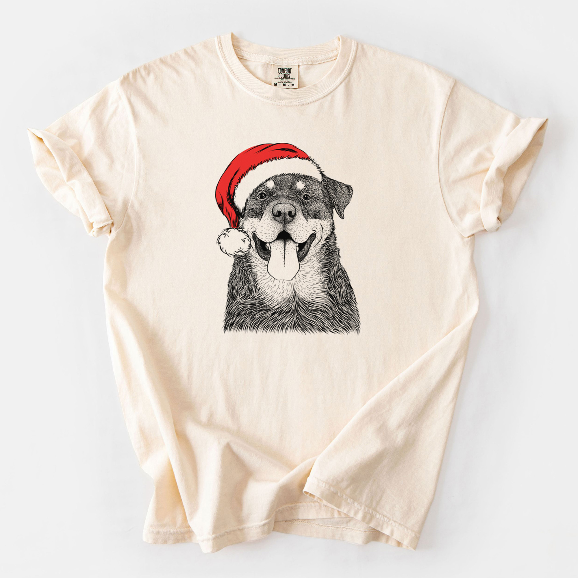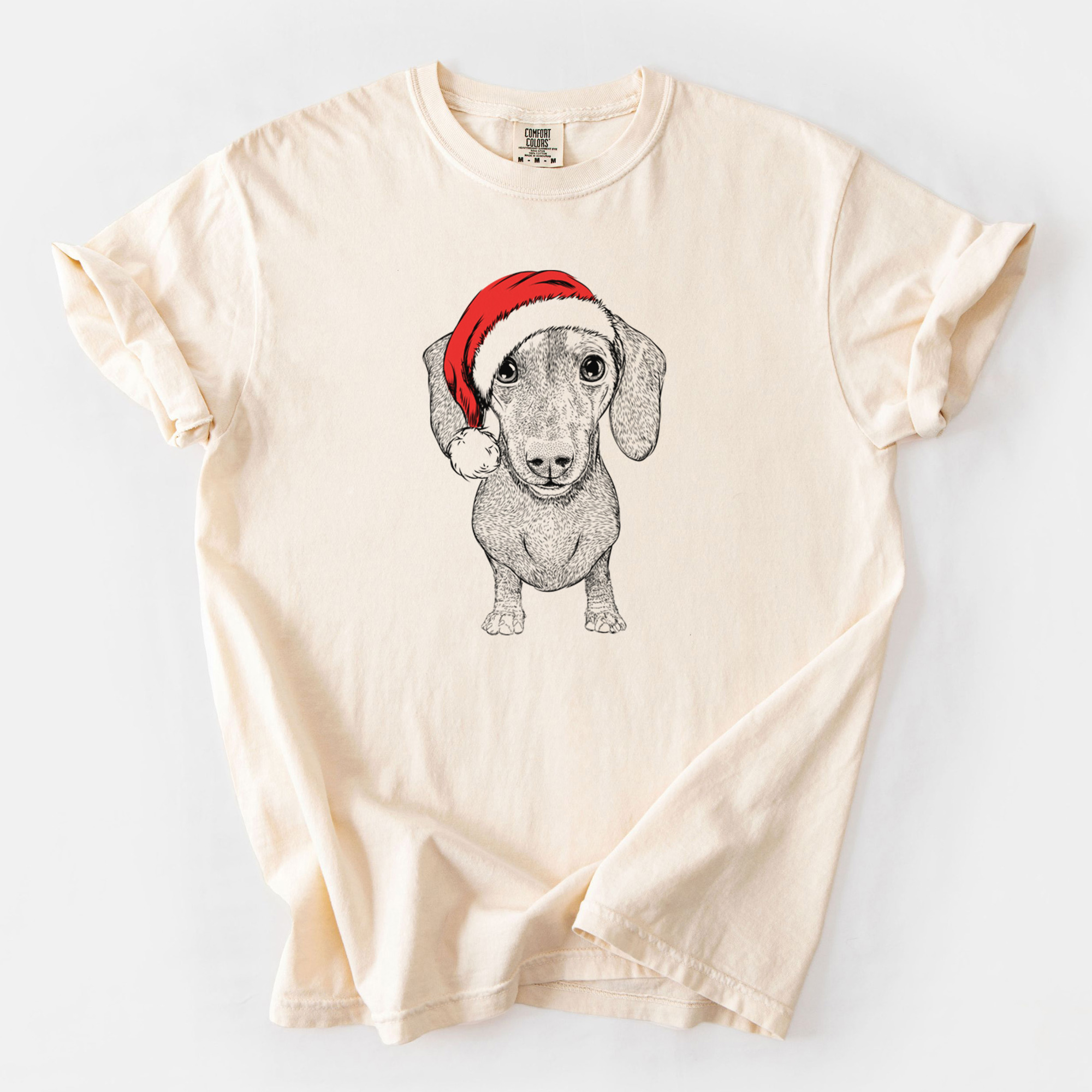 Unique Christmas themed Tee contains a hand drawn 100% original dog sketch wearing a santa hat.