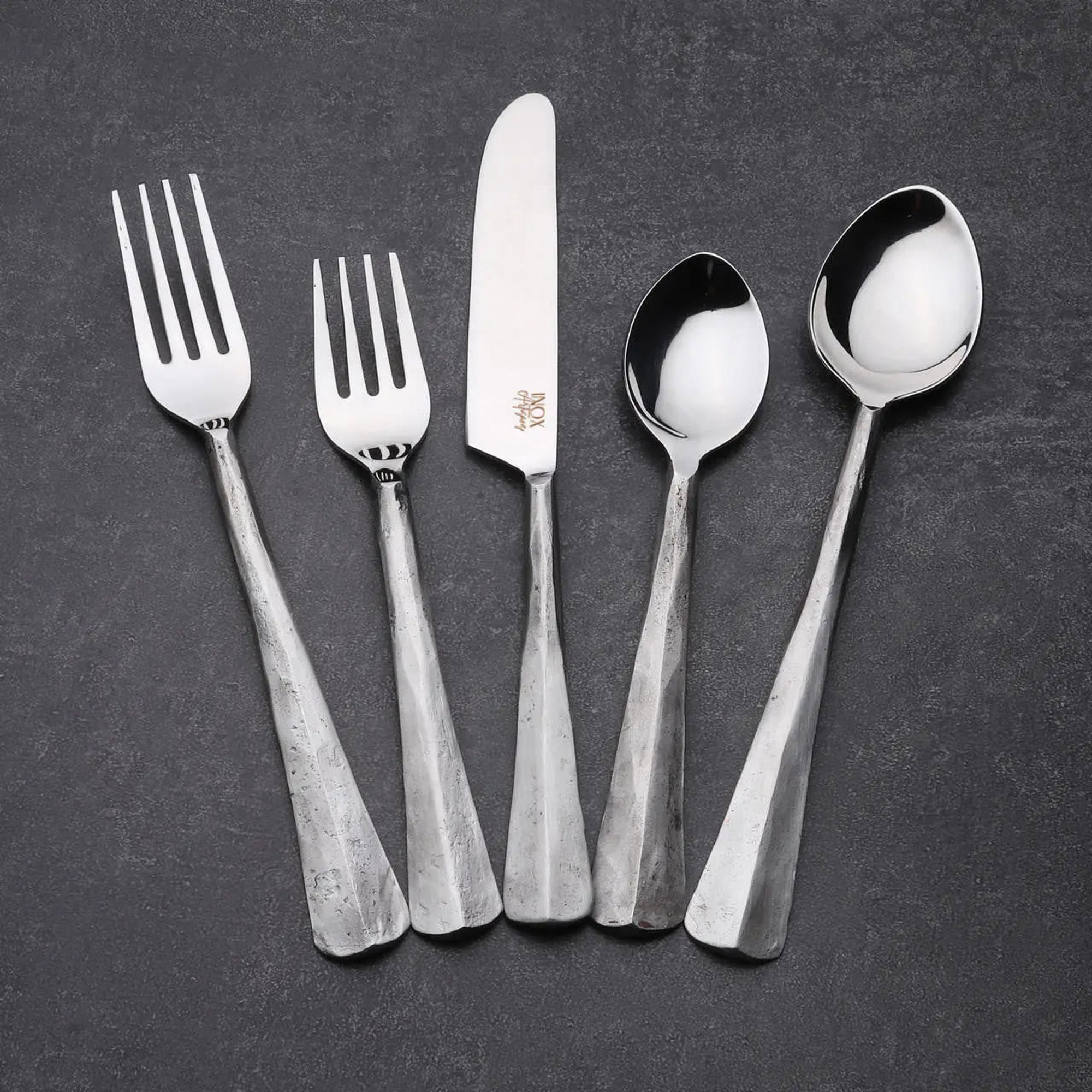 Dress up your table with our Ridge Flatware 5-Pc. Place Setting. Featuring tapered handles with a center ridge in hammered raw nascent stainless steel, this heirloom-worthy set brings effortless elegance to your dinner table. With quality craftsmanship throughout, this artisan silverware design makes a thoughtful gift for a housewarming or a unique wedding gift for a favorite couple. Your guests will appreciate the style and quality of this artisan-made stainless steel flatware. Rendered from 18/8 stainless steel Chic, organic texture for a distinctive table setting Each handcrafted set includes a salad fork, dinner fork, table knife, soups spoon, and teaspoon Delivered in eco-friendly cloth packaging for protection and stylish gift-giving Dishwasher safe (Lemon-scented or corrosive detergents not recommended)