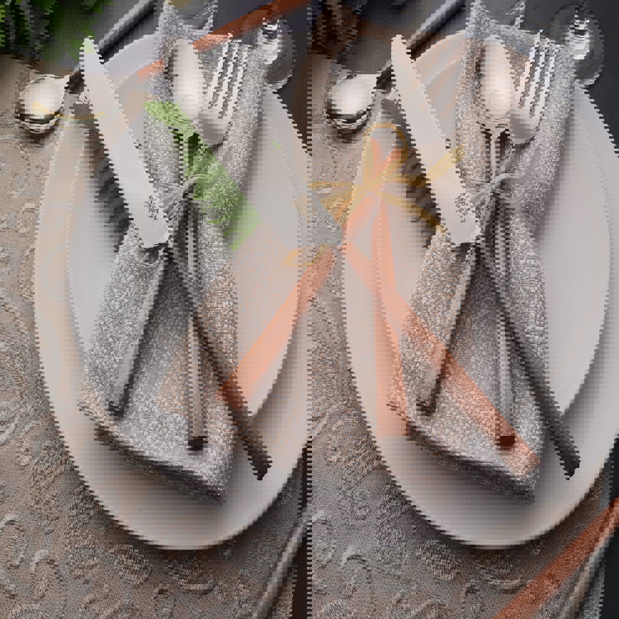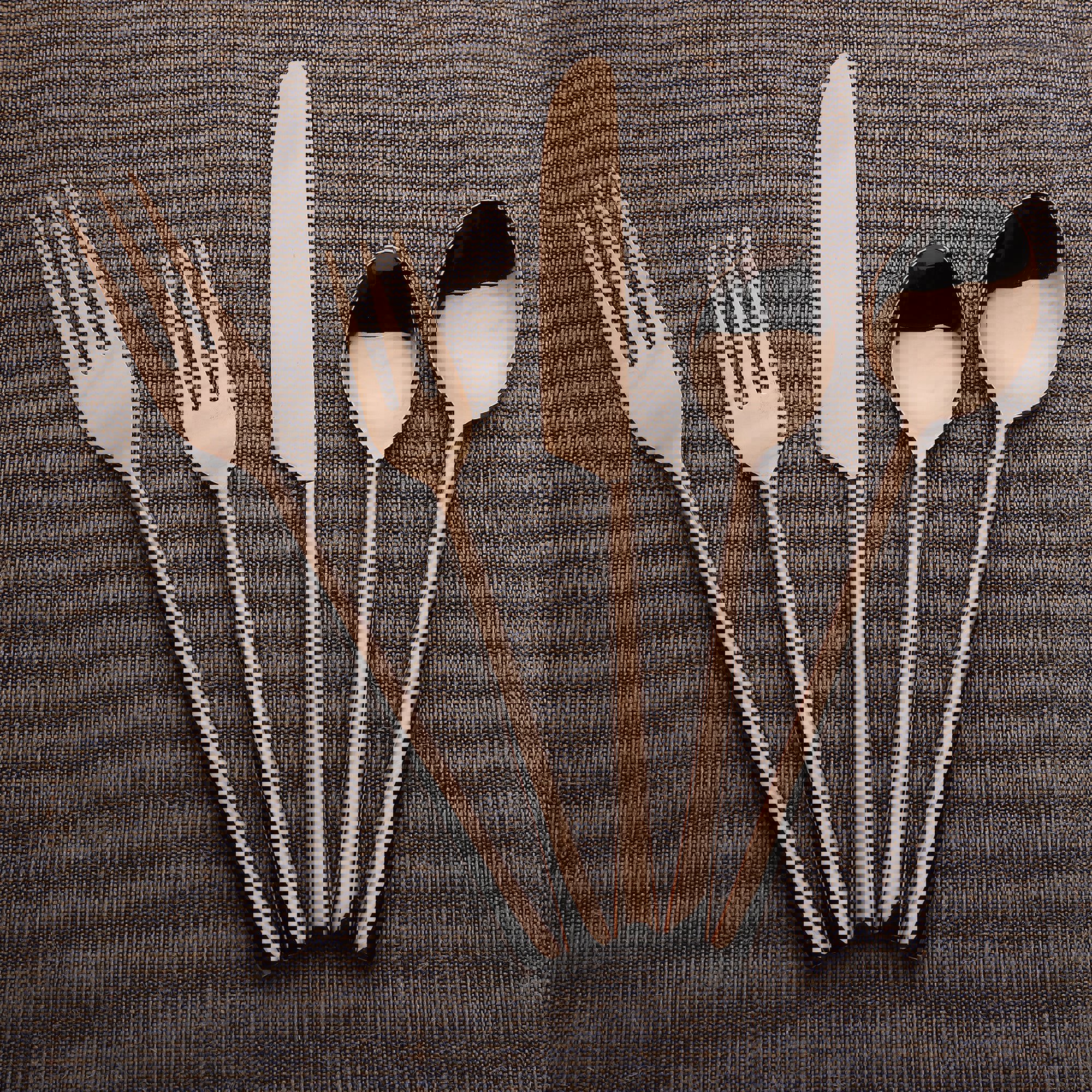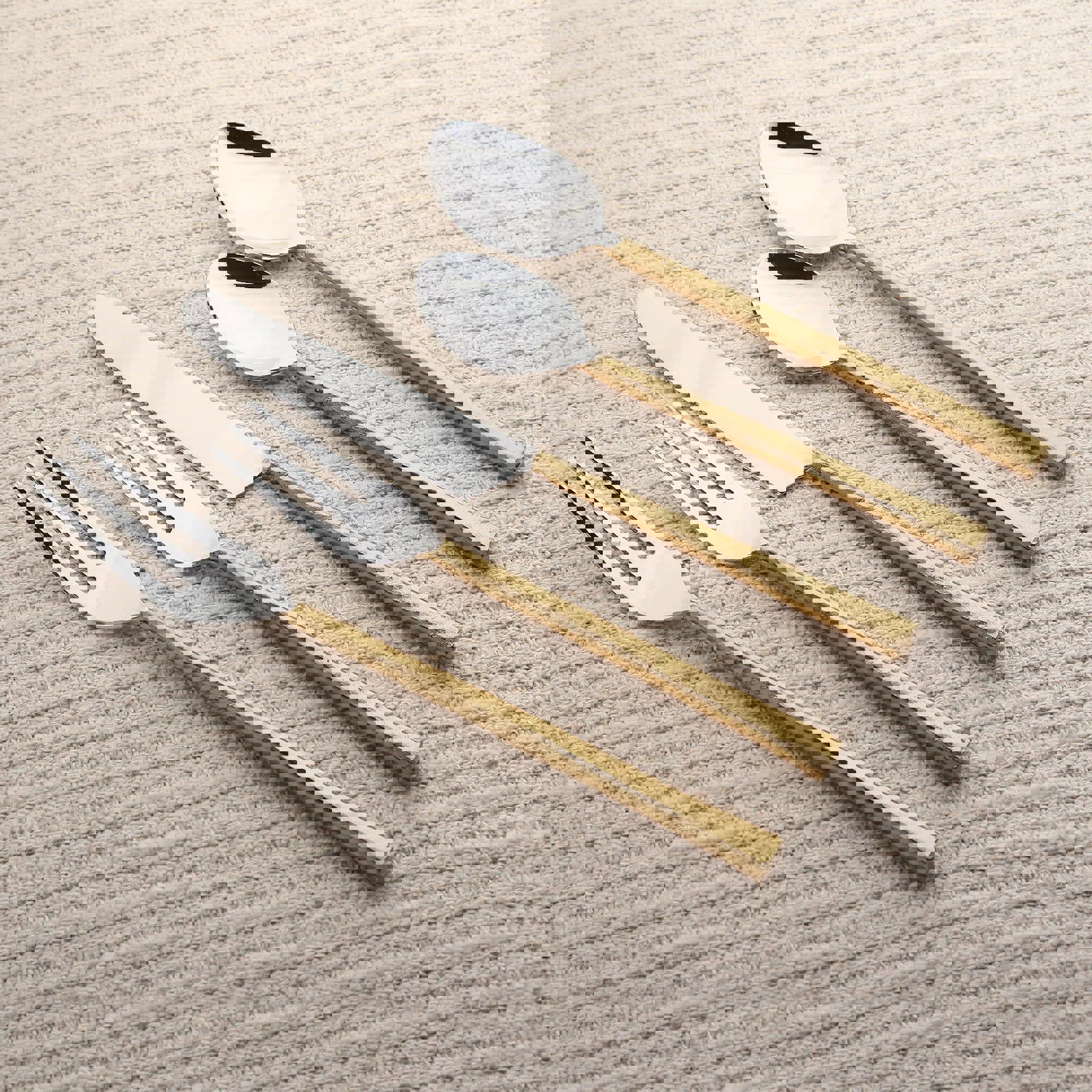 Our Sundance Flatware 5-Pc. Place Setting is the perfect complement to contemporary dinnerware. It features high polished stainless steel utensils with distinctive antique copper handles. The textured handles fit comfortably in your hand and the laid-back elegant design is perfect for every day dining or a gathering of friends. Our Sundance Flatware 5-Pc. Place Setting brings rustic elegance to contemporary and classic table settings. It features highly polished stainless steel utensils contrasted with organic textured handles. The handles widen slightly and fit comfortably in your hand. Rendered from 18/8 stainless steel Chic, organic texture for a distinctive table setting Each handcrafted set includes a salad fork, dinner fork, table knife, soups spoon, and teaspoon Delivered in eco-friendly cloth packaging for protection and stylish gift-giving Dishwasher safe (Lemon-scented or corrosive detergents not recommended)
