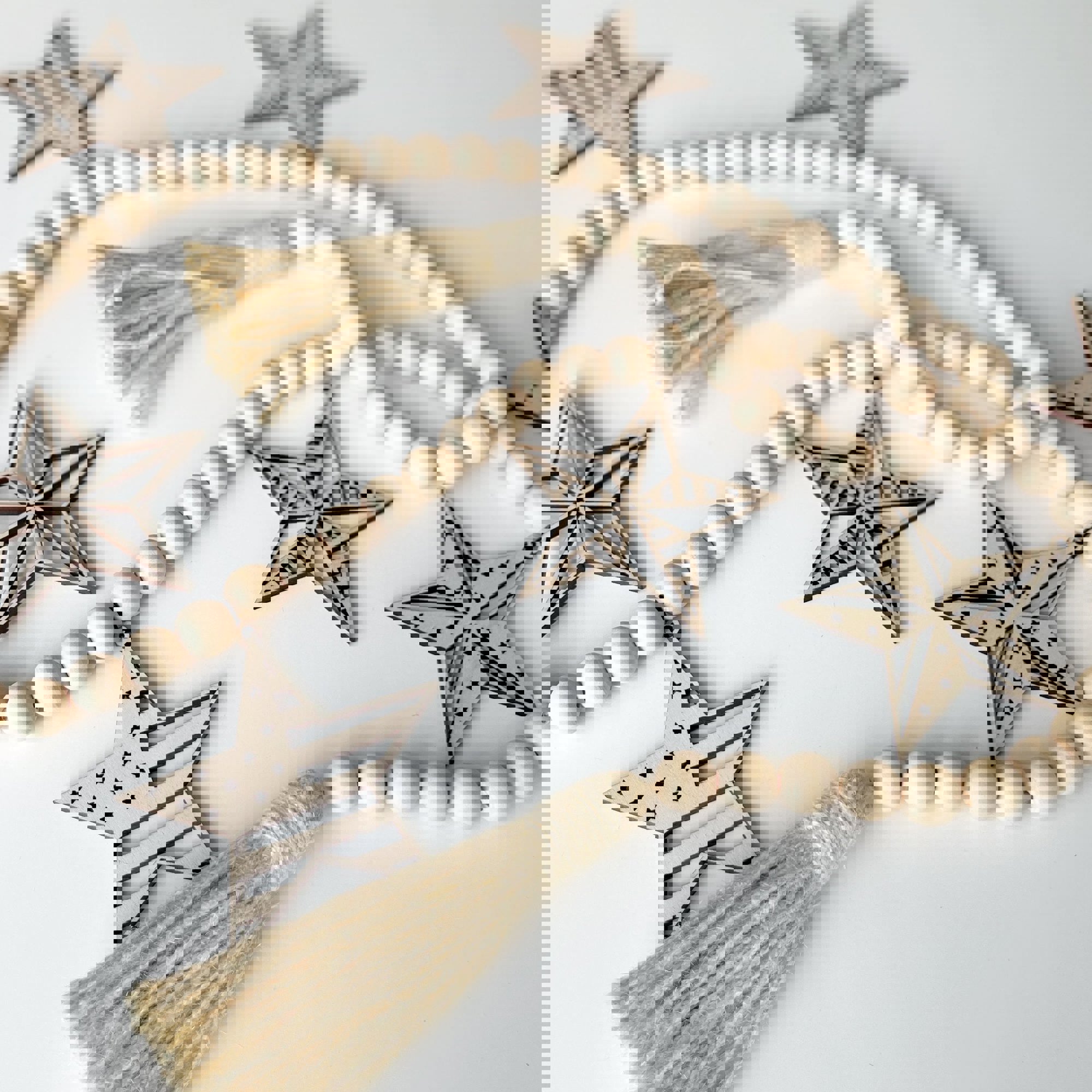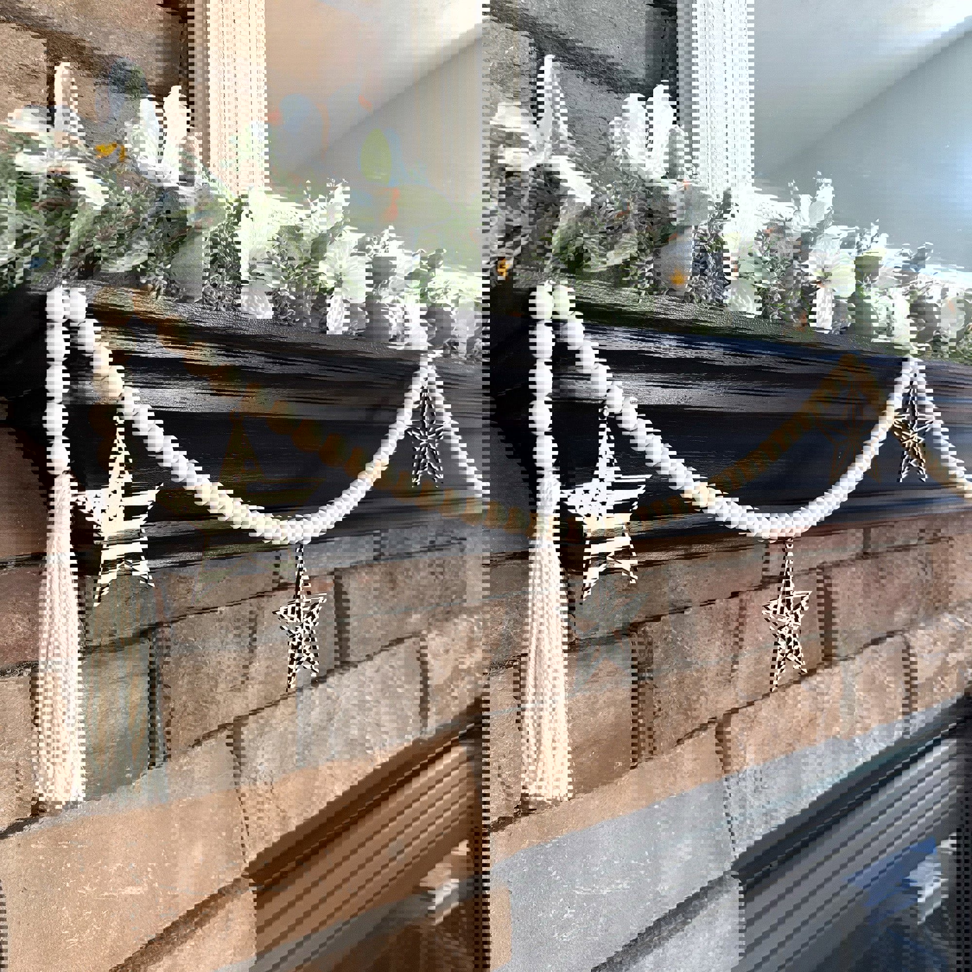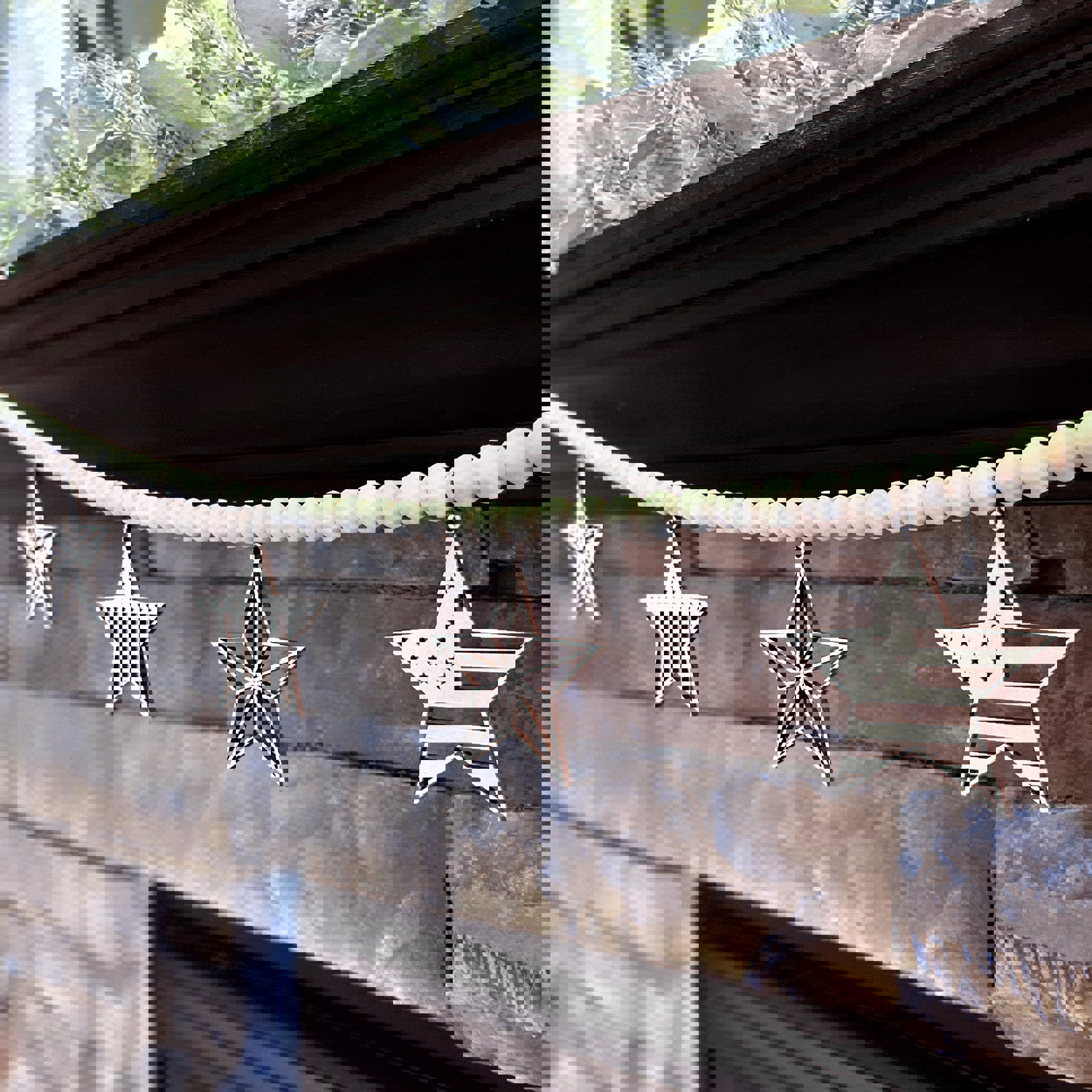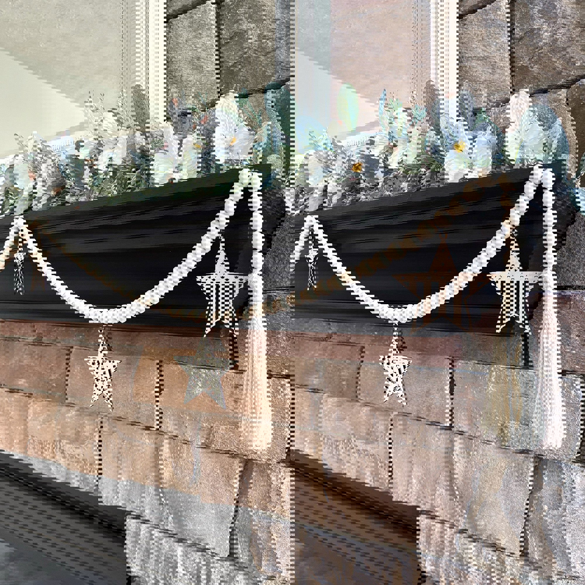 The Barn Star natural wood beaded garland is the perfect upgrade to your rustic chic or modern farmhouse decor! This garland features laser cut wood "barn star" charms for added patriotic adornment - it's the perfect decoration for 4th of July, Memorial Day, or every day! The charms are designed and hand crafted exclusively in the Inspired Indigo studio, and they can be removed and changed out seasonally for year-round decor!