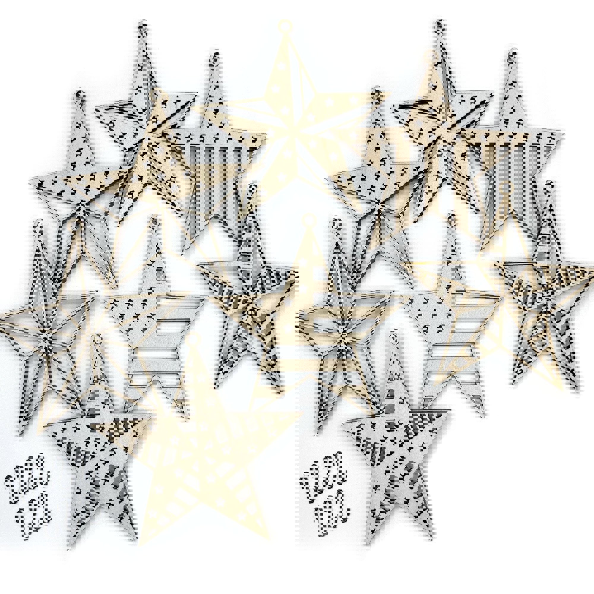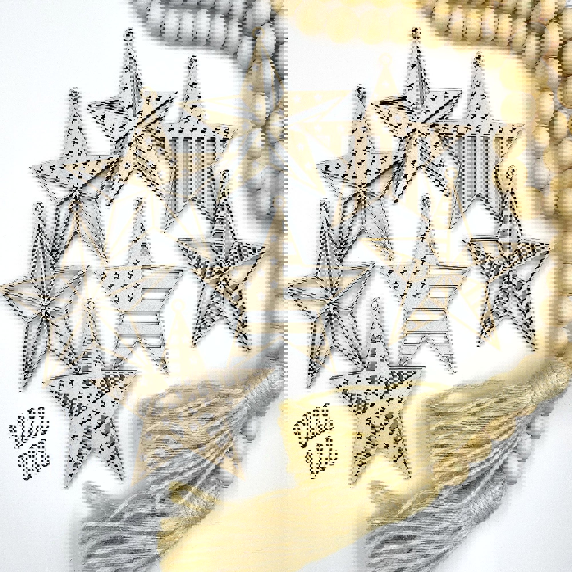 * 7 unique, laser cut "barn star" charms that measure 3.25" x 3.25", laser cut from maple wood.