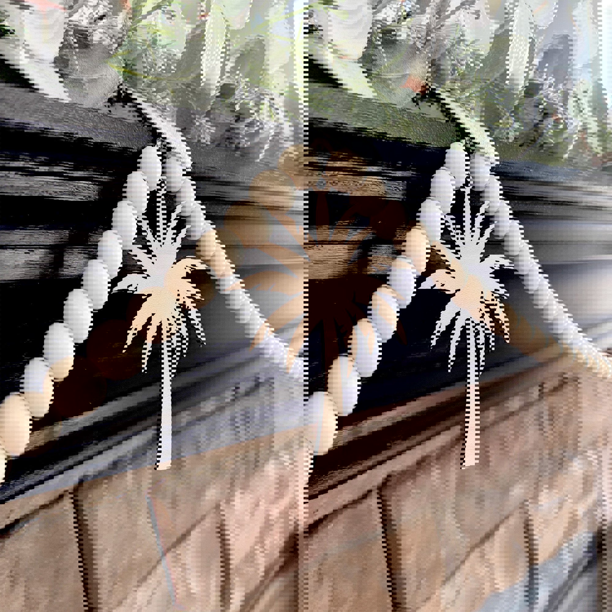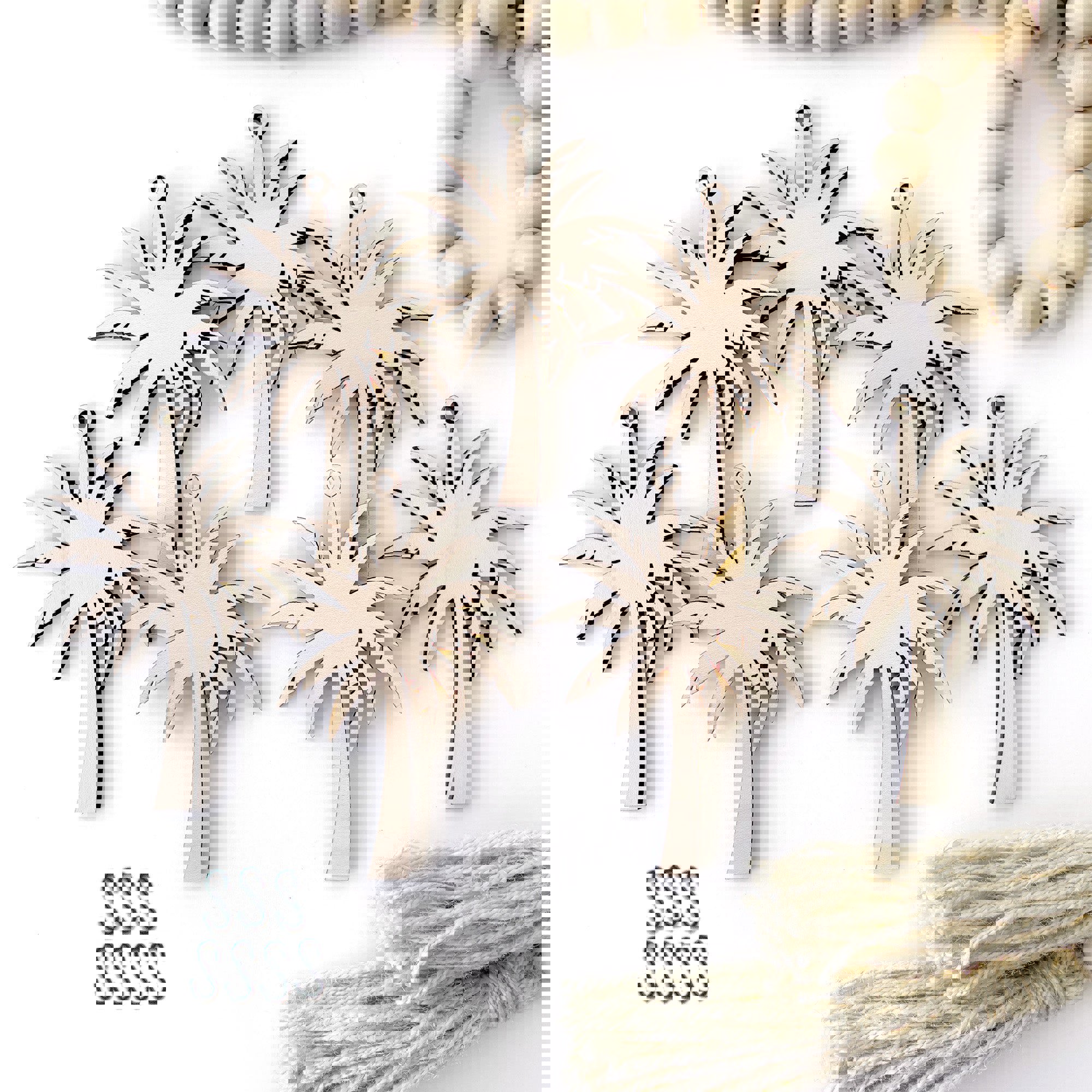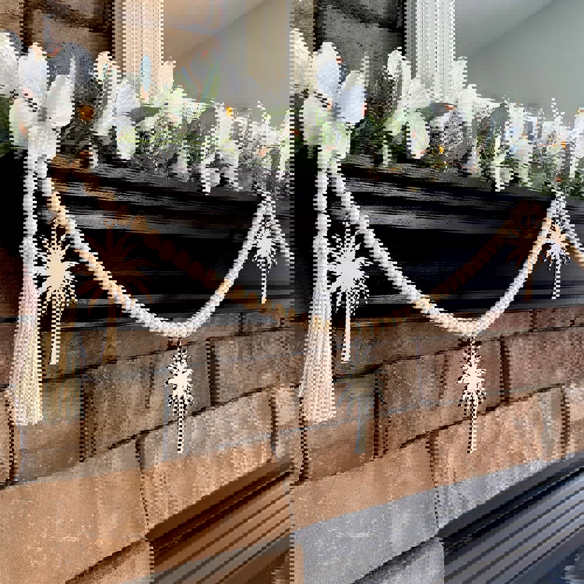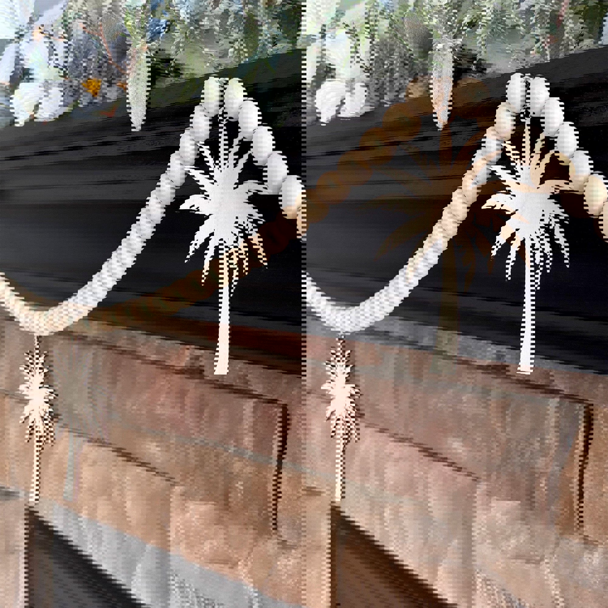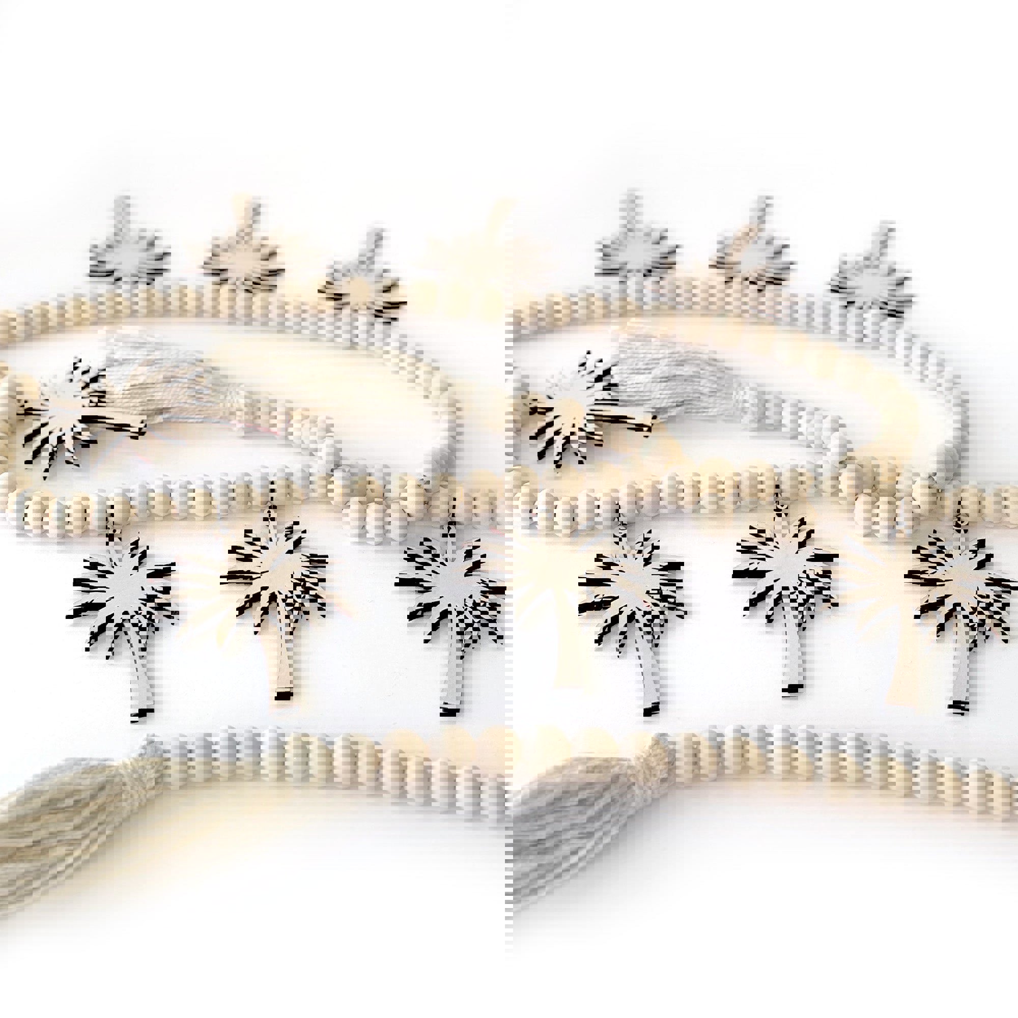 * This garland features laser cut wood palm tree charms hanging from a natural wood bead garland.