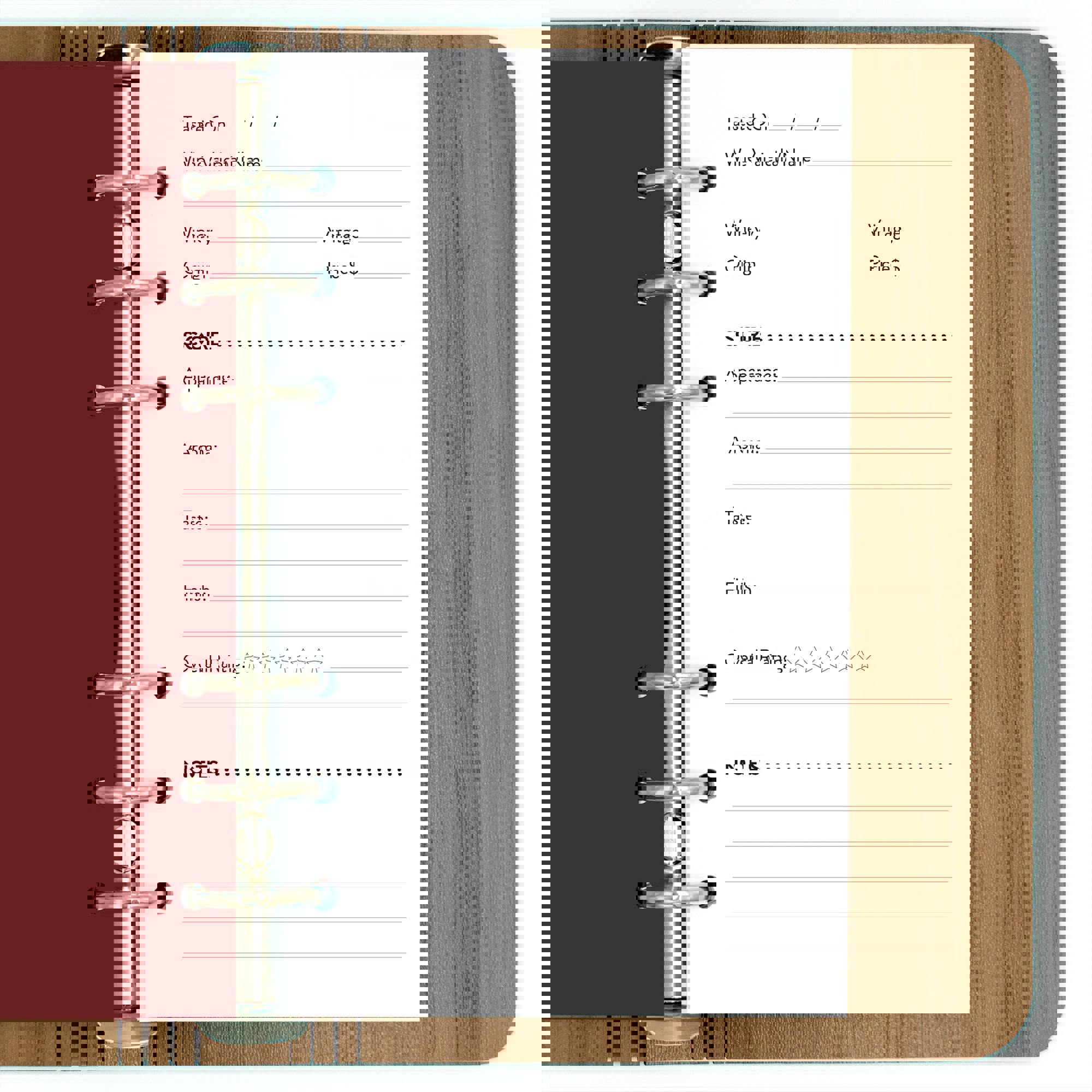 Stocked: The book arrives equipped with 40, double-sided, custom-designed tasting note pages.