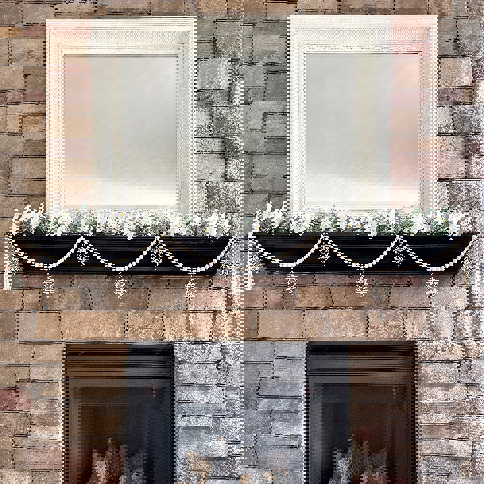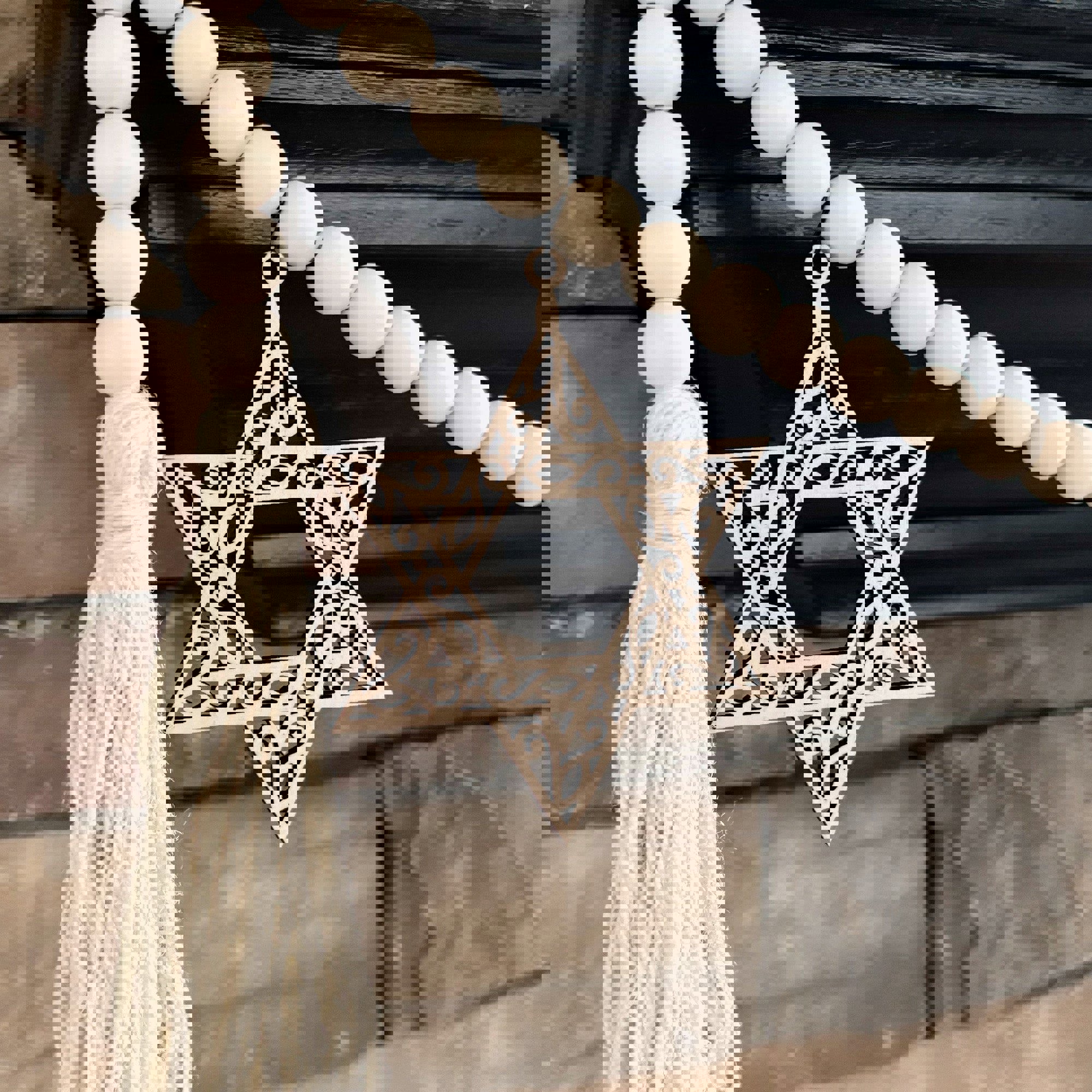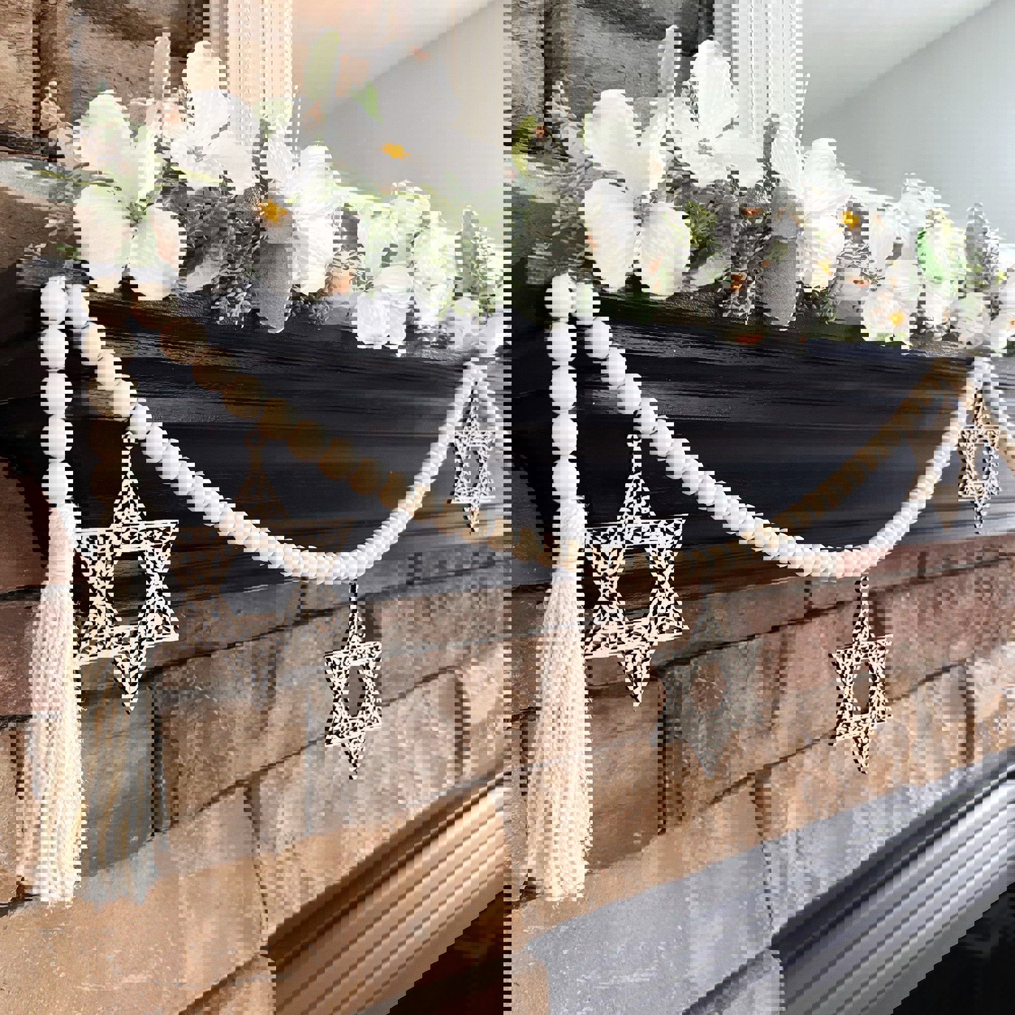 * The Star of David natural wood beaded garland is the perfect accent for your rustic chic or modern farmhouse decor!