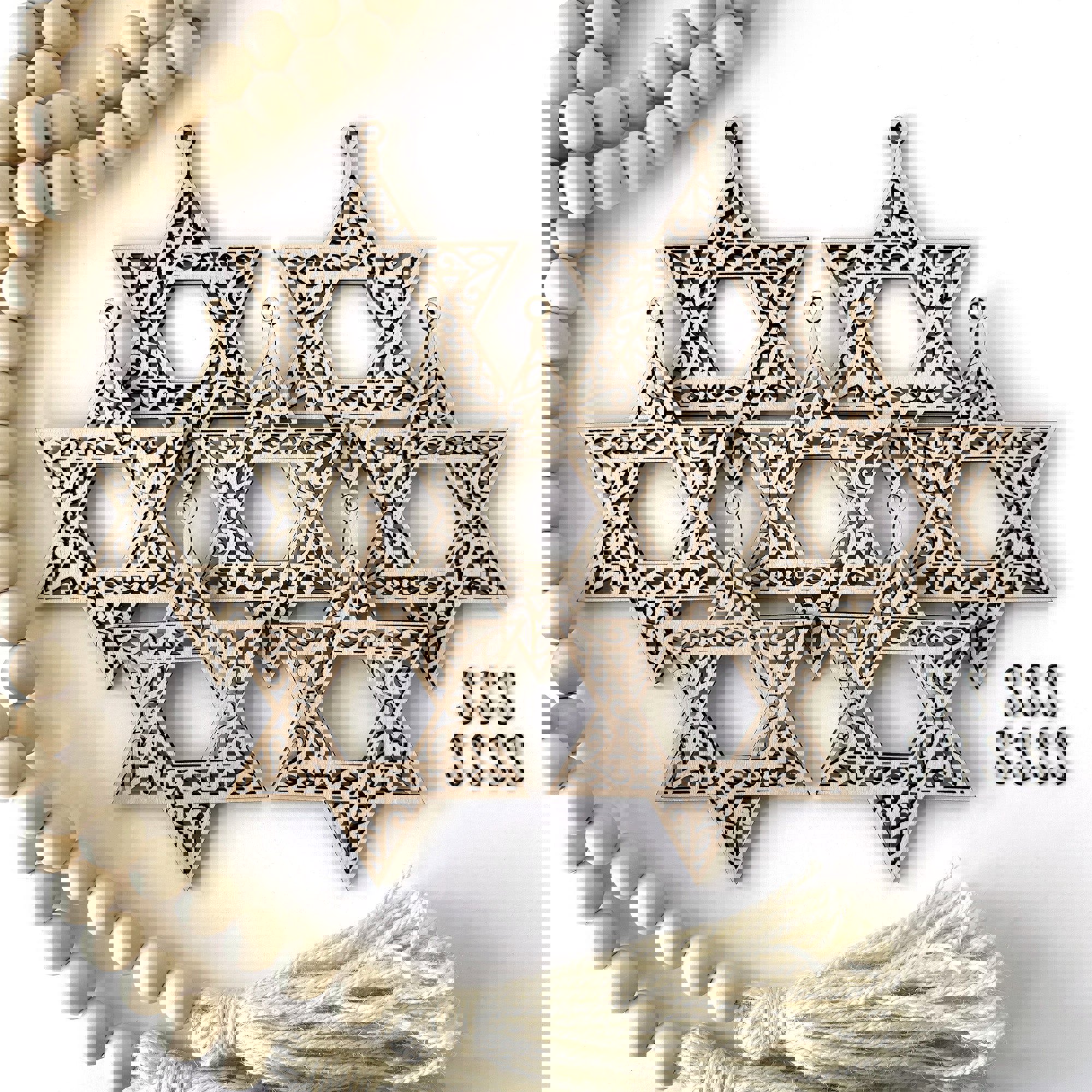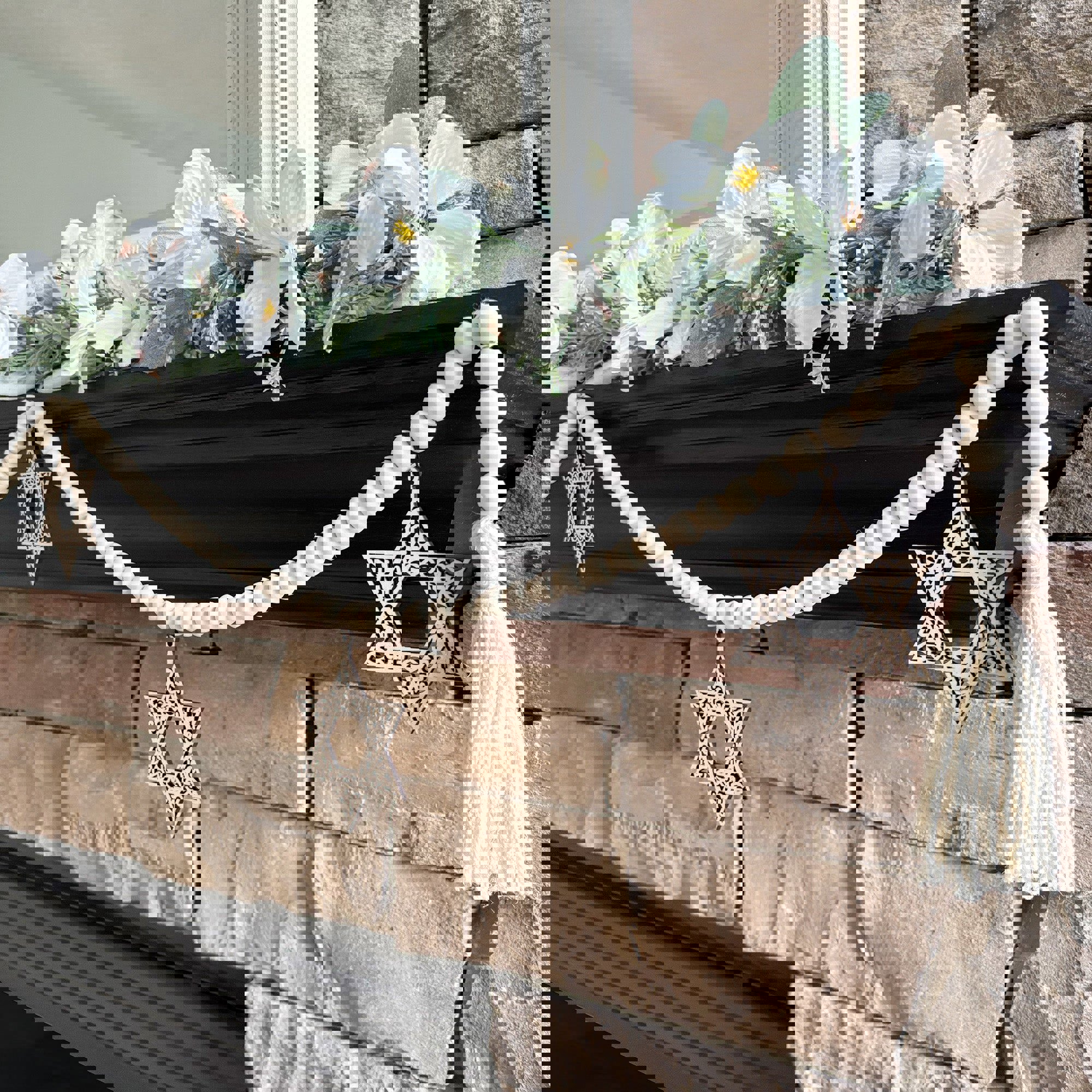 * This garland features laser cut wood Magen David charms to enhance your home at Passover, Hanukkah, or every day!