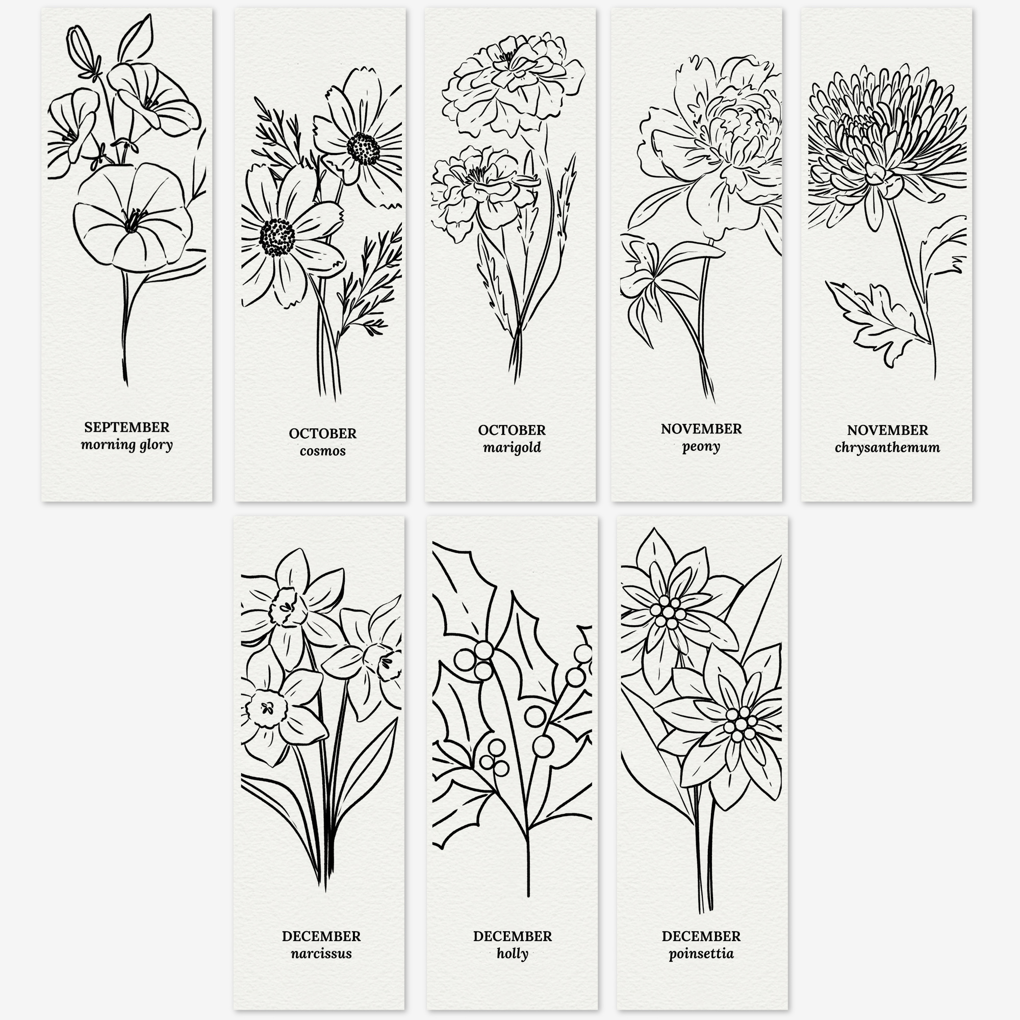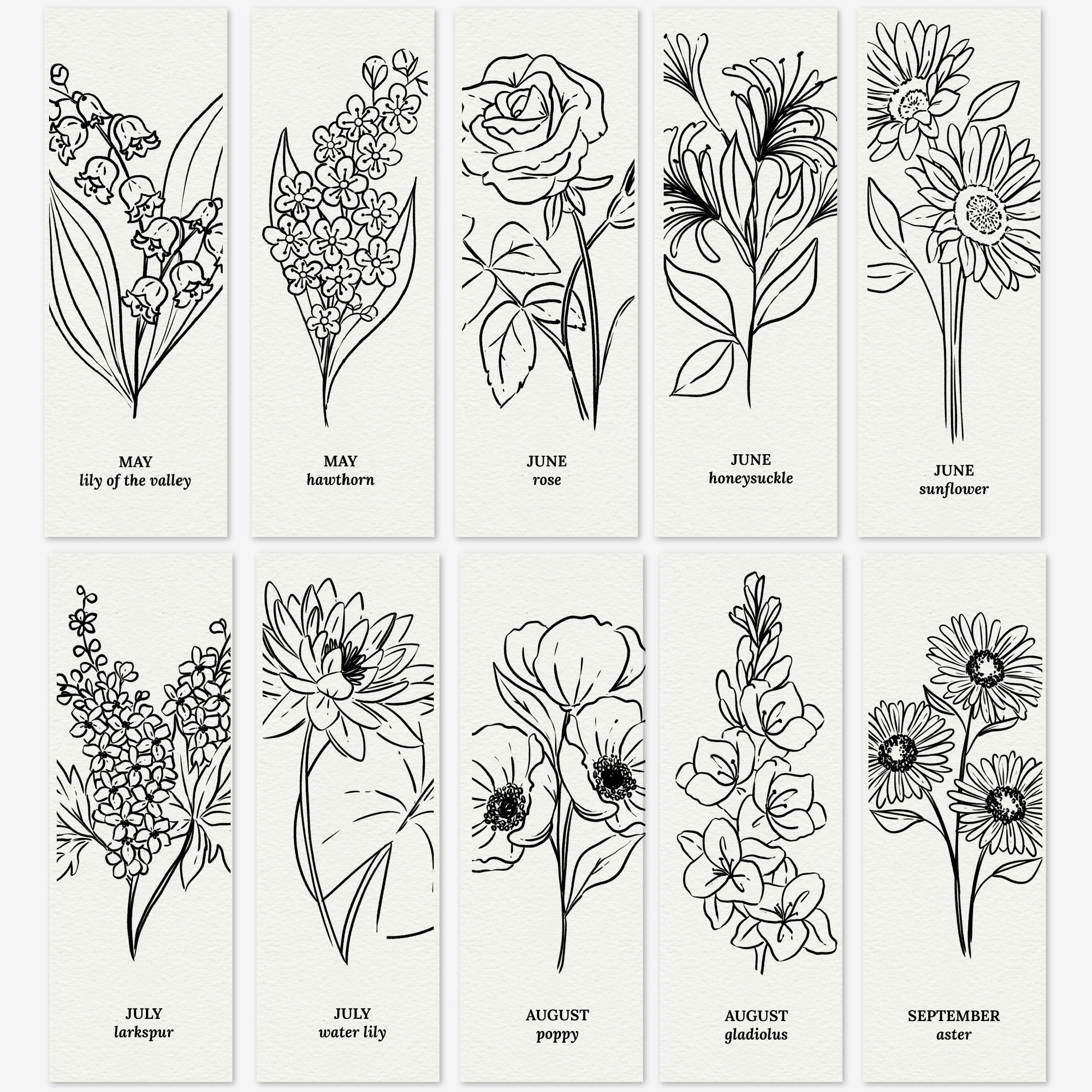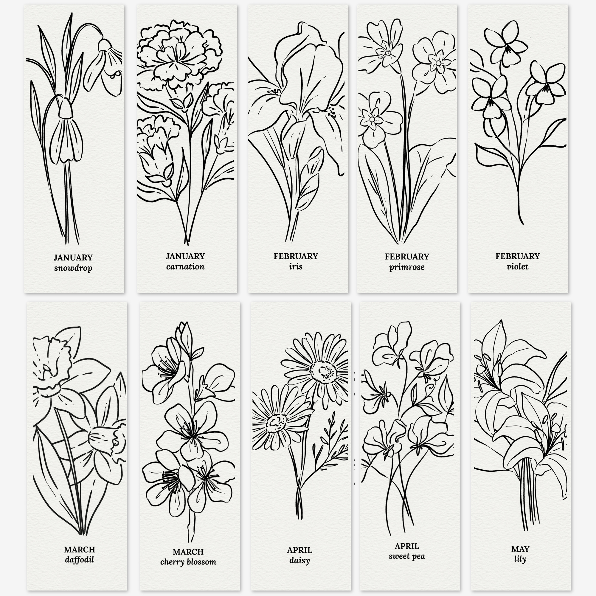 - Flower name + month on each birth flower sketch.