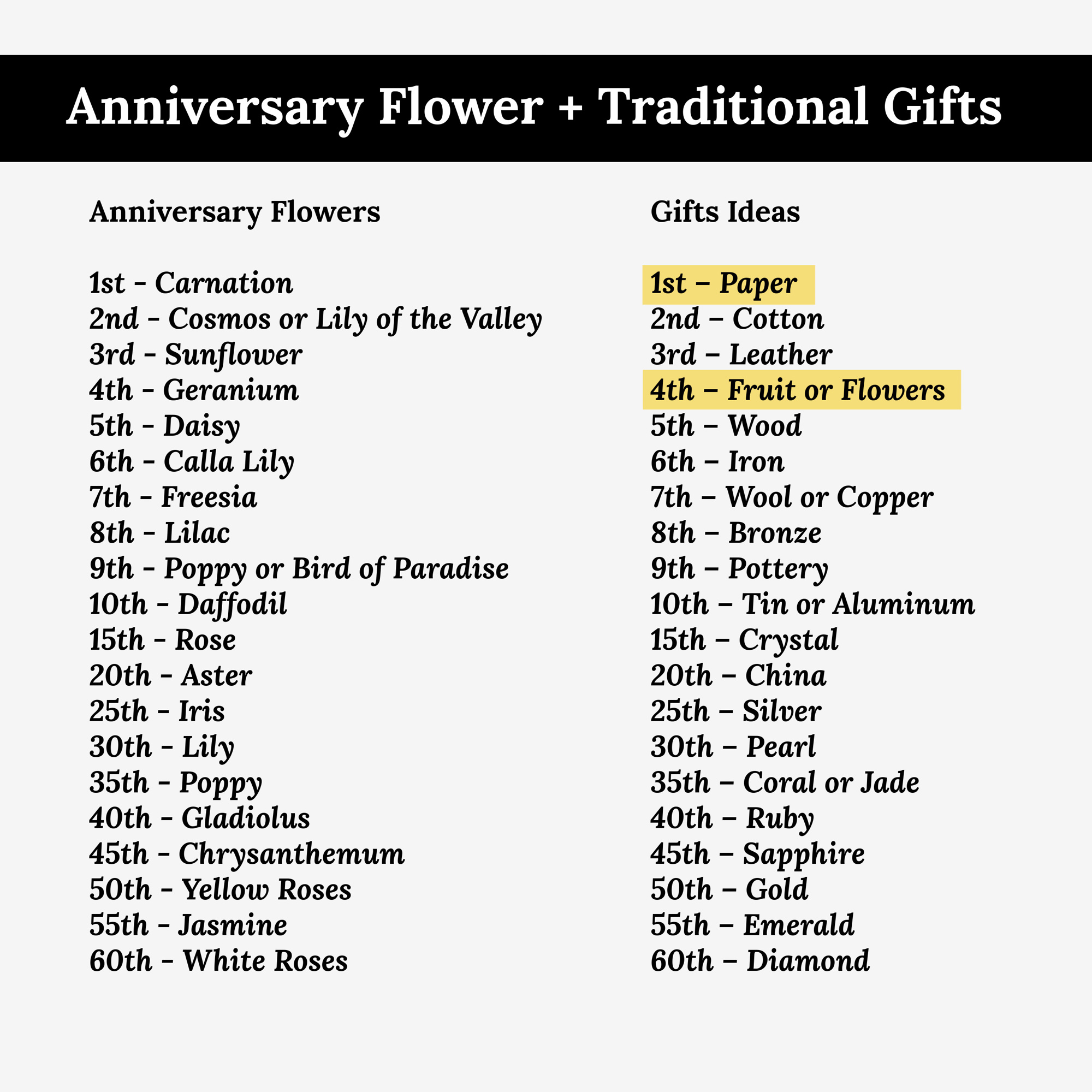 - Wedding gifts & anniversaries. Traditional gifts for 1st anniversary is paper and 4th anniversary is flowers.