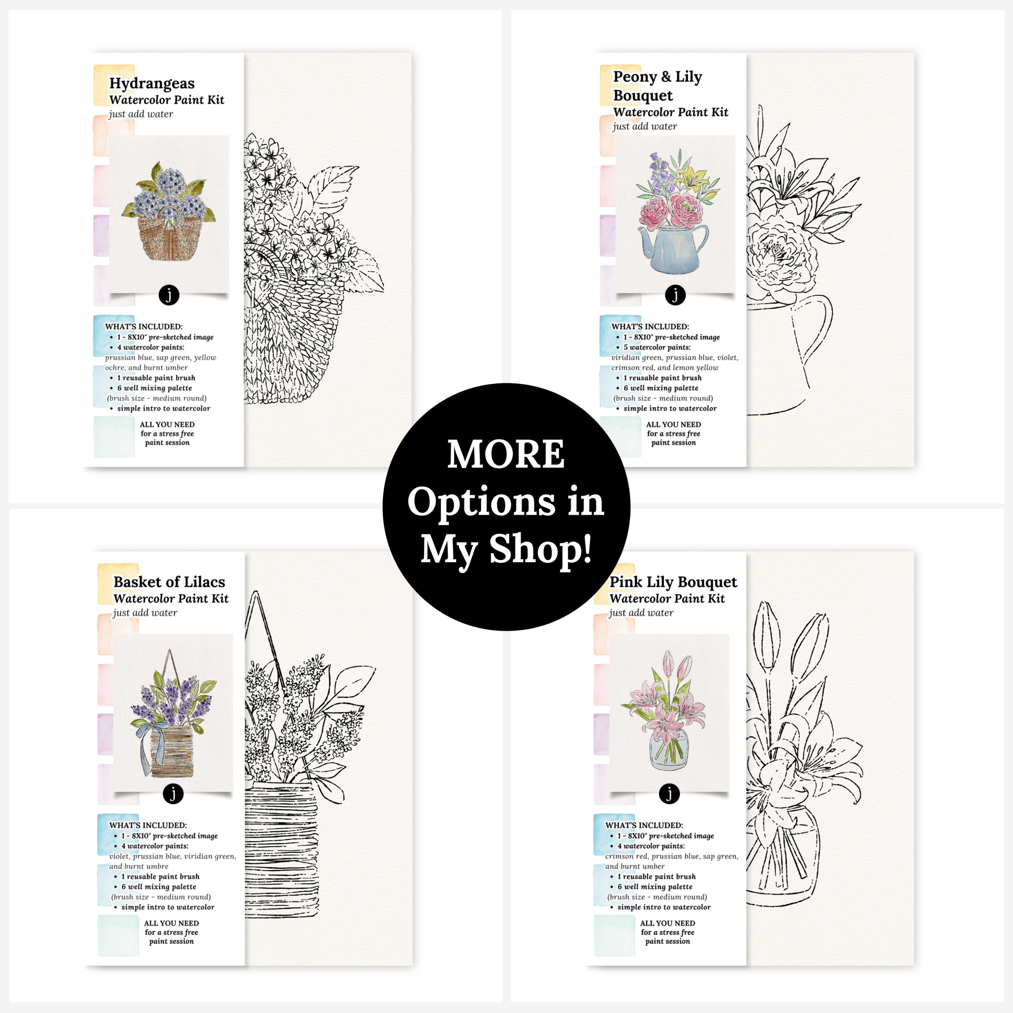 Pink Lilies in a Vase watercolor paint kit. Everything you need for a fun, relaxing painting session in one kit! Just add water... and snacks are always a good idea. Pick your brush and find a new love for watercolor.