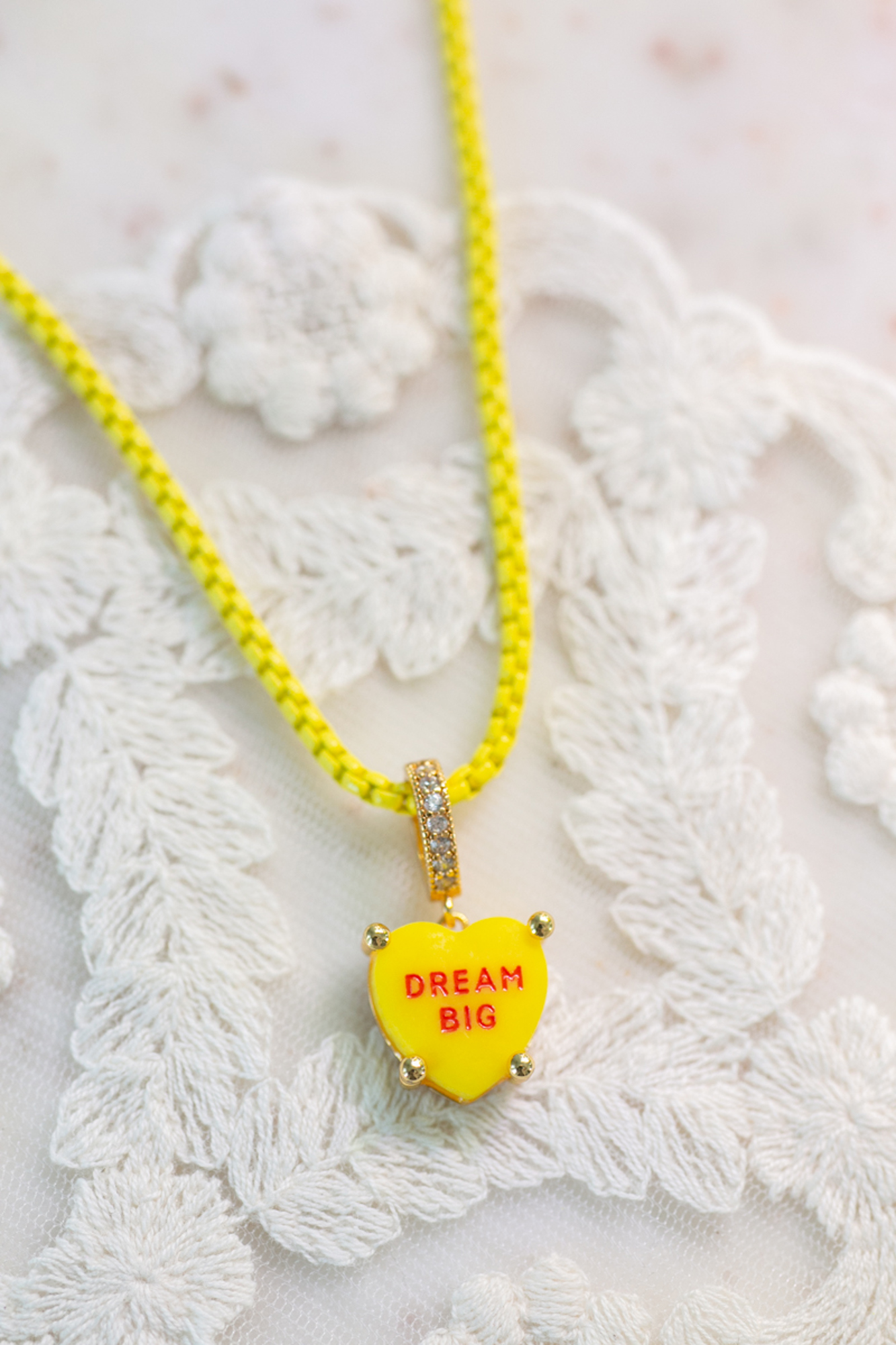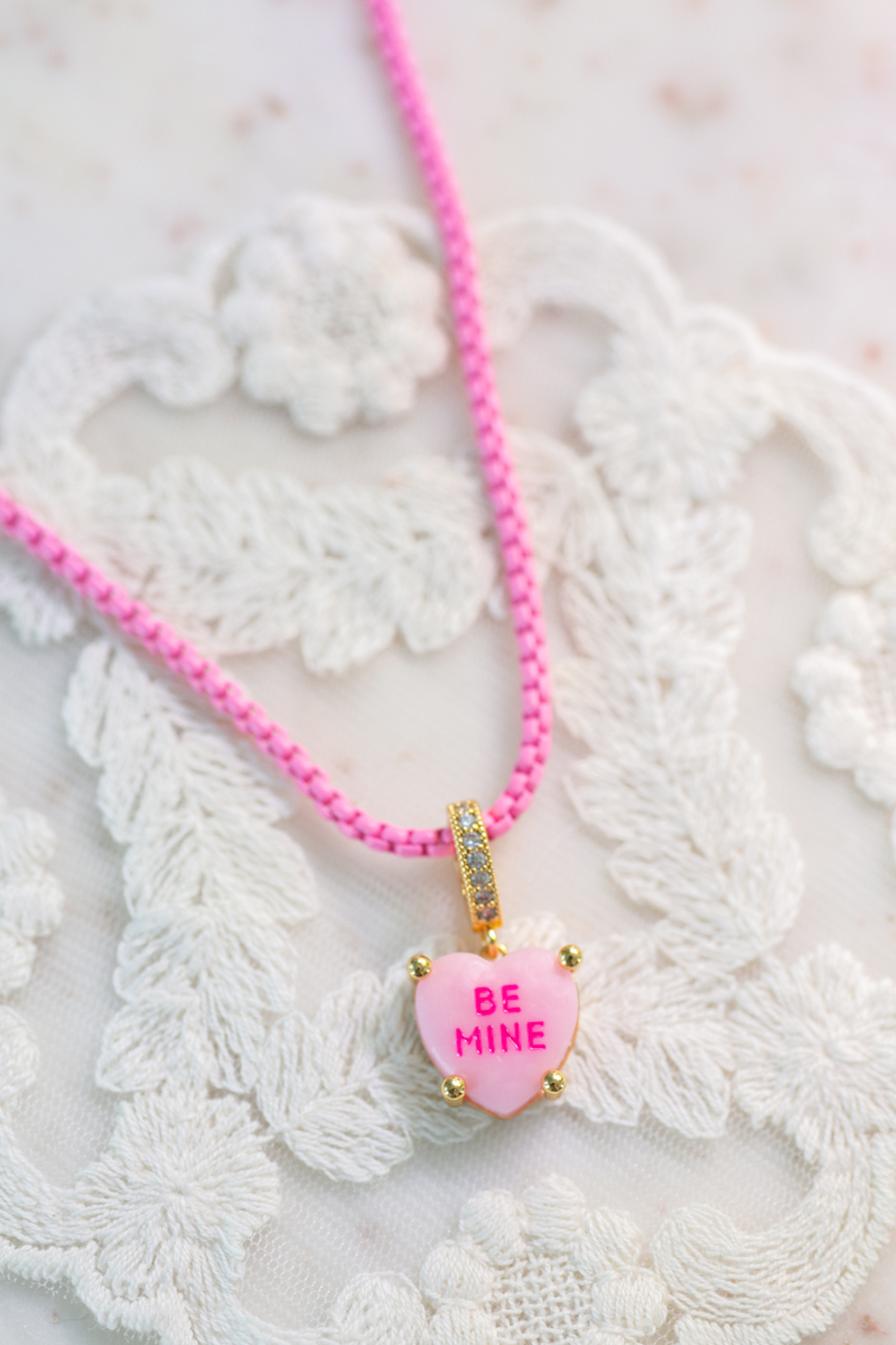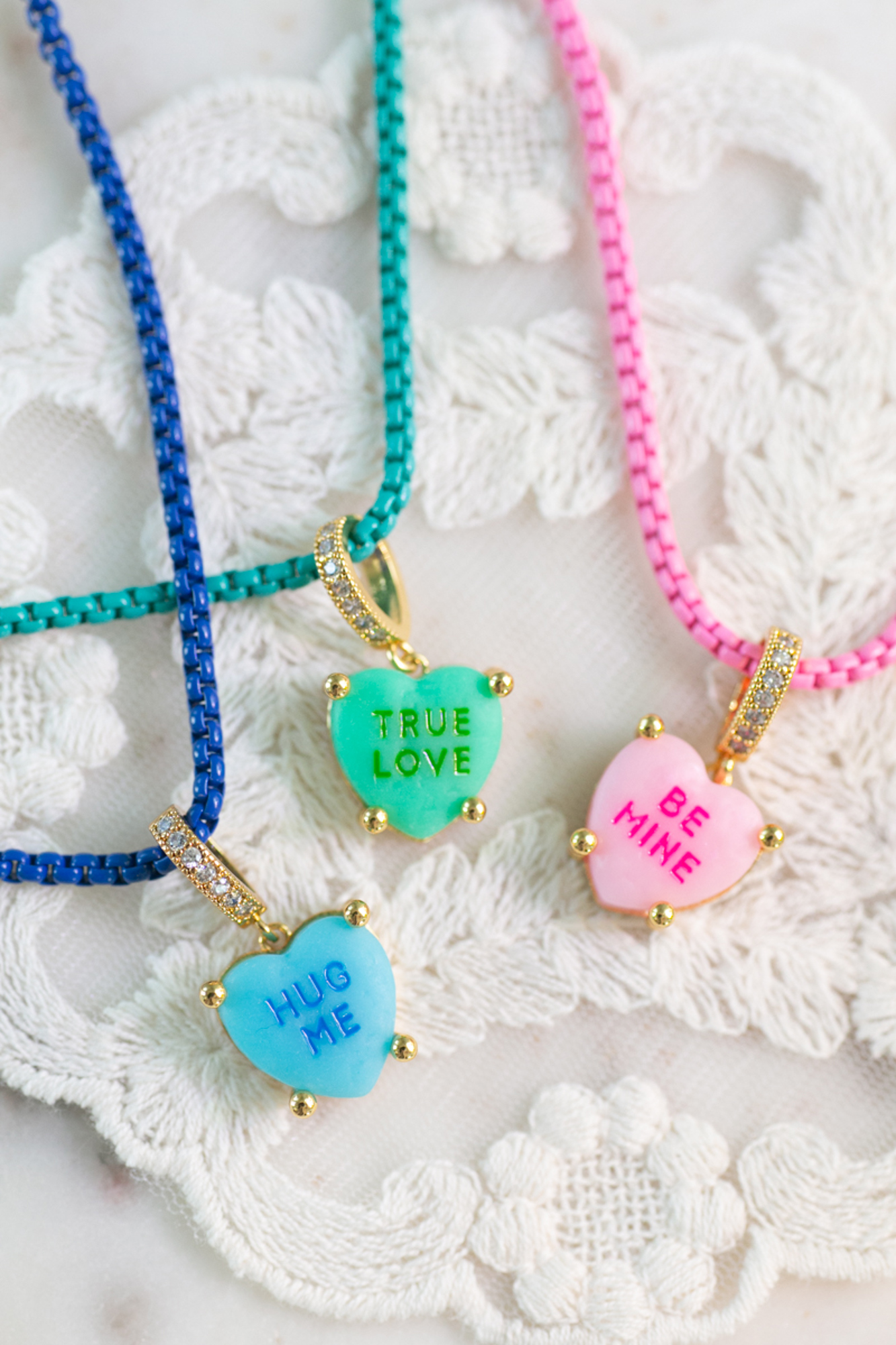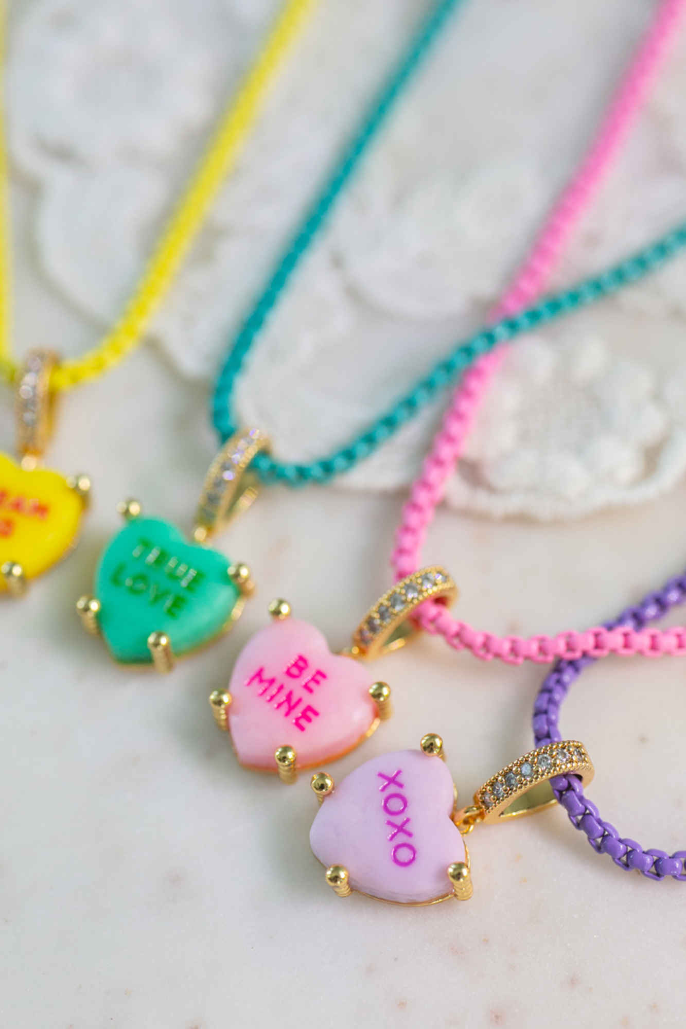 Add a playful pop of color and charm to your jewelry collection with our Colorful Conversation Heart Necklaces! These delightful pieces feature vibrant heart-shaped pendants, each adorned with classic messages like "Be Mine," "Dream Big," and "XOXO." Perfect for spreading love, sharing sweet sentiments, or simply adding a fun and nostalgic touch to your outfit.