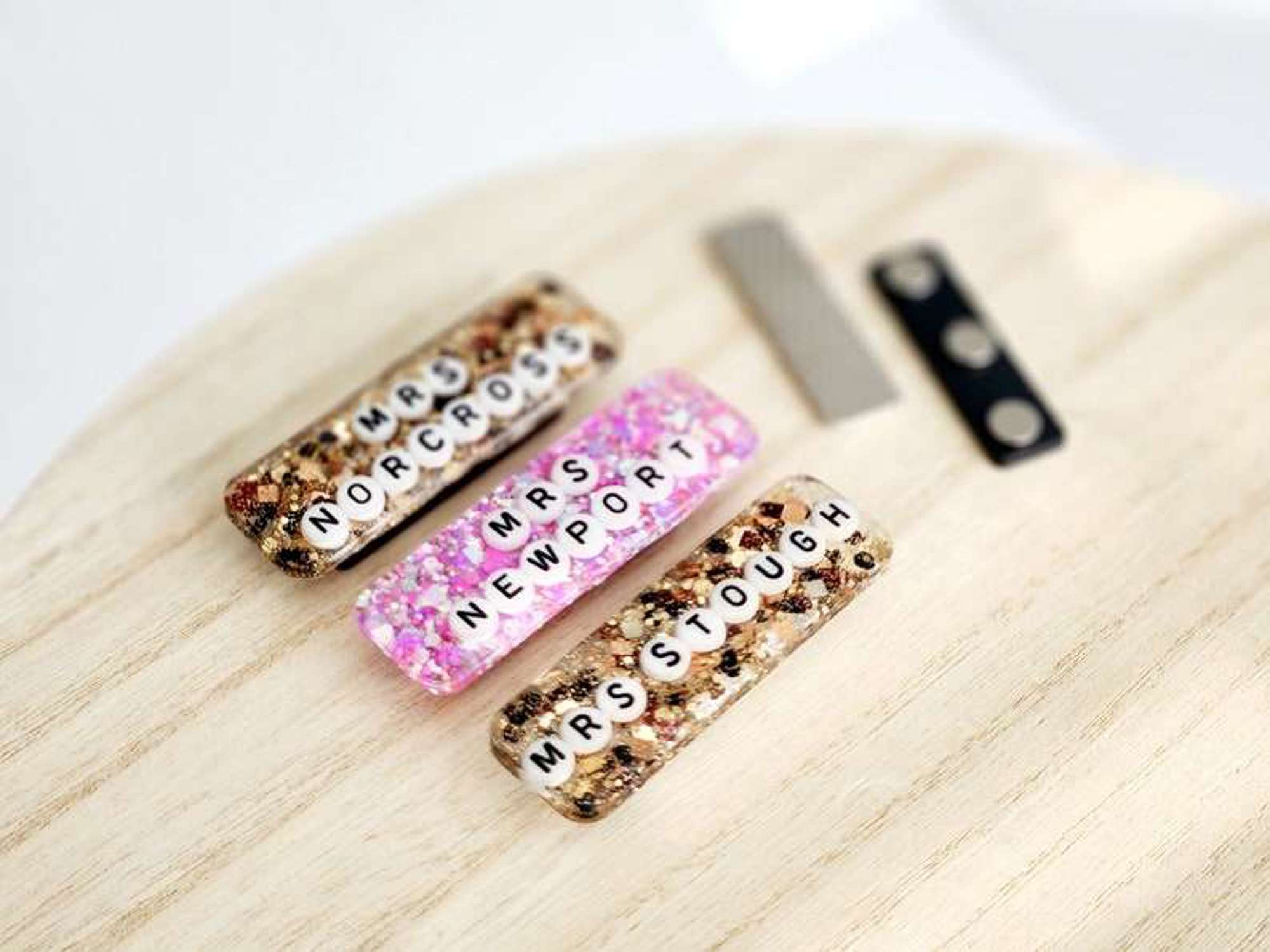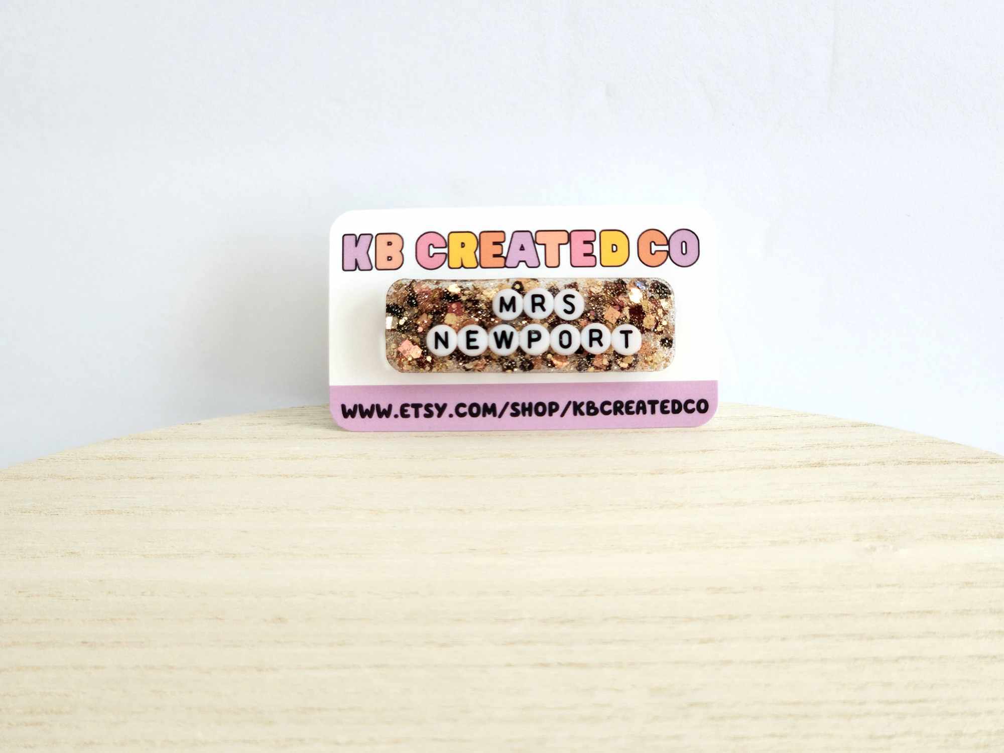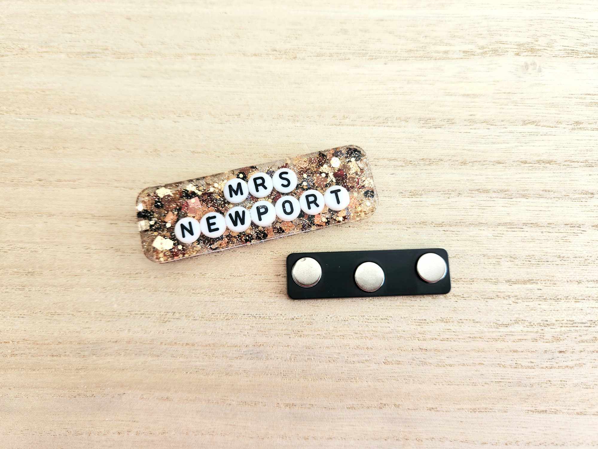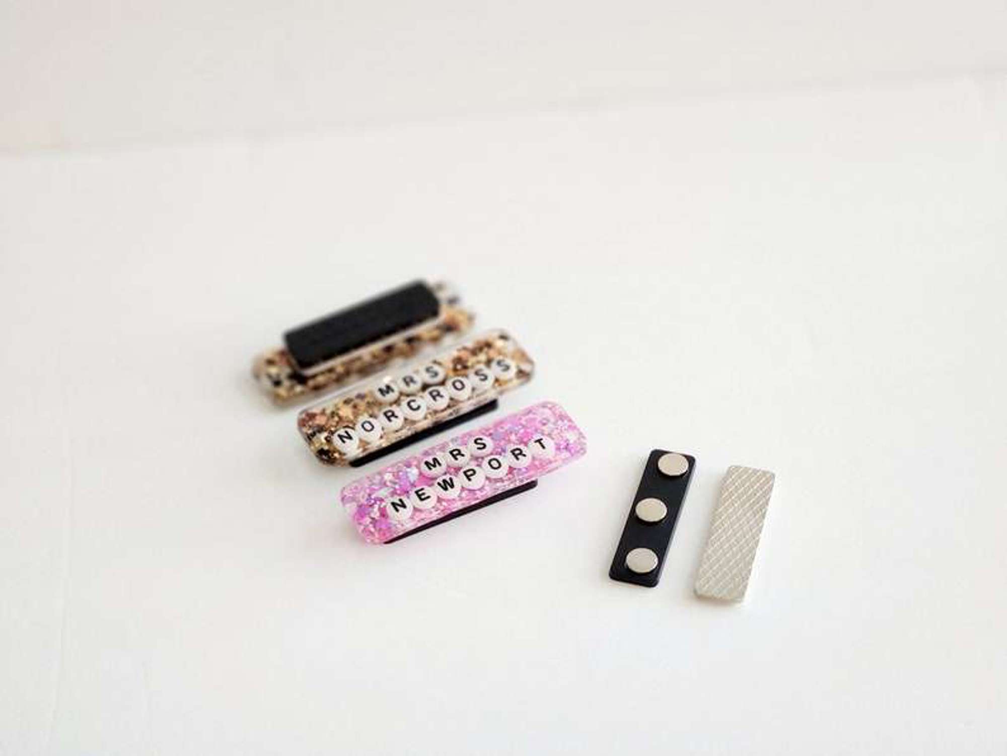 The perfect gift for teachers! Your choice of 6 glitter mixes made personalized for your favorite teachers! Each name tag comes with a strong secure magnet on the back for easy off and on.