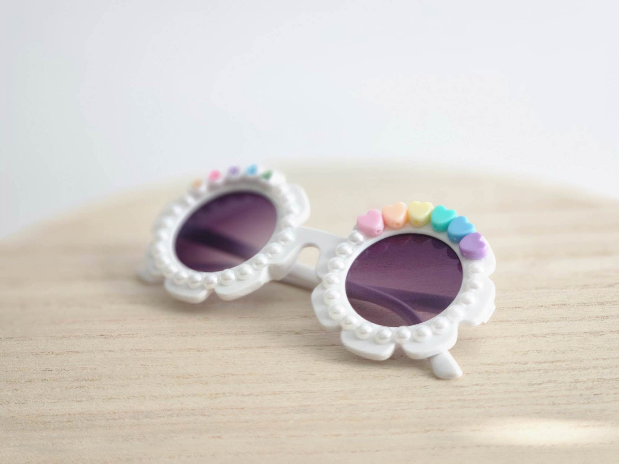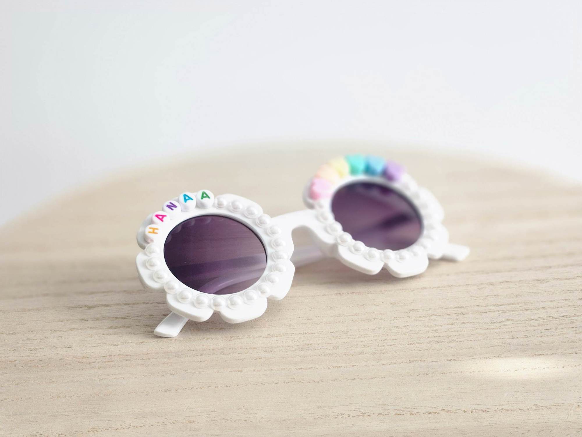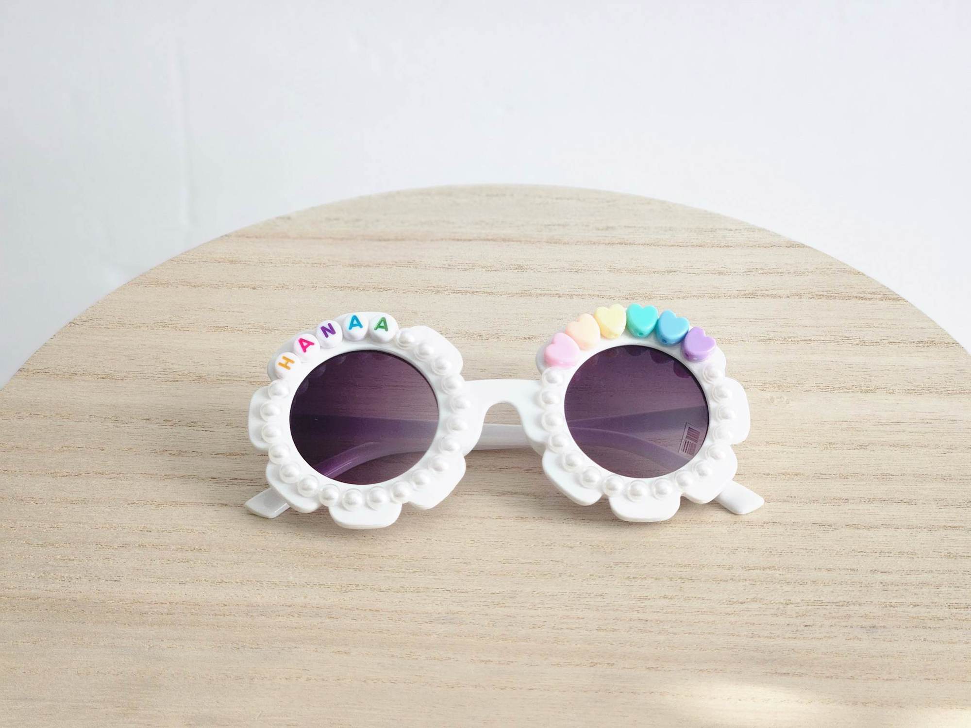 The cutest sunnies! Personalized with your little ones name in colorful beads and pastel hearts. These fit age range 2 to 10 well.