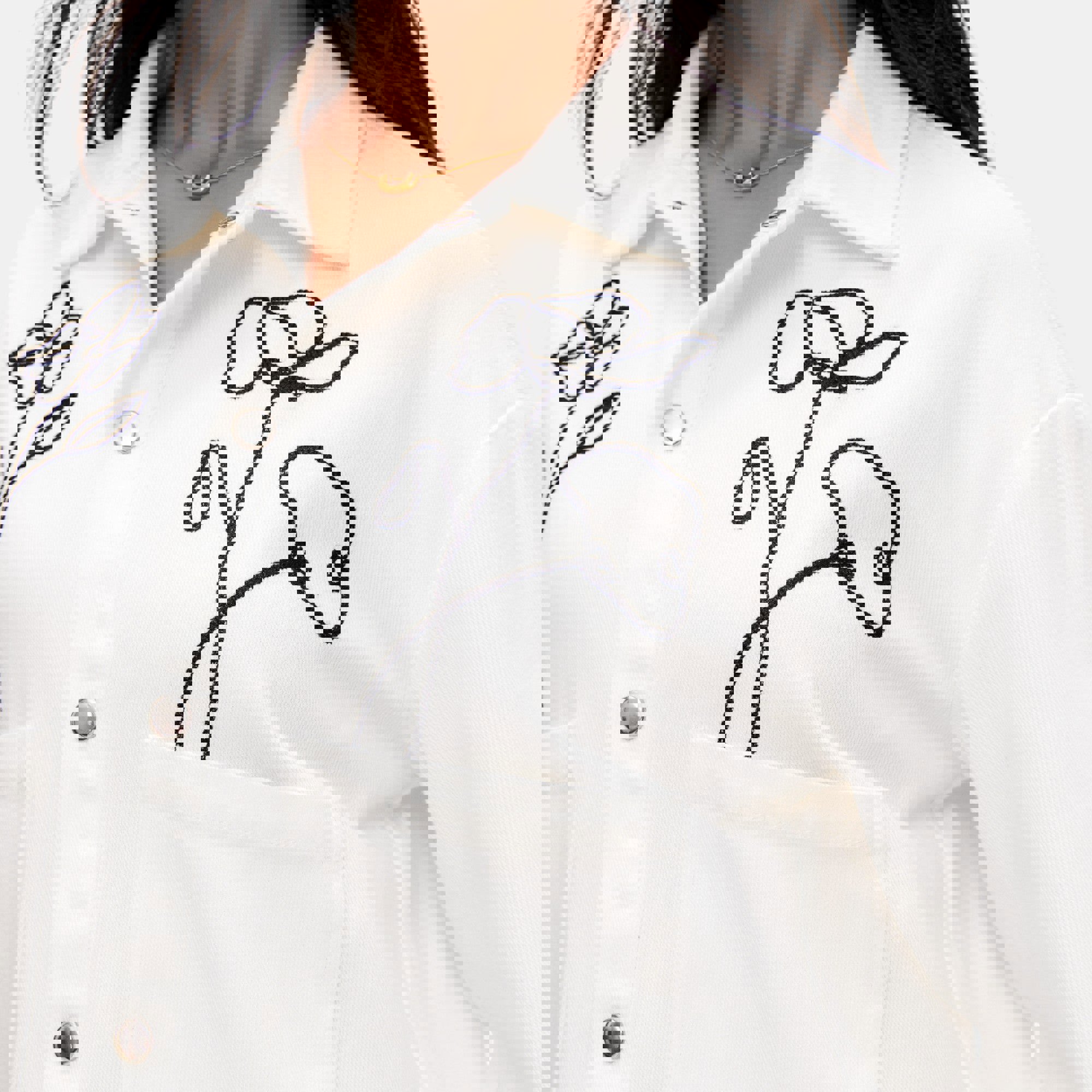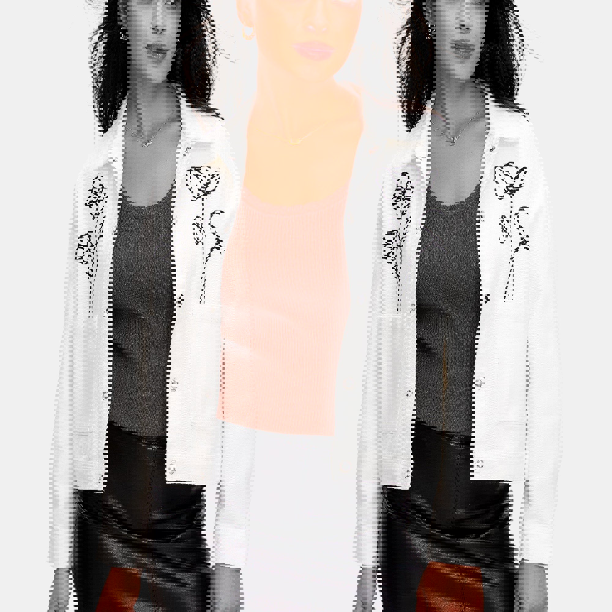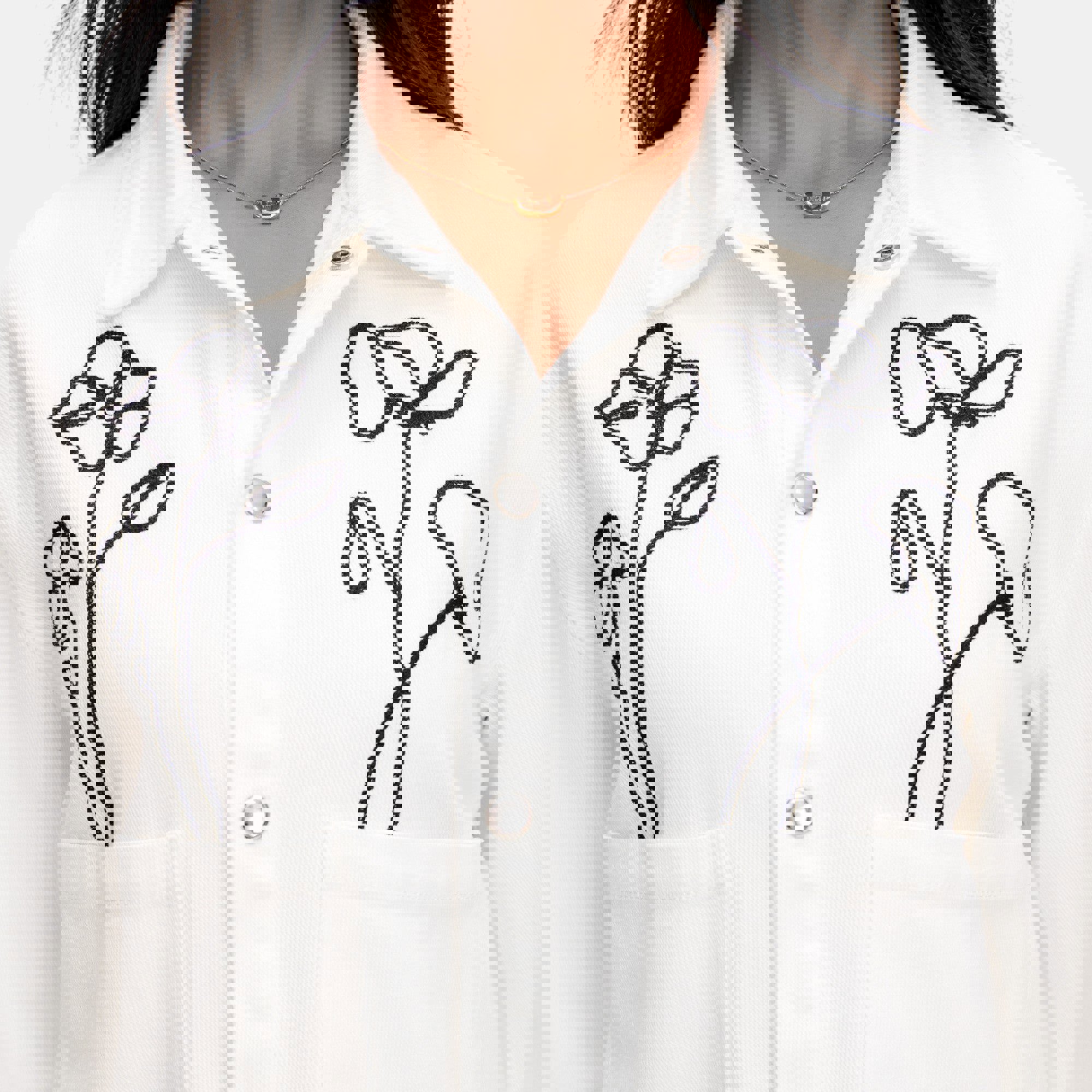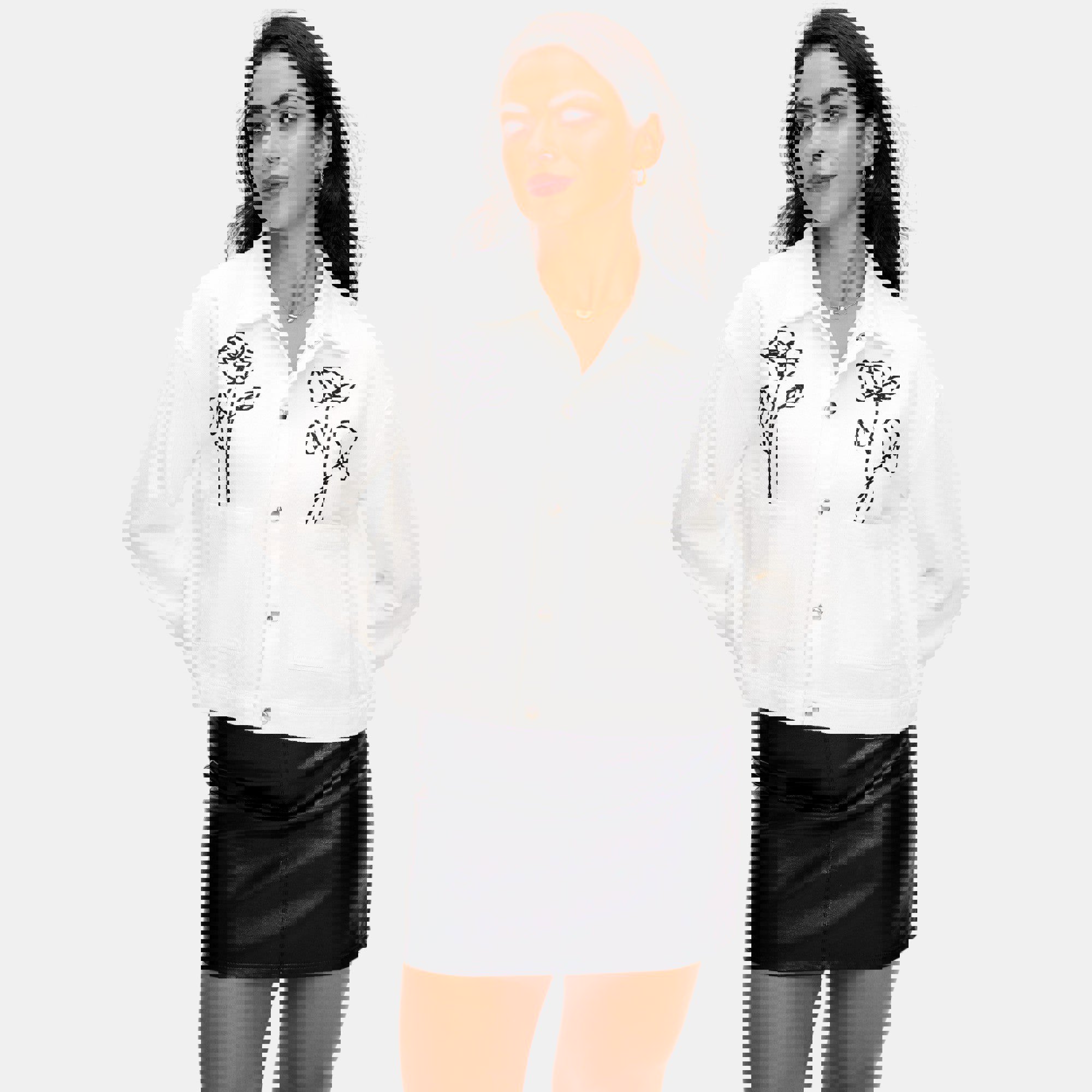 This embroidered button front jacket features a soft structured feel with a clean classic silhouette perfect for everyday layering. The floral outline detail adds a stylish artistic touch while the front patch pockets offer both function and charm. Designed with a versatile collar and easy fit it pairs effortlessly with denim skirts or basics making it an ideal layer for casual chic outfits.