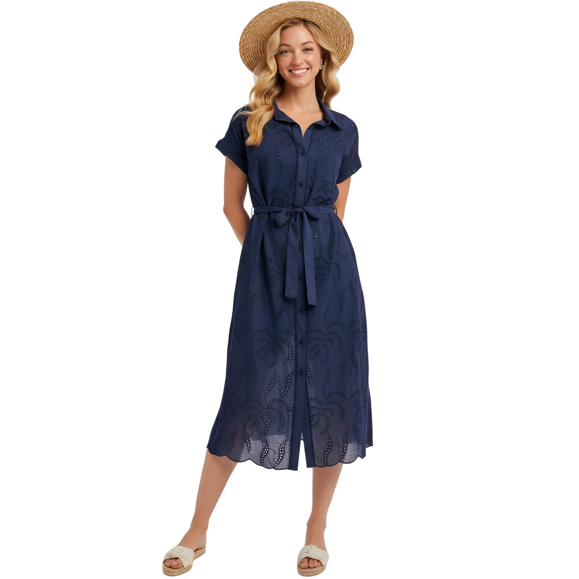 Eyelet Button Front Midi Dress with Soft Lightweight Feel Short Sleeves Tie Waist Detail Flattering Collared Neckline