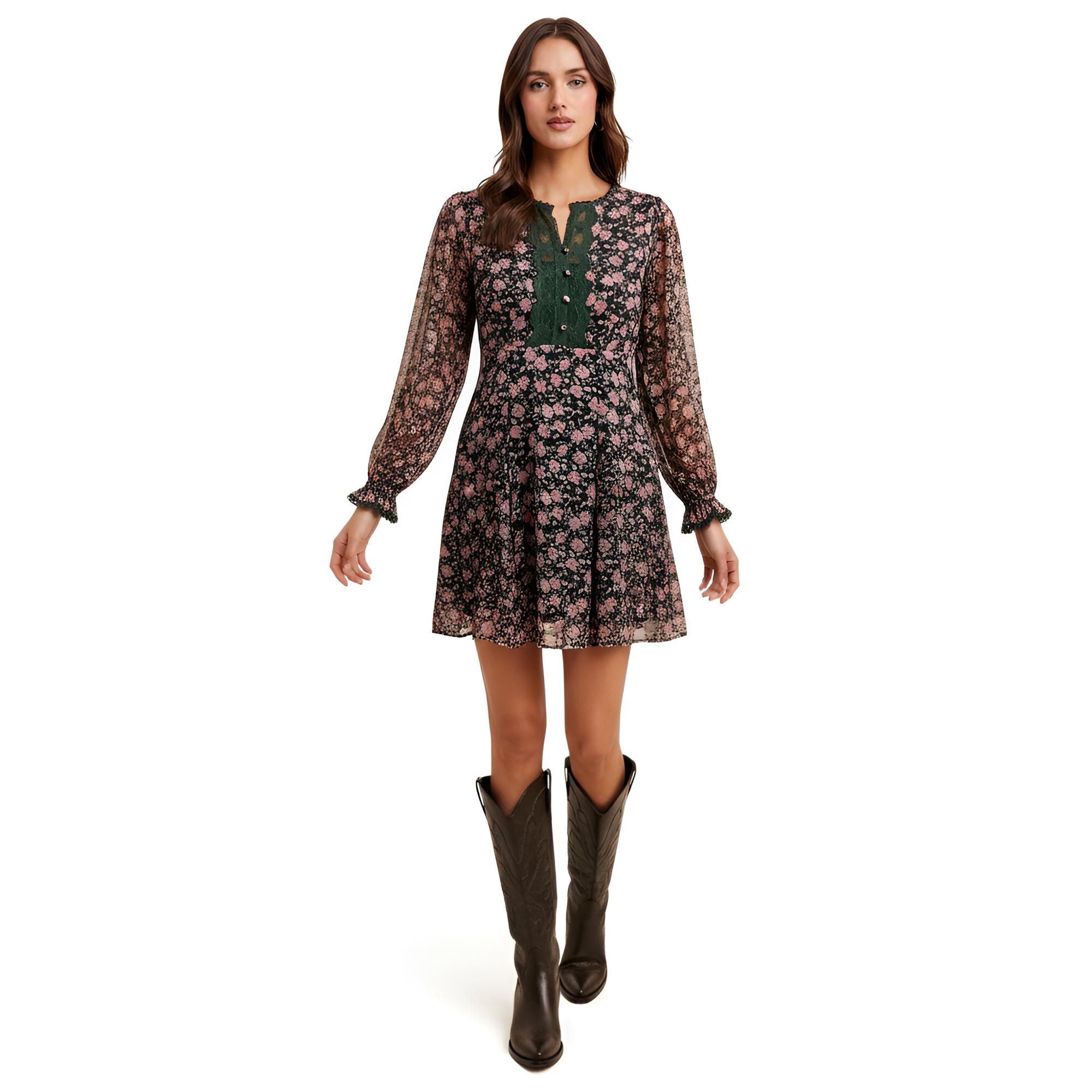 This long sleeve floral mini dress features a soft lightweight chiffon fabric with a flattering smocked waist and flowy silhouette for effortless movement. The contrast lace trim along the V neckline adds a charming feminine touch while the semi sheer sleeves keep the look airy and polished. Perfect for brunch events date nights or seasonal outings this dress pairs beautifully with boots or heels.