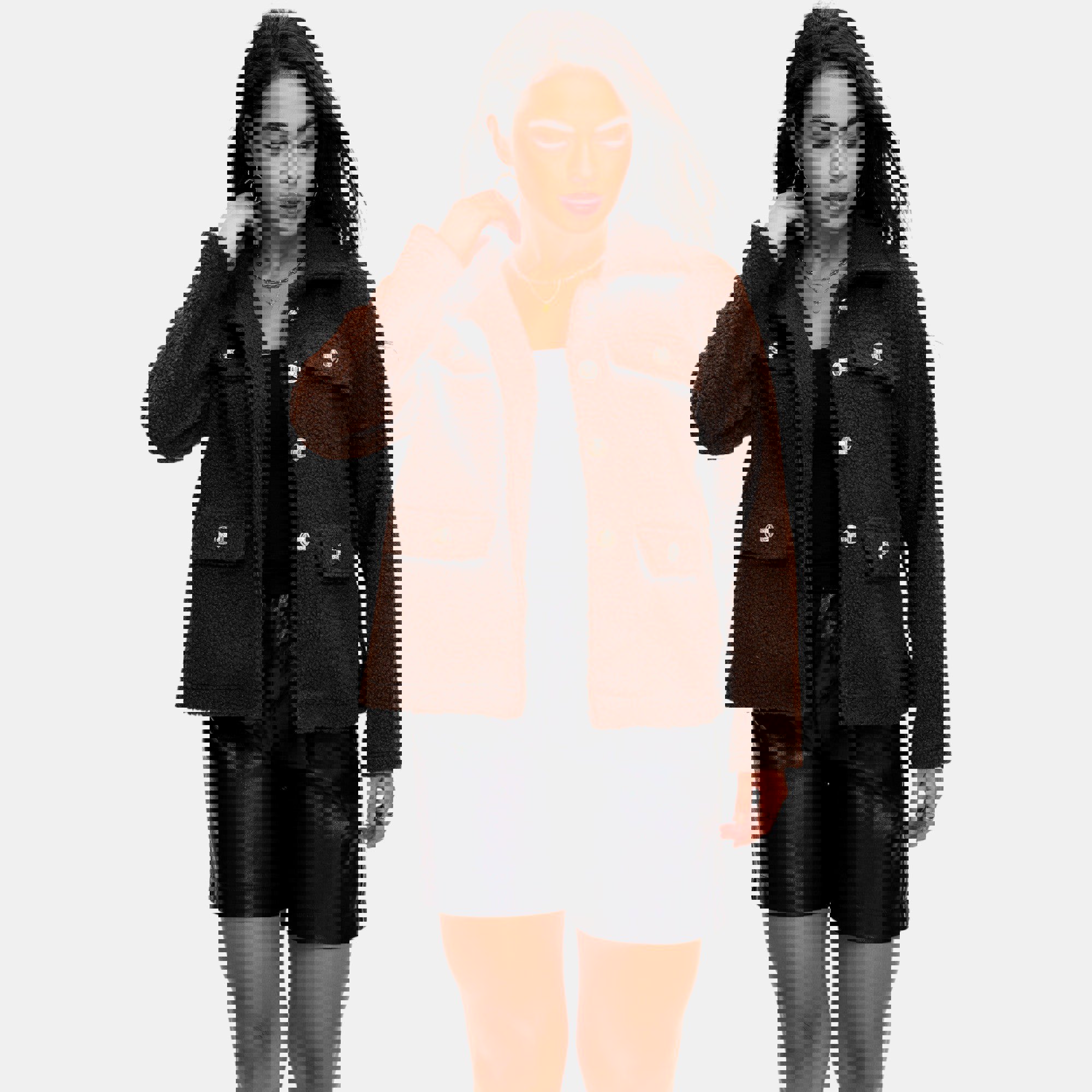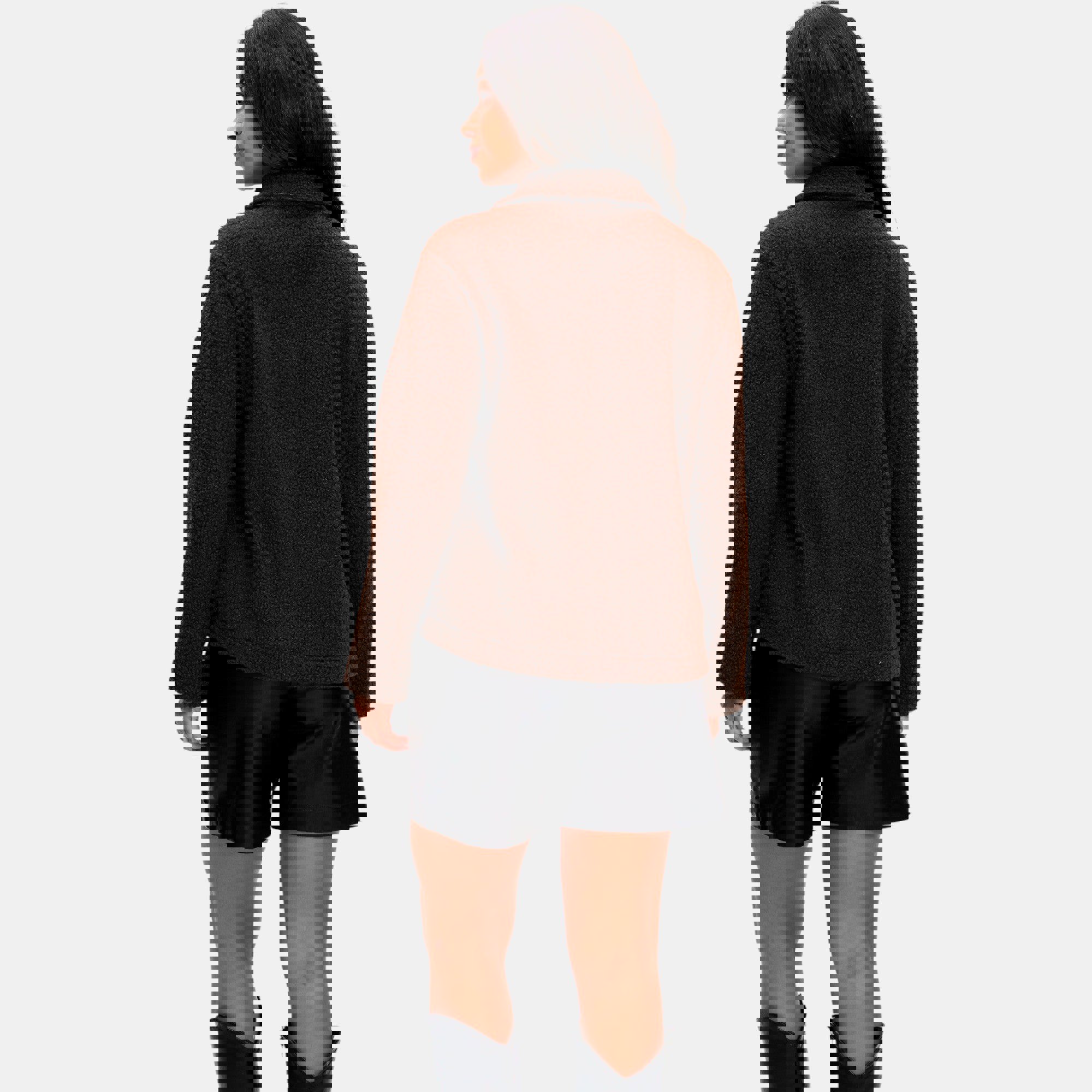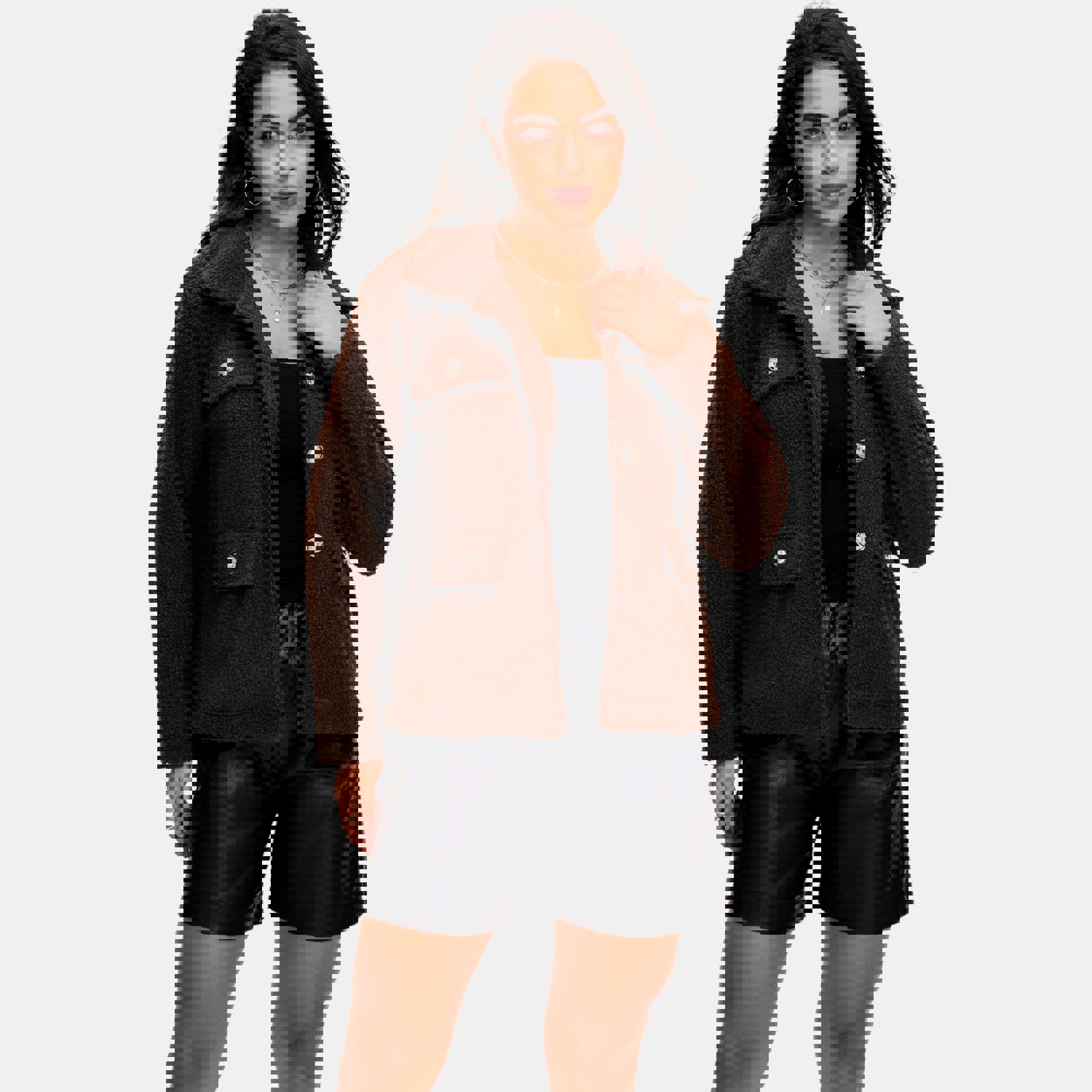 This textured fleece jacket offers a soft cozy feel with a relaxed silhouette that layers effortlessly over casual outfits. The button front closure and collared neckline add a polished touch while the front patch pockets bring both function and style. Perfect for cooler days this versatile jacket pairs easily with denim leggings or shorts making it a comfortable go to layer for everyday wear.
