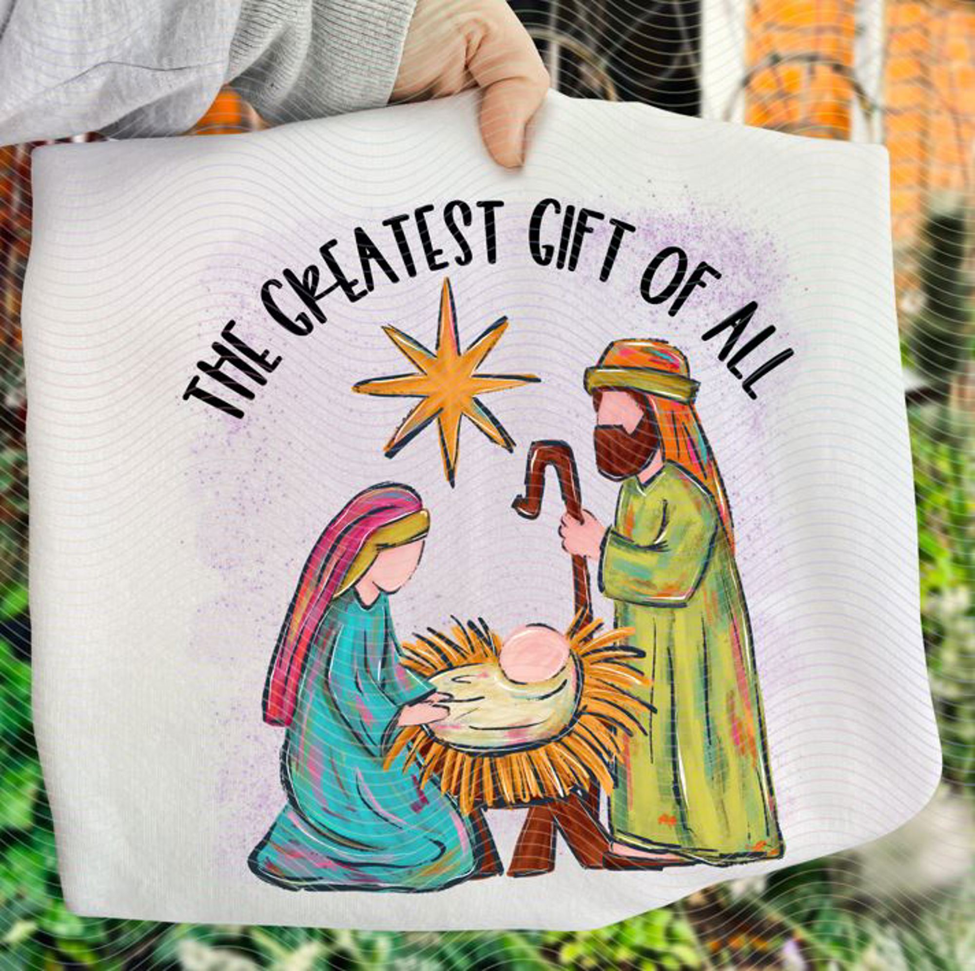 Celebrate the true spirit of Christmas with our Greatest Gift Tshirt! Featuring a joyful nativity design, this tee playfully reminds everyone that the greatest gift of all is Jesus. Perfect for spreading holiday cheer in a fun and meaningful way, it makes a wonderful addition to your festive wardrobe or a thoughtful gift for loved ones. Comfortable and charming, this shirt keeps the season bright and joyful.
