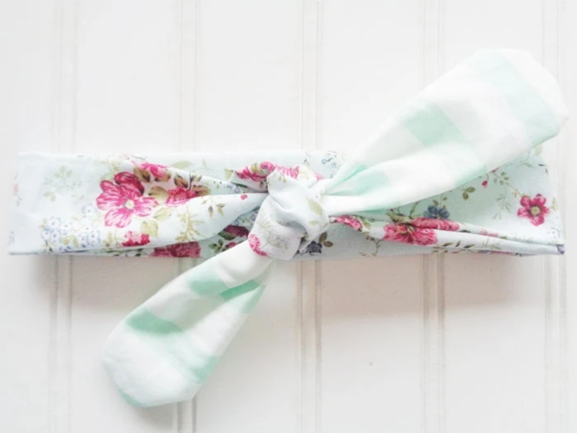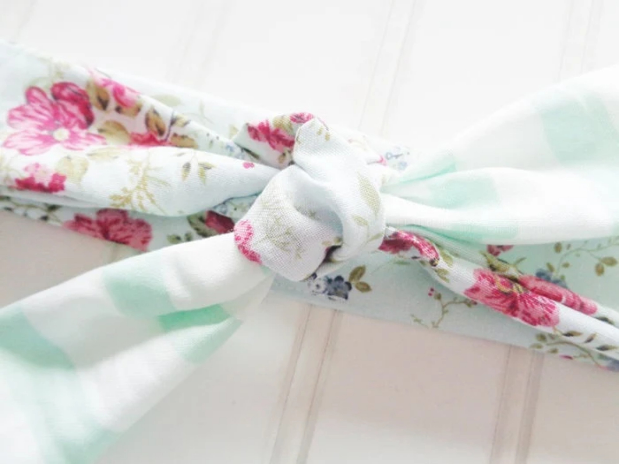 Sarah Knotted Headband - Floral on Blue with Mint Stripes