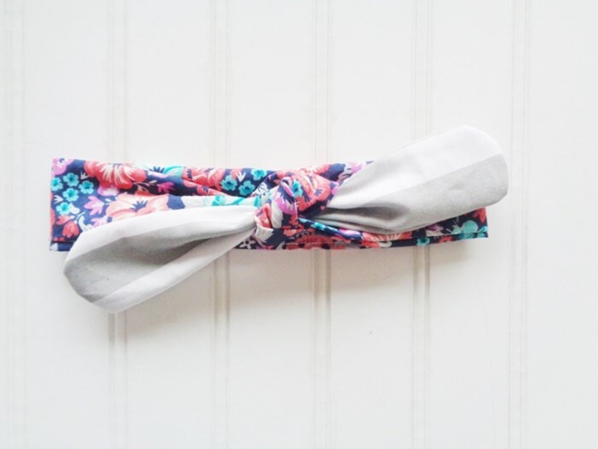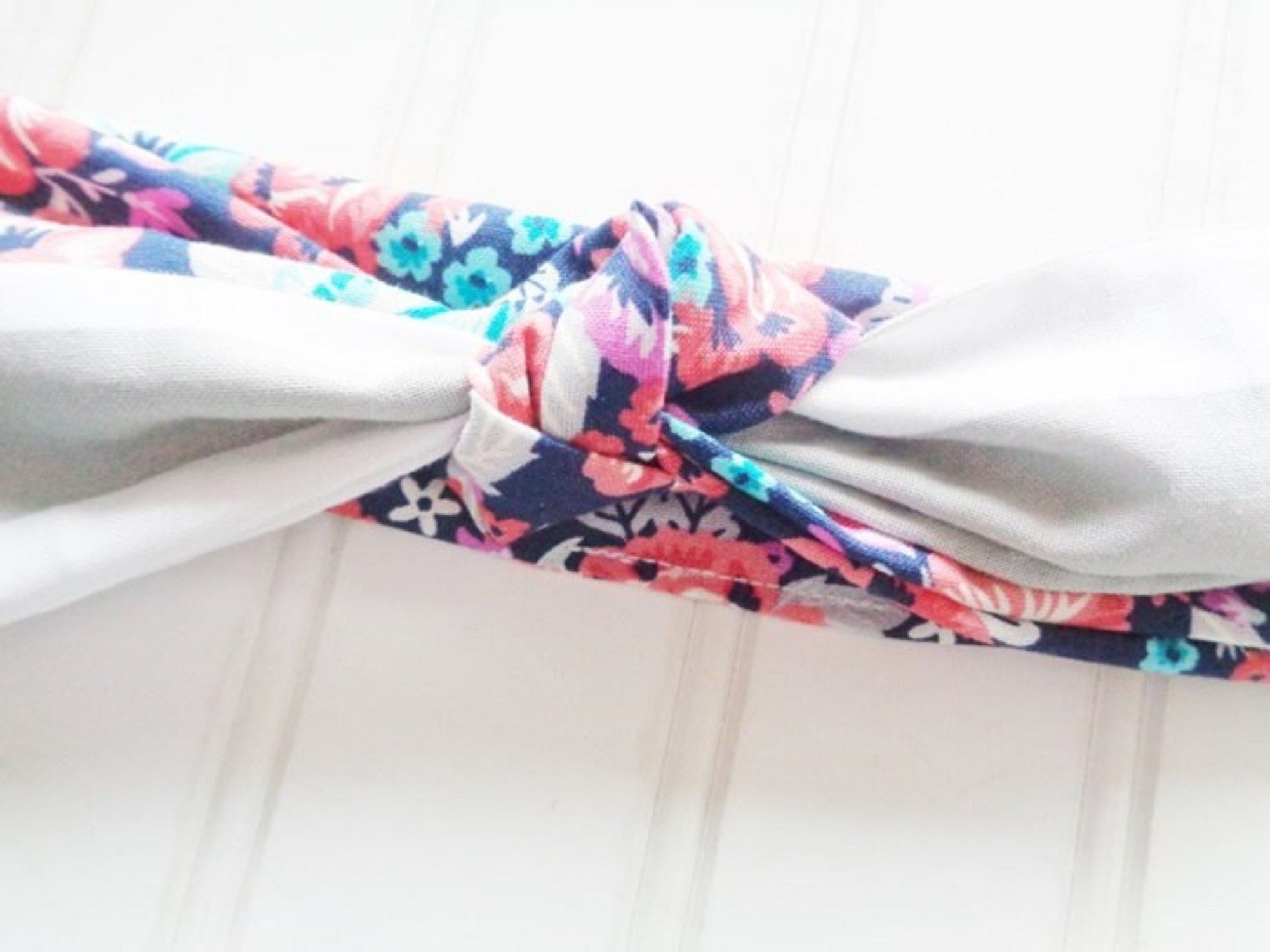 Sarah Knotted Headband - Floral on Navy with Gray Stripes