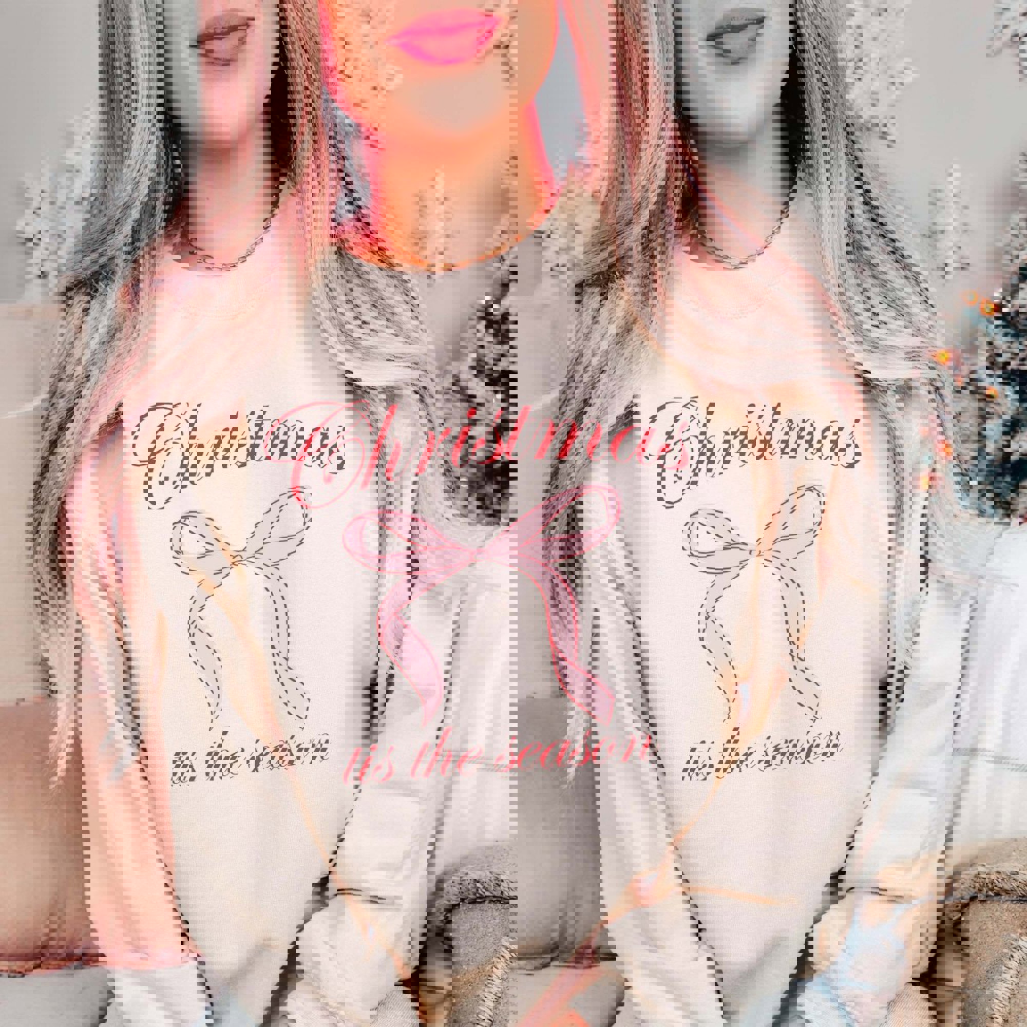 Graphic Sweatshirt A feminine bow and classic script deliver a chic, minimalist Christmas sweatshirt. Unisex crew; White, Sand, Pink, or Ash Grey. Soft fleece for cocoa sipping and tree trimming. Ships in 3-4 business days from Plainfield, IL. Designs printed direct to garment.