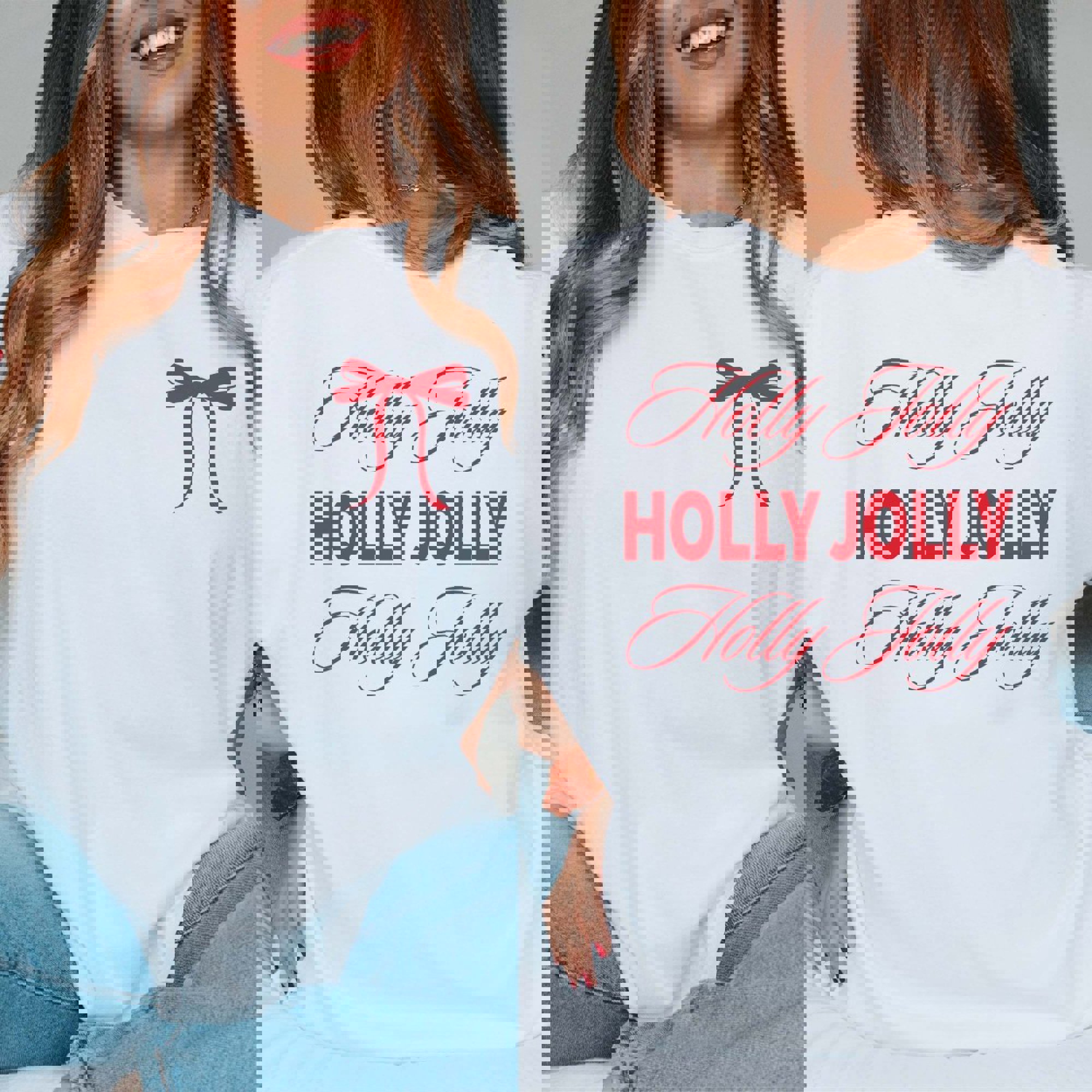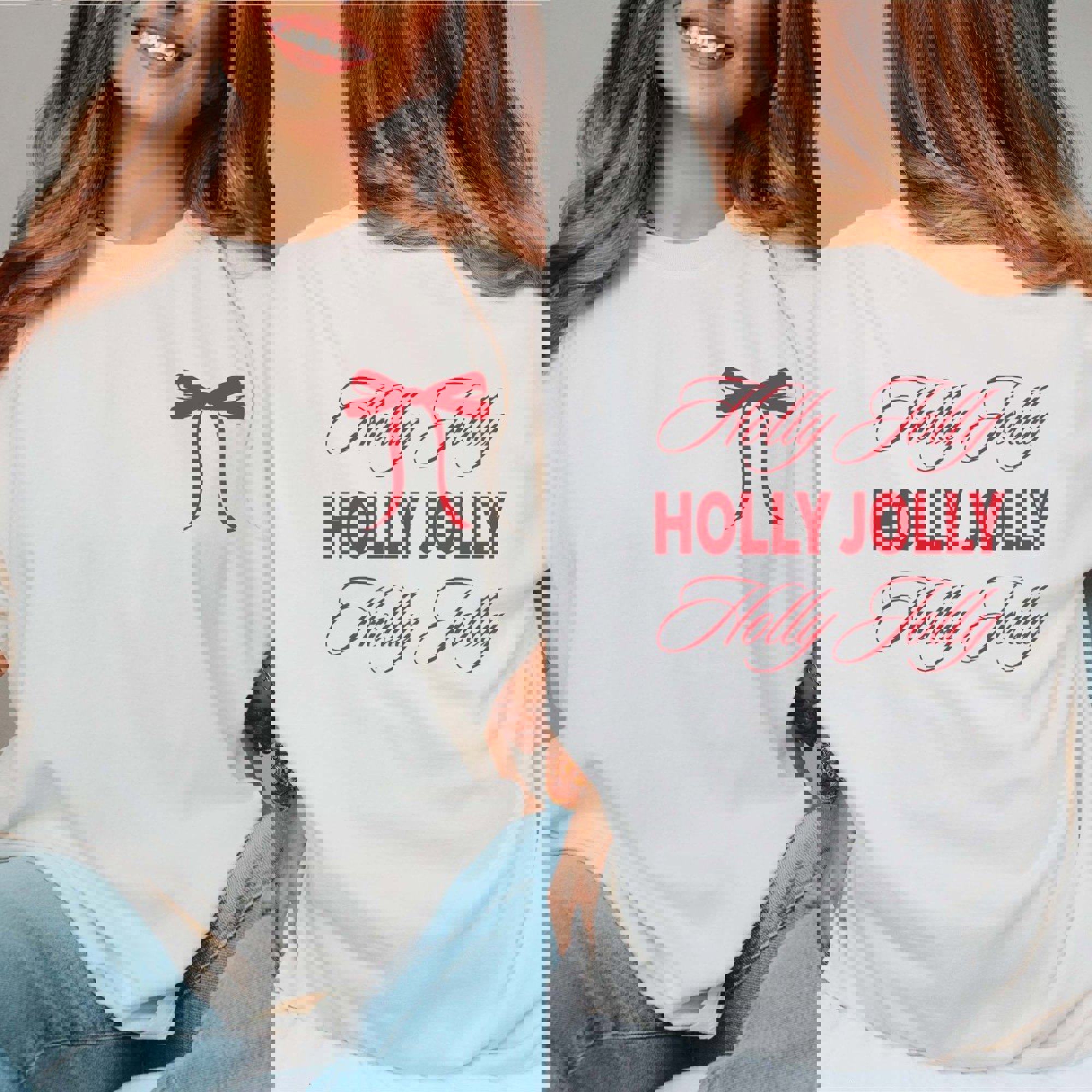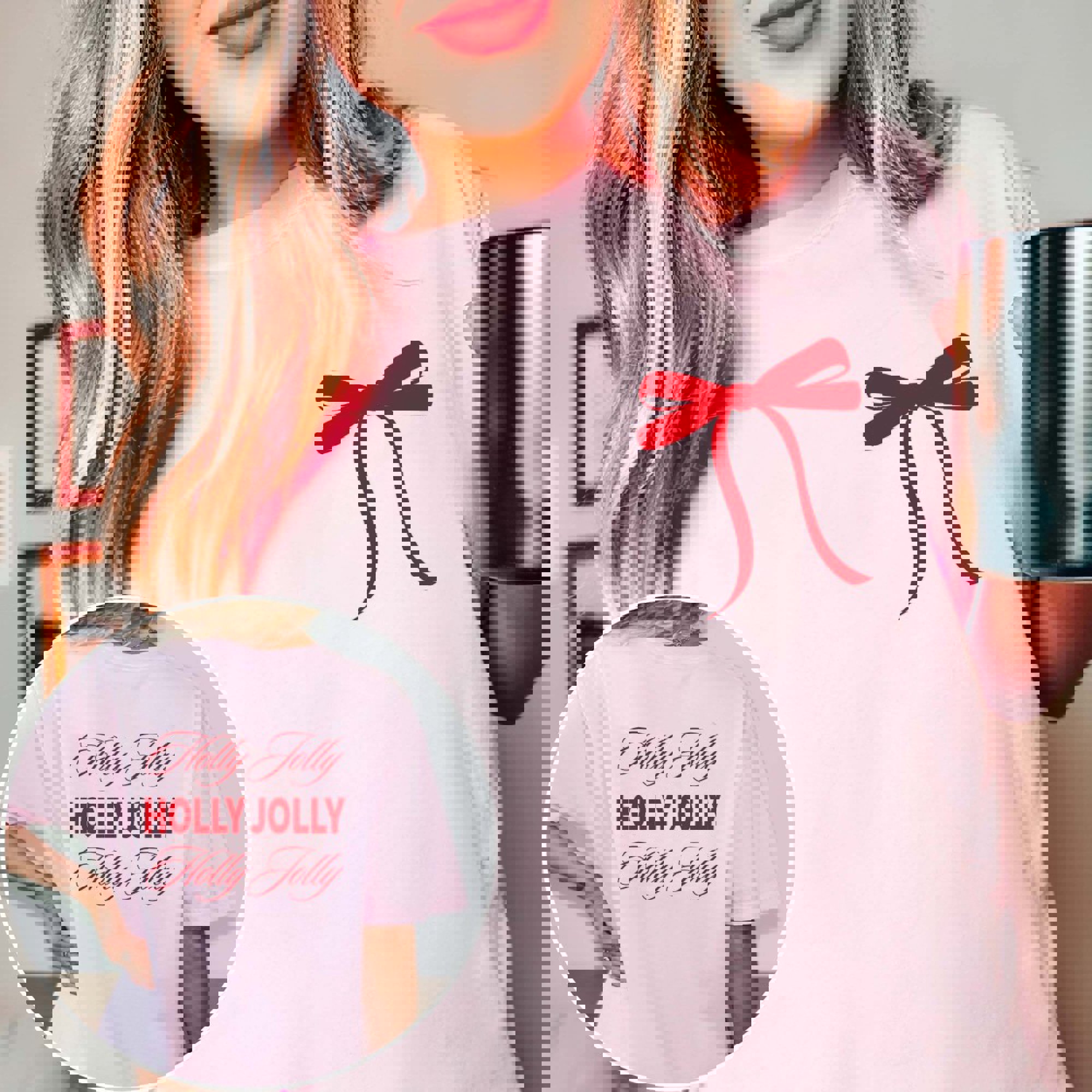 Comfort Colors Tee Minimal bow graphic on the front and bold “Holly Jolly” script on the back. Vintage-wash Comfort Colors fabric with a relaxed unisex fit; Blossom, Ivory, or White. Great for gifting and holiday outings. Ships in 3-4 business days from Plainfield, IL. Designs printed direct to garment.