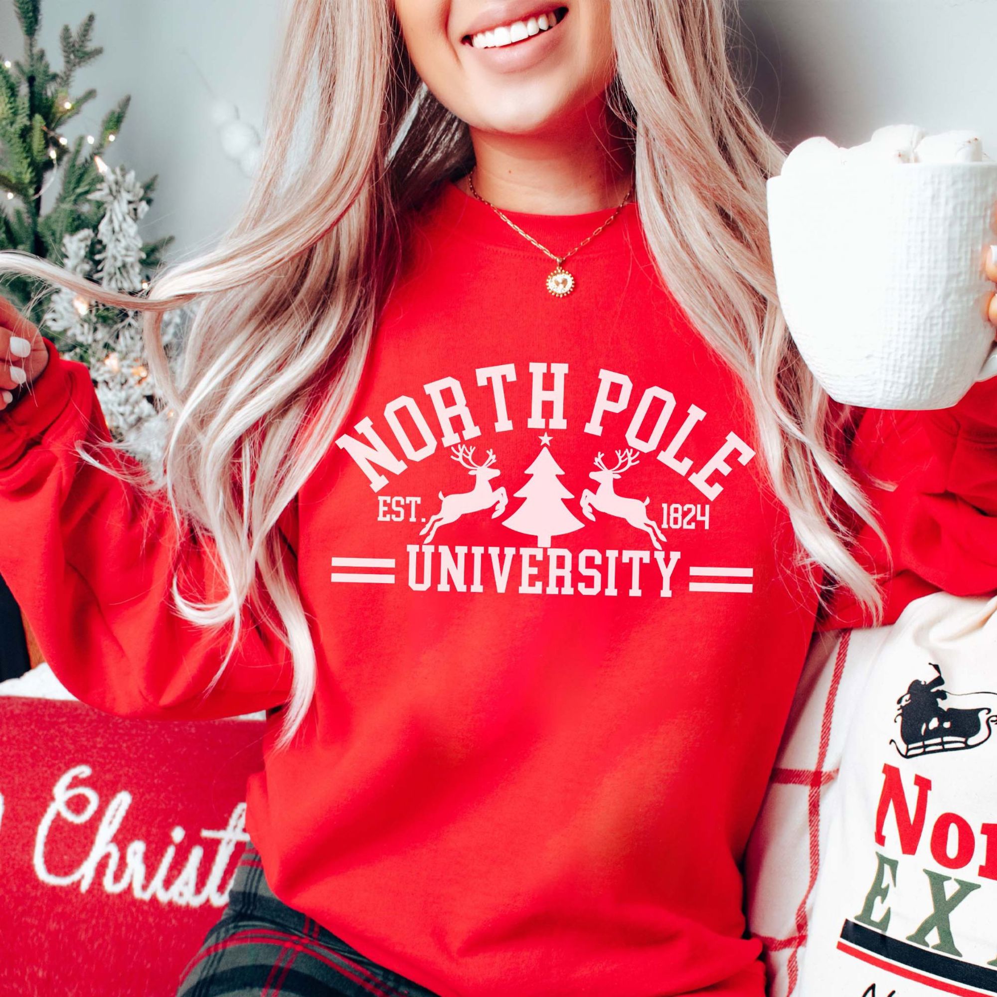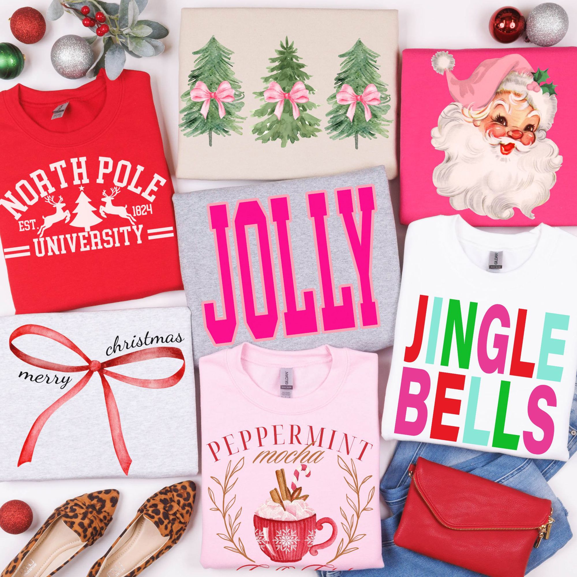 Make spirits bright with our Jingle Bells Christmas Sweatshirt Collection — a merry mix of holiday favorites designed for cozy days, gift exchanges, and festive nights in. From the retro Jolly varsity print to the sweet Peppermint Mocha mug and North Pole University classic, these boutique-style sweatshirts bring cheer, comfort, and style to every moment of the season. With soft, premium fabric and colorful, high-quality prints, they’re perfect for decking your racks or gifting under the tree.