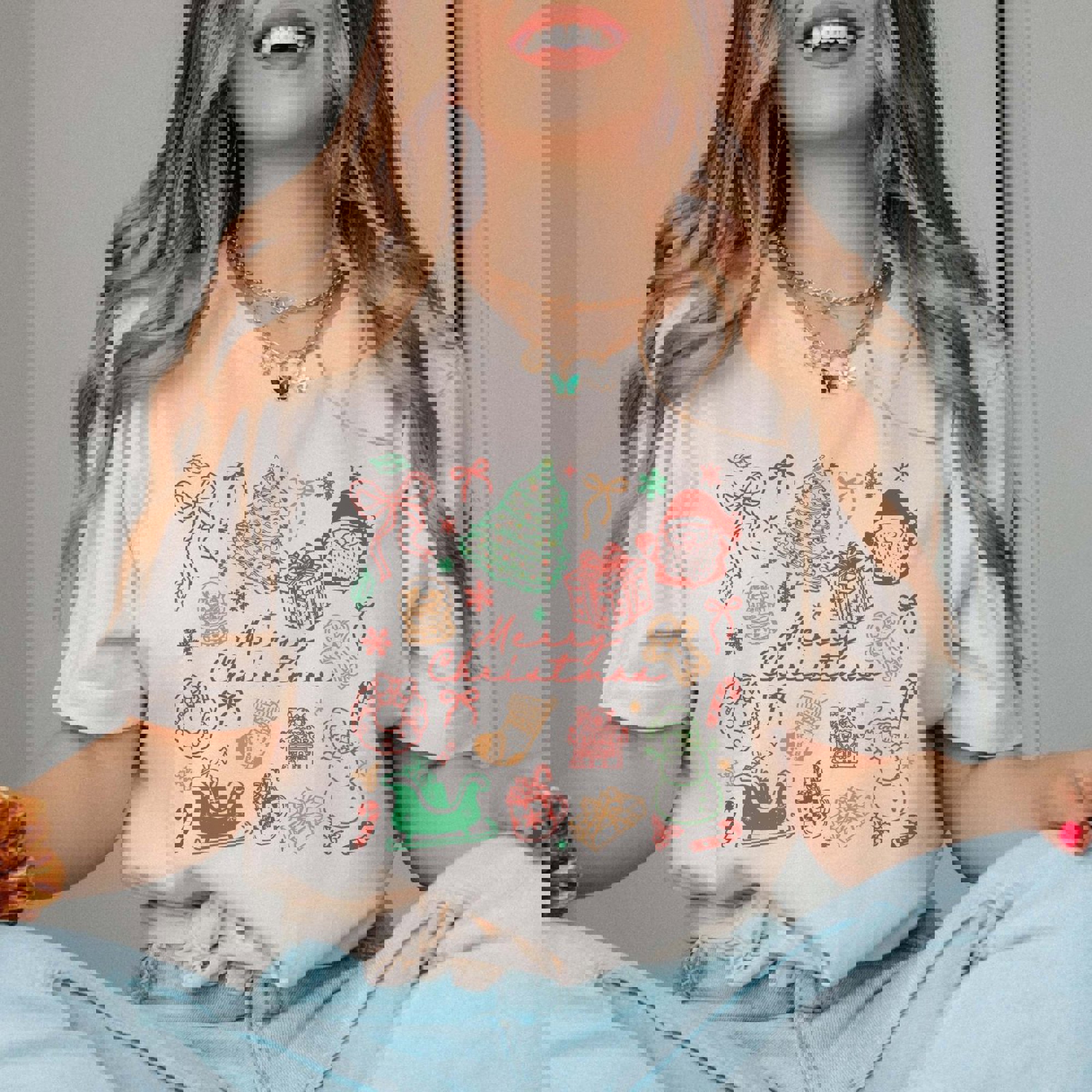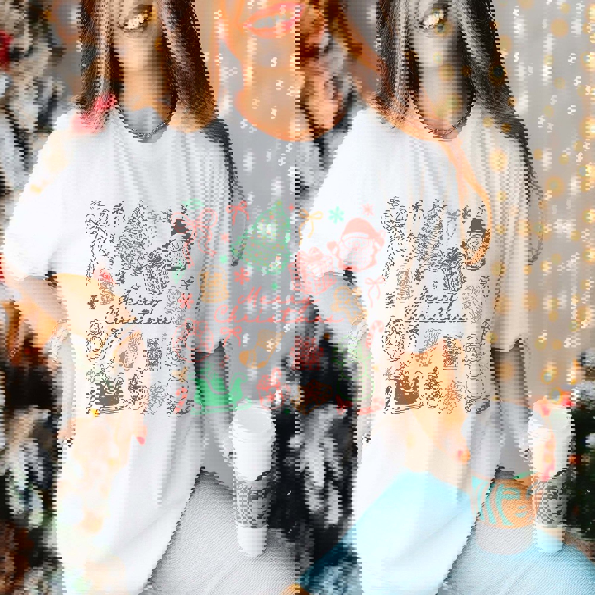 Bella Graphic Tee All your holiday icons in one playful collage: Santa, stockings, cookies, candy canes, and tree. Super-soft Bella + Canvas fabric with a relaxed unisex fit; Natural or White. A festive women’s Christmas graphic T-shirt for everyday wear. Ships in 3-4 business days from Plainfield, IL. Designs printed direct to garment.