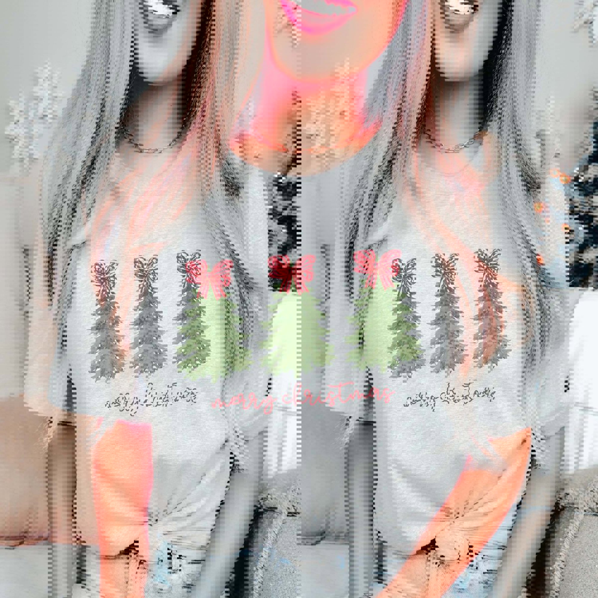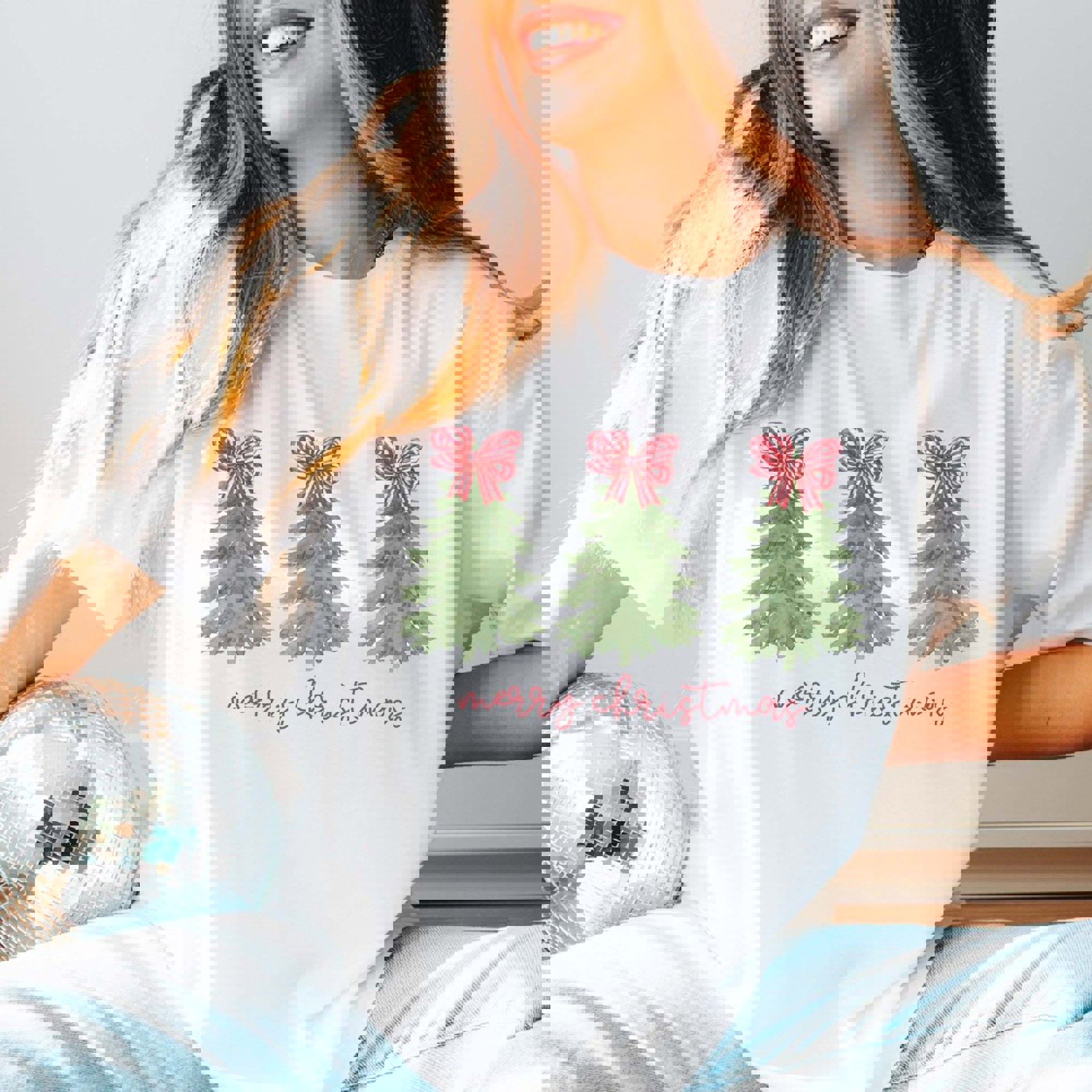 Merry Christmas Trees Red Striped Bows Bella Graphic Tee